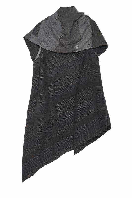 LANDSCAPE FRAYED PATCH KANTHA SLANT HEM HOODED VEST - lf2212-gry -