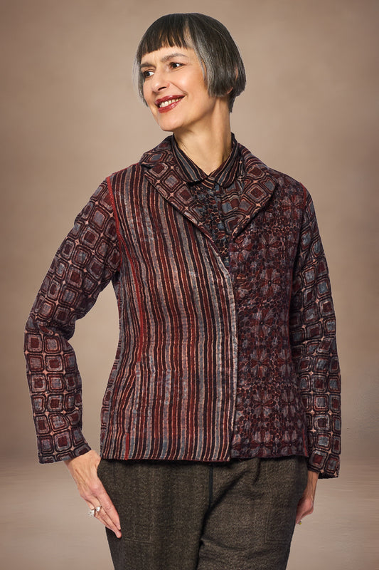 AJRAKH PRINT AND SILK COTTON PATCH KANTHA A-LINE JACKET - az4003-brn -