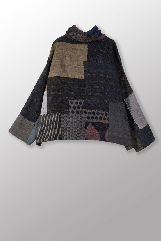 FRAYED PATCH MIX KANTHA NEW COWL NECK PONCHO - fm4083-blk -