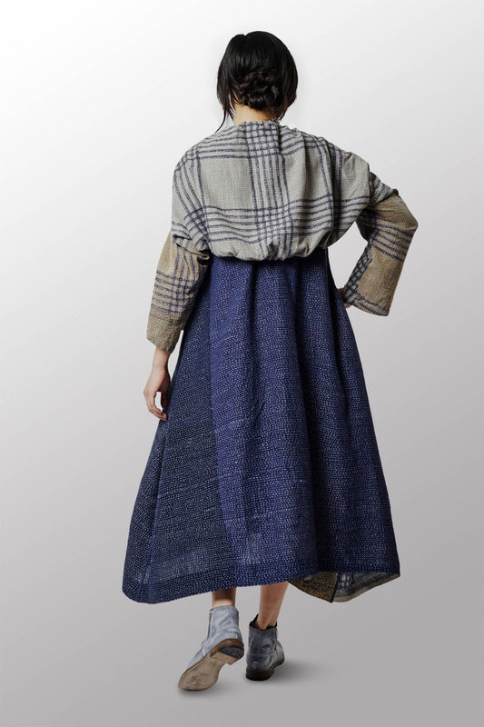 INDONESIAN PRINT VINTAGE INDIGO BACKING KANTHA PUFF SHRUG - bi2076-blu -