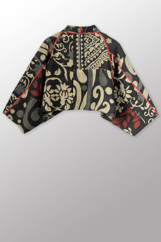 BLACK AND WHITE PRINT PATCH KANTHA CREW NECK SHORT JACKET - pn4053-blk -