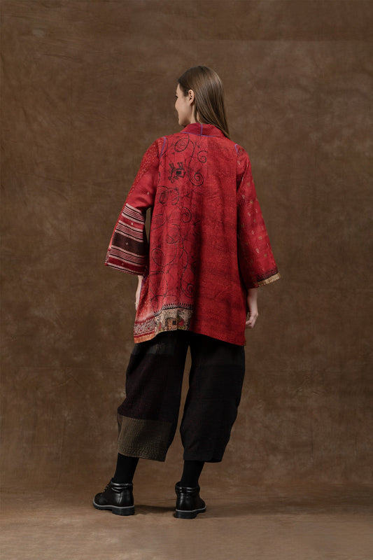 VINTAGE SILK PATCH KANTHA A-LINE JKT - vp2003-red -
