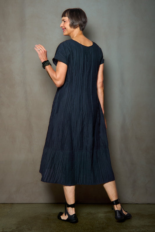 RIPPLE TUCK SOLID V-NECK SHAPED MIDI DRESS - trs1465-blk -