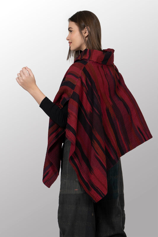 IKAT STRIPE KANTHA COWL NECK LONG CAPE - is4842-drd -