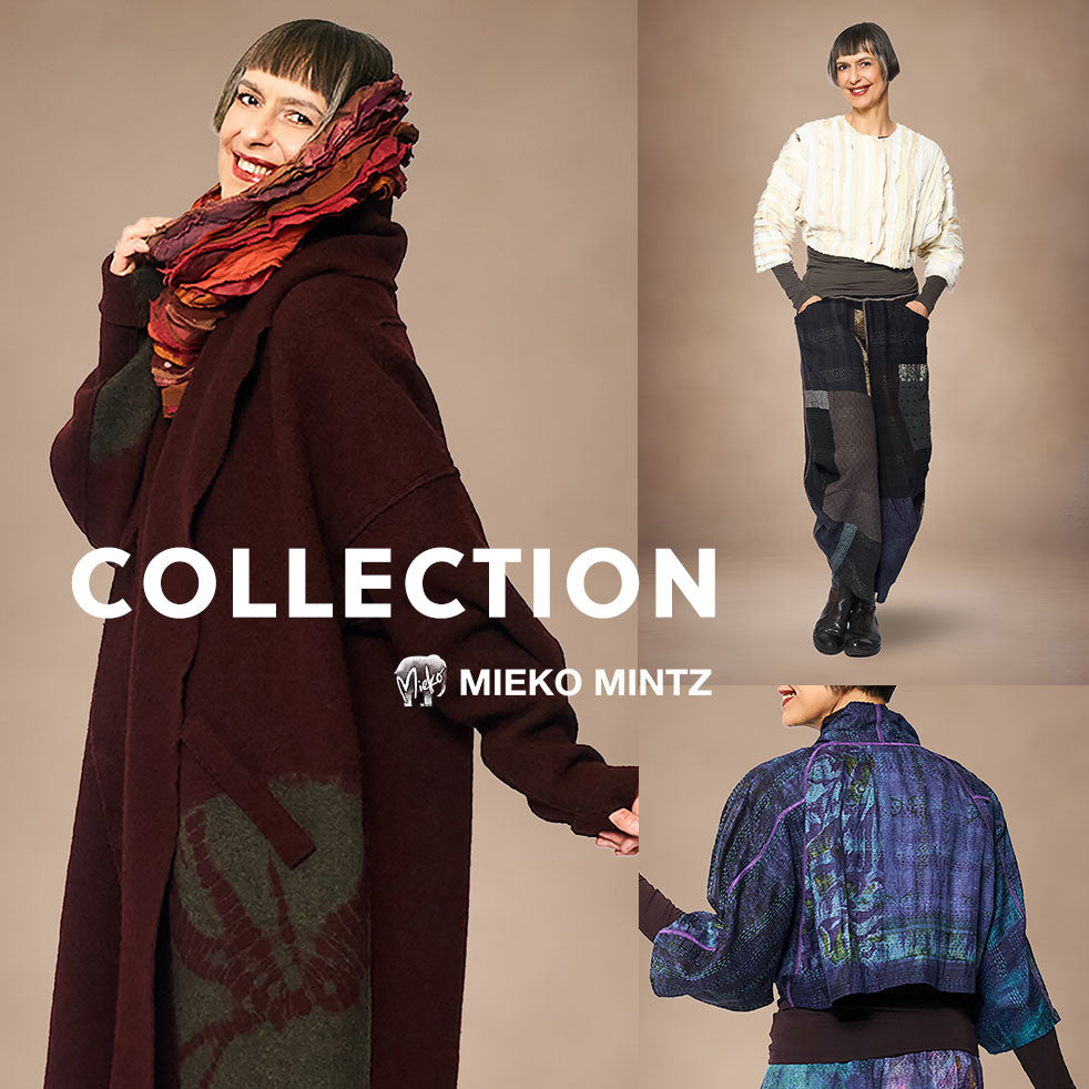 Mieko has also been involved with the creation of new original print designs. She is strongly attracted to the sense of color and pattern that developed in Japanese kimono culture. She is also fascinated by the simple hand-stitching (kantha) that has evolved over hundreds of years in India. She has found that these two traditions perfectly complement each other. Her quest to merge these fashion cultures in her clothing design has culminated in these new collections.