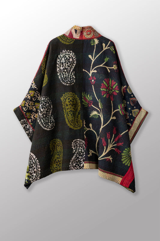 PUZZLE KANTHA DOUBLE COLLAR PONCHO - pz4323-grn -