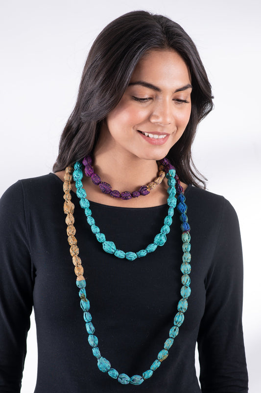 JACQUARD SILK KANTHA TIE-BEADS LONG NECKLACE - js2707-tel -