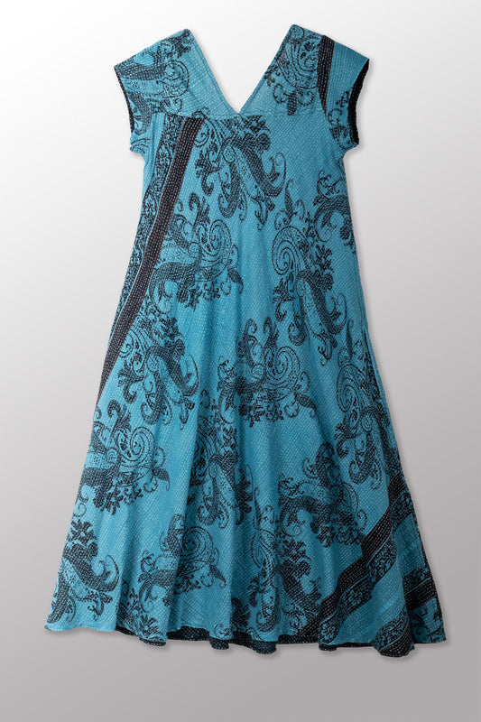 OVERDYED COTTON PAISLEY KANTHA CAP SLV. FLARE DRESS - ov-cp2425-blu -