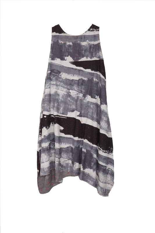 PLANK PRINT KANTHA POINTY HEM DRESS - lb2415-gry -