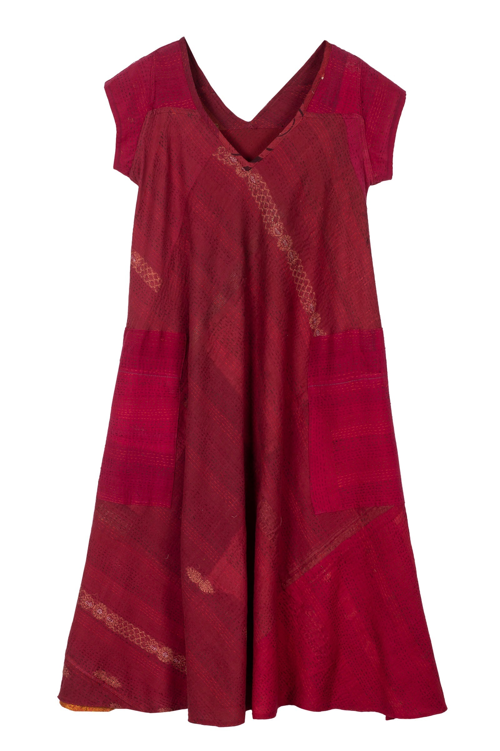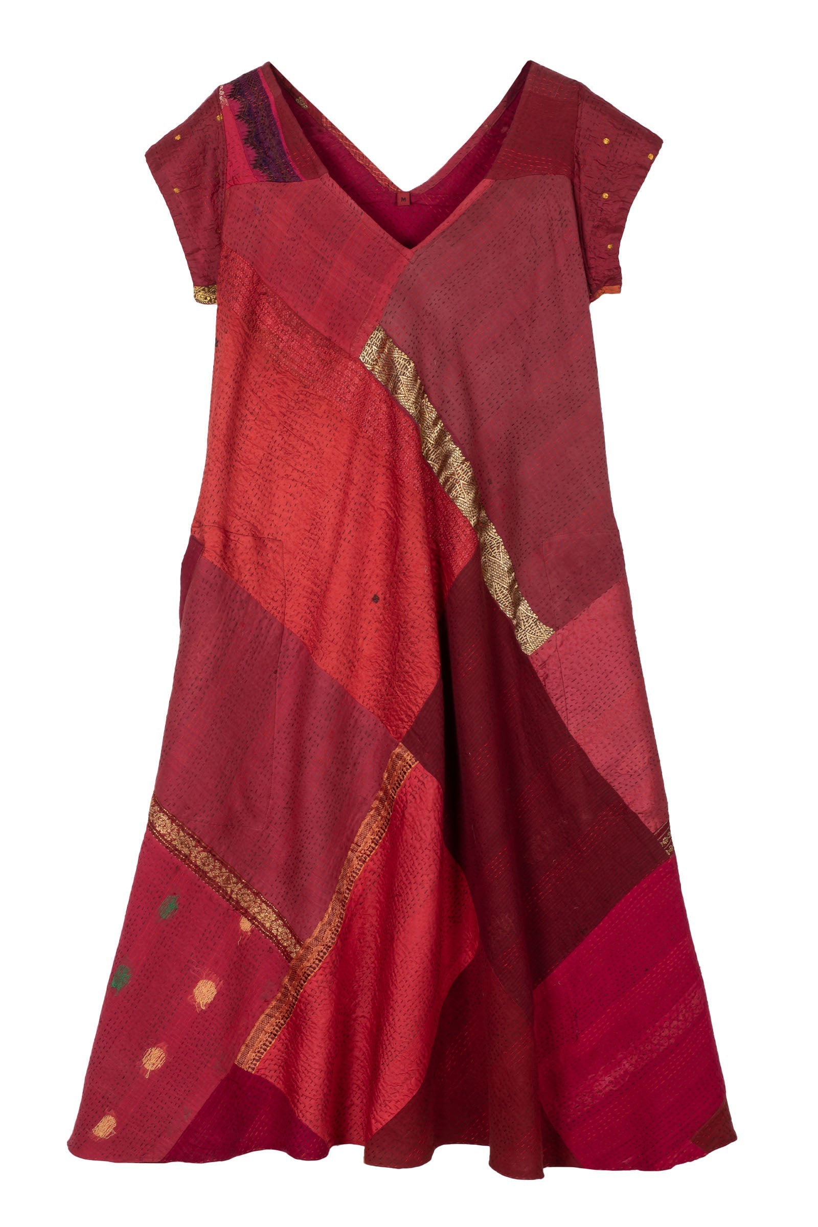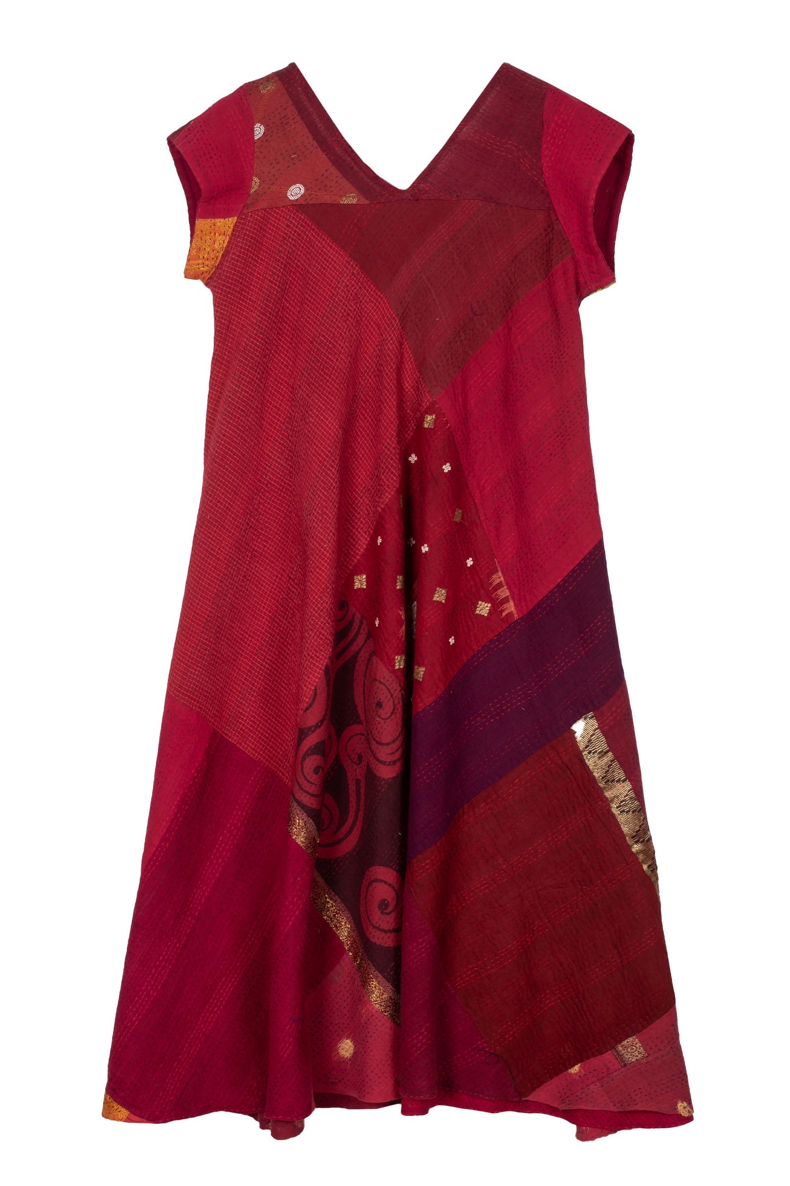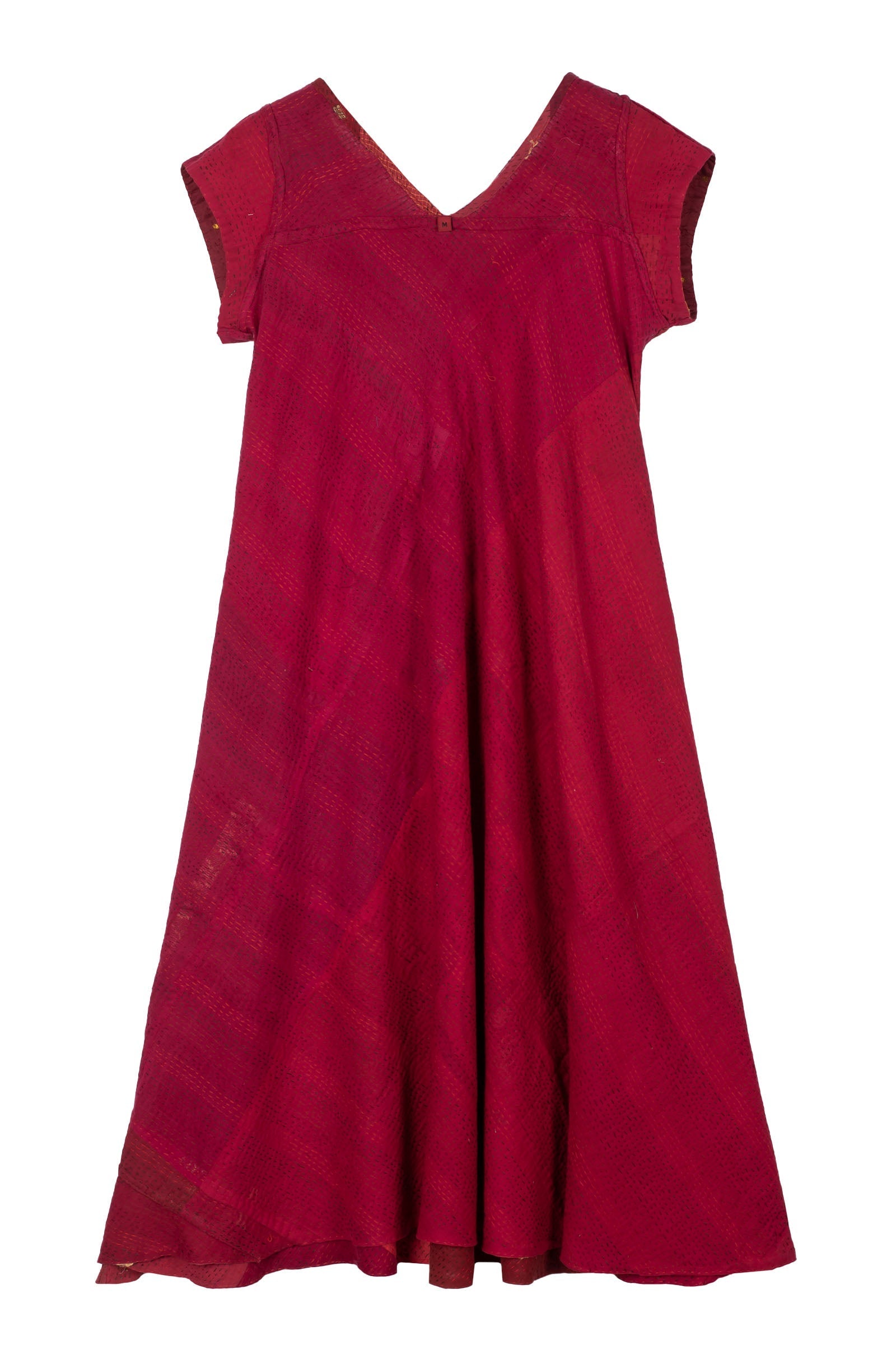 COTTON SILK SW PATCH KANTHA CAP SLV. FLARE DRESS - ws2425-red -
