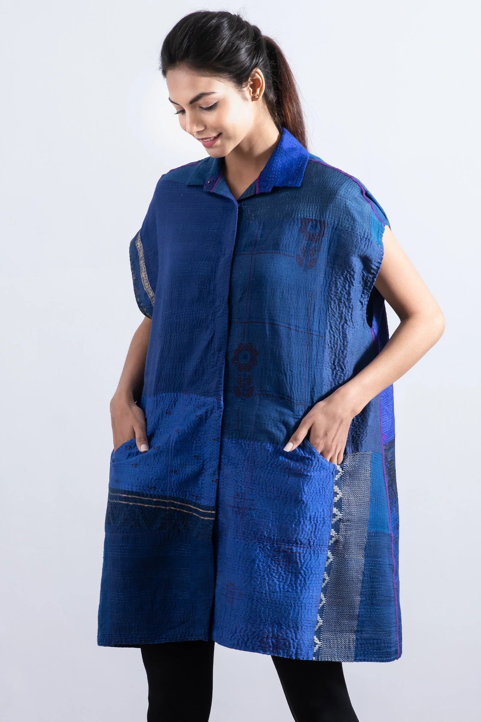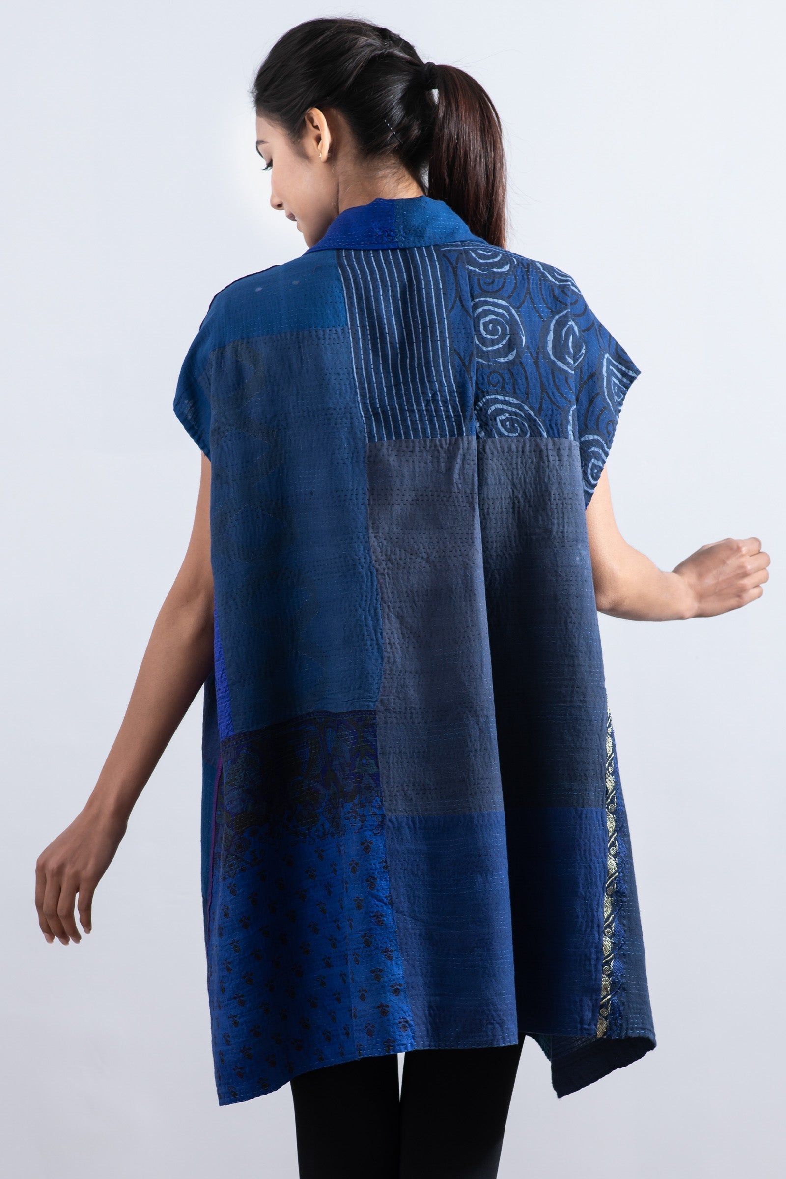 COTTON SILK SW PATCH KANTHA SHIRT DRESS - ws2426-blu -