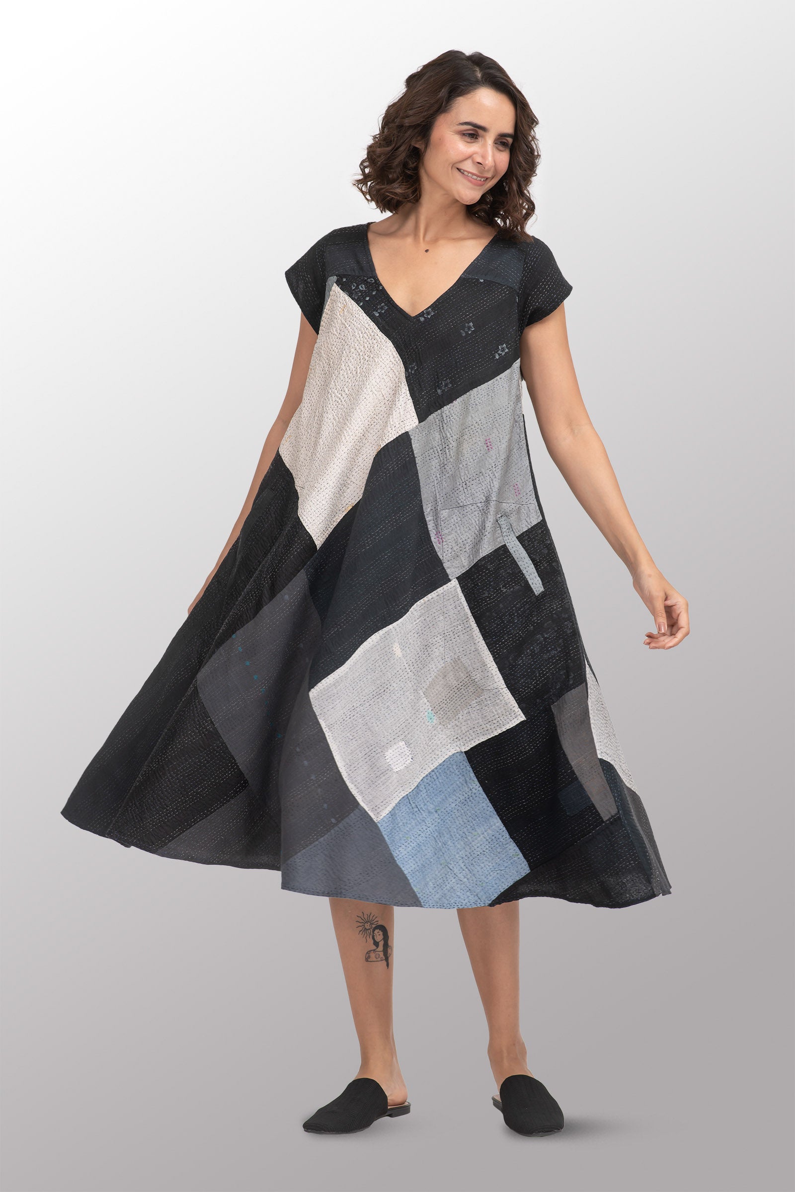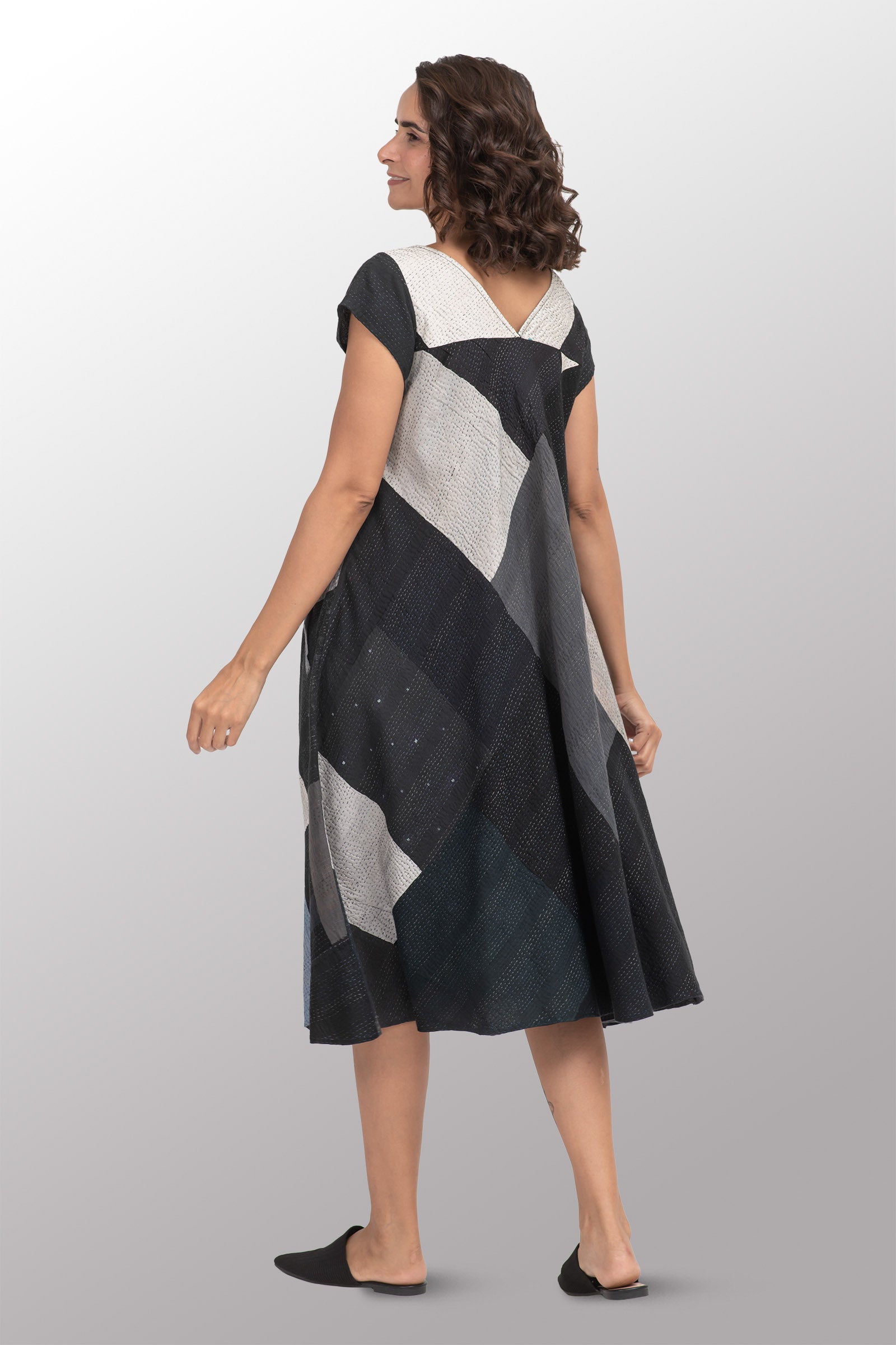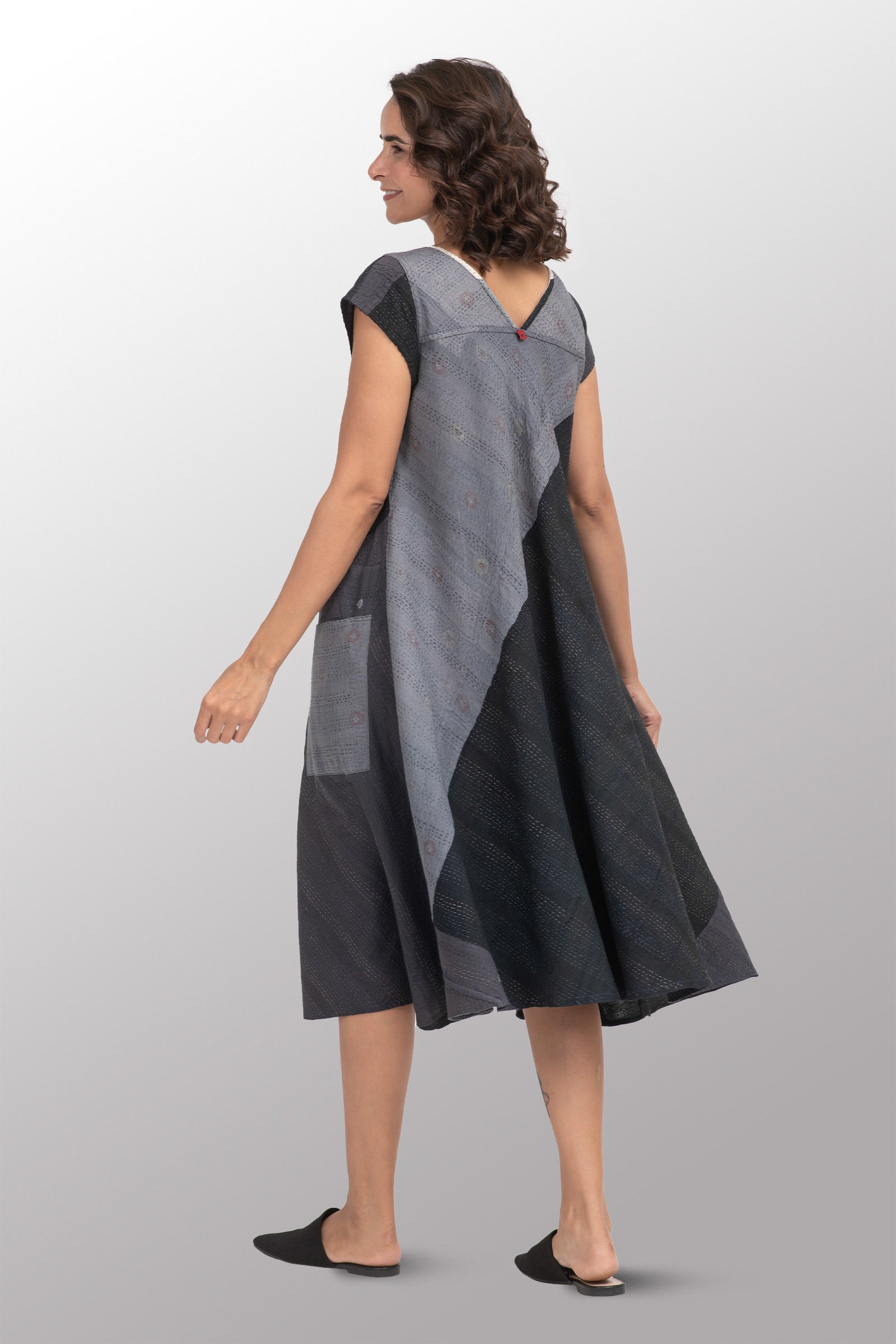 COTTON SILK SW PATCH OMBRE KANTHA CAP SLV. FLARE DRESS - wo2425-blk -