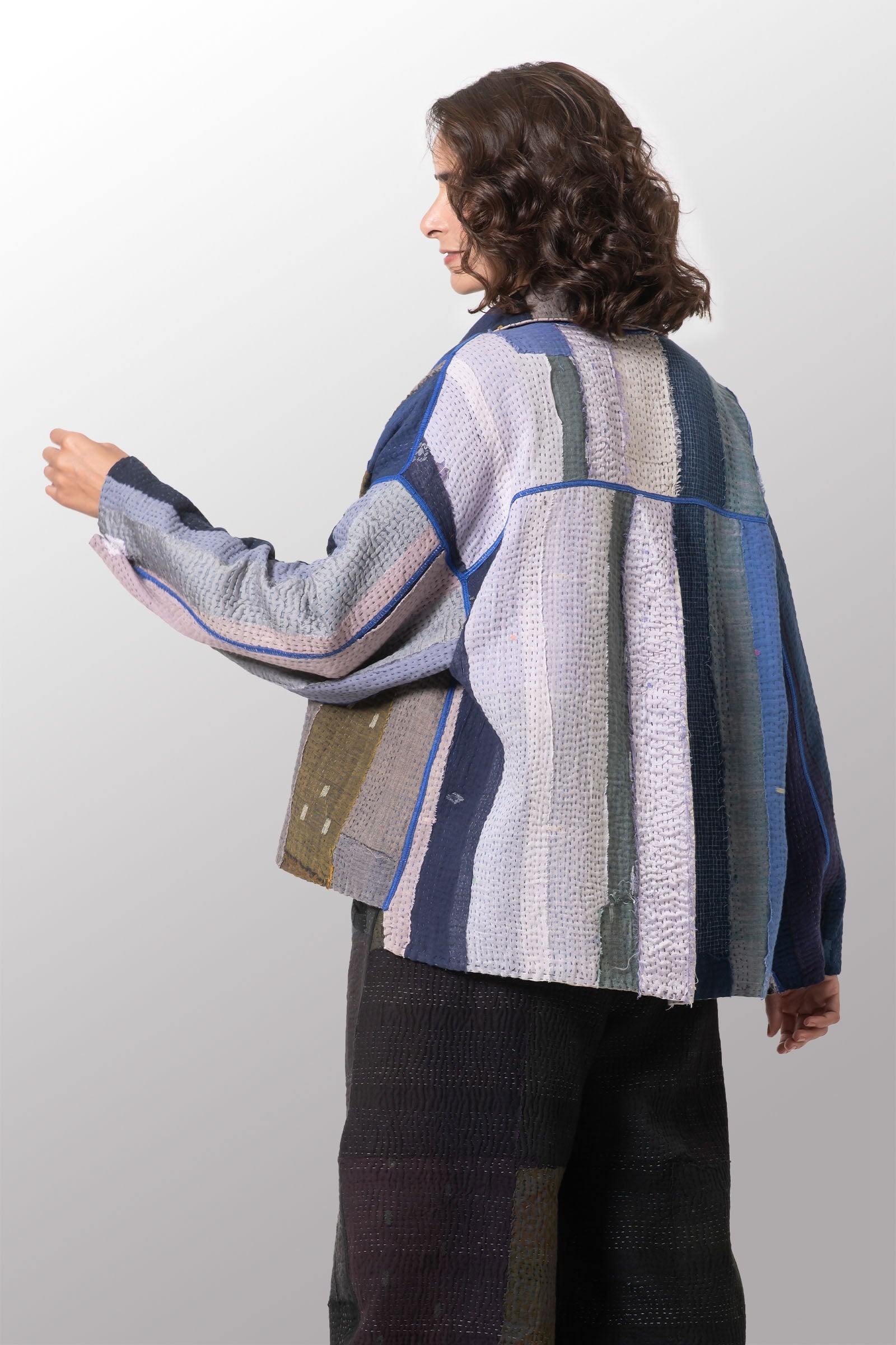 COTTON STRIPE PATCH KANTHA CROPPED SHIRT JACKET - cs4075-blu -