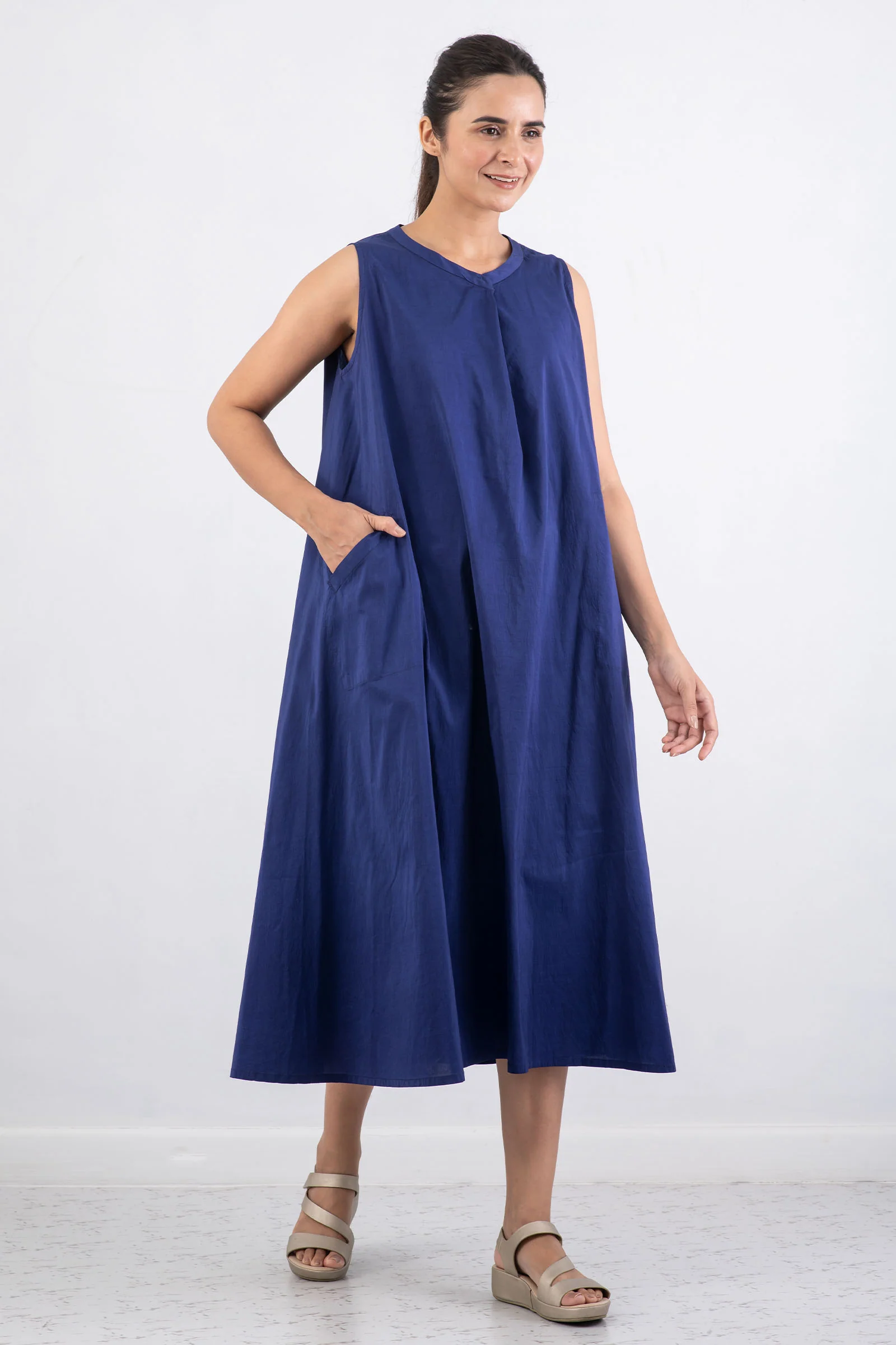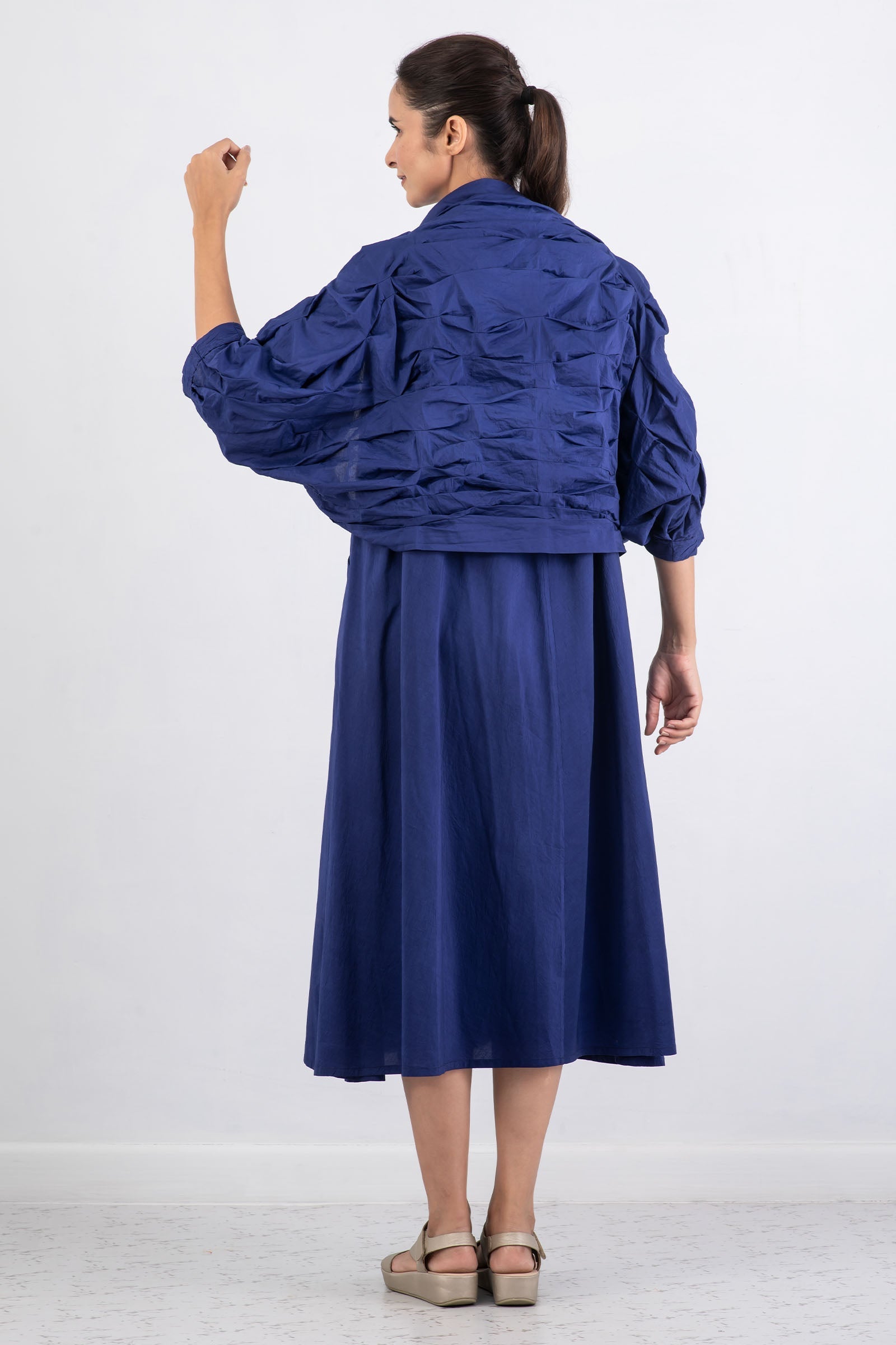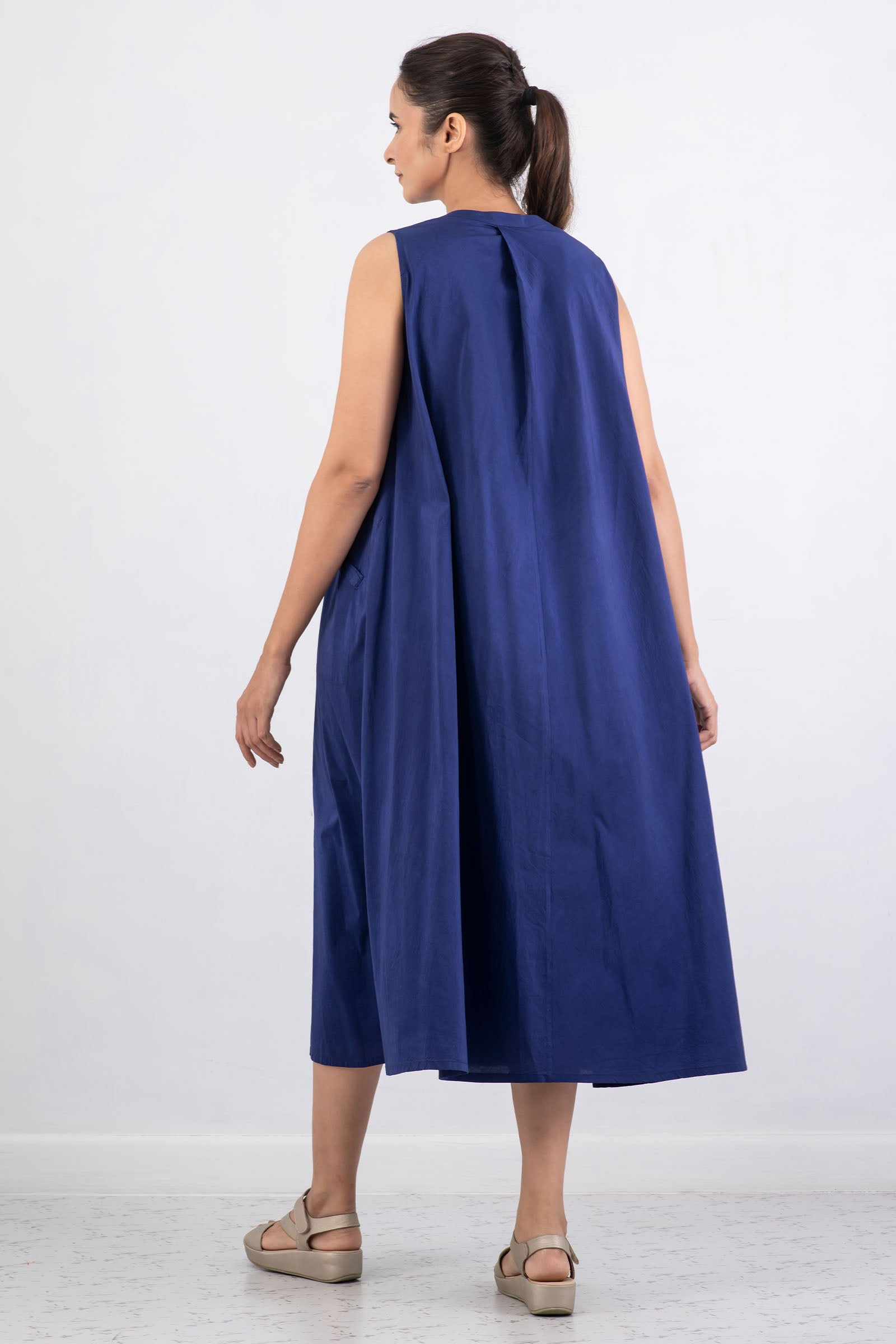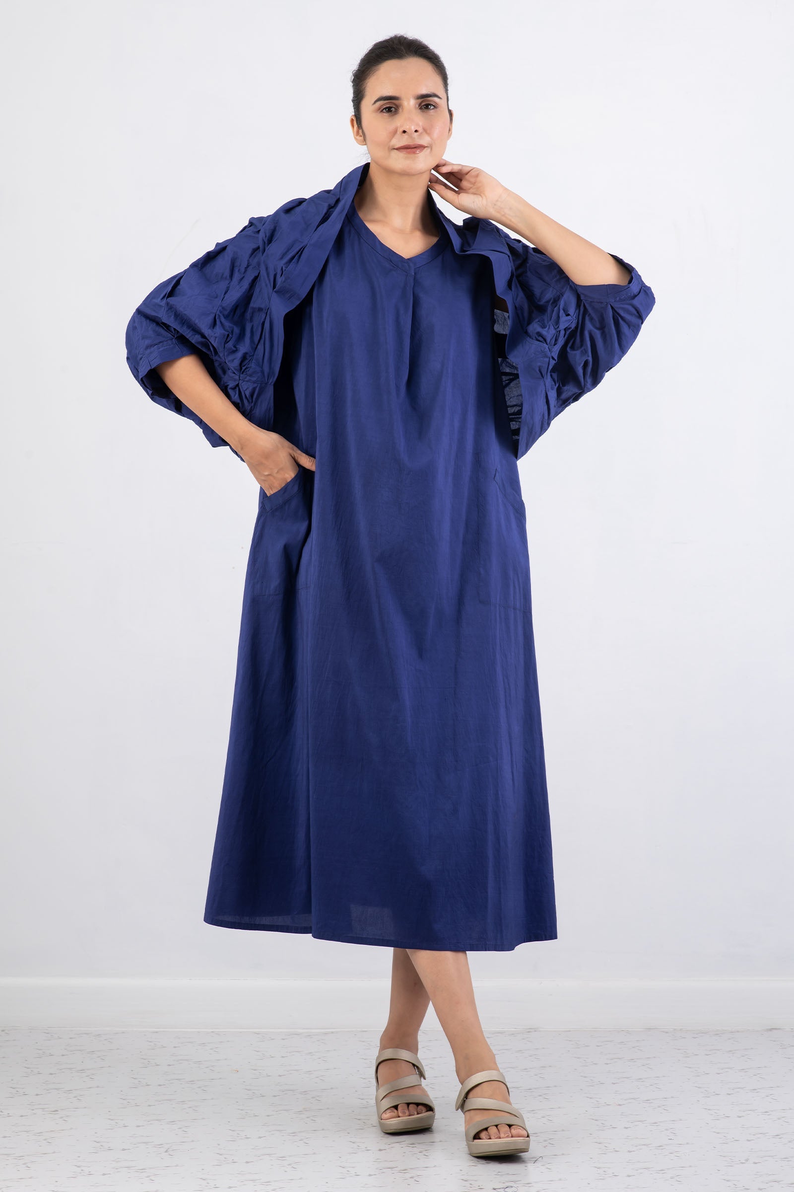 DYED COTTON SILK HEAVY VOILE WAVY BAND COLLAR MAXI DRESS - dh1439-blu -