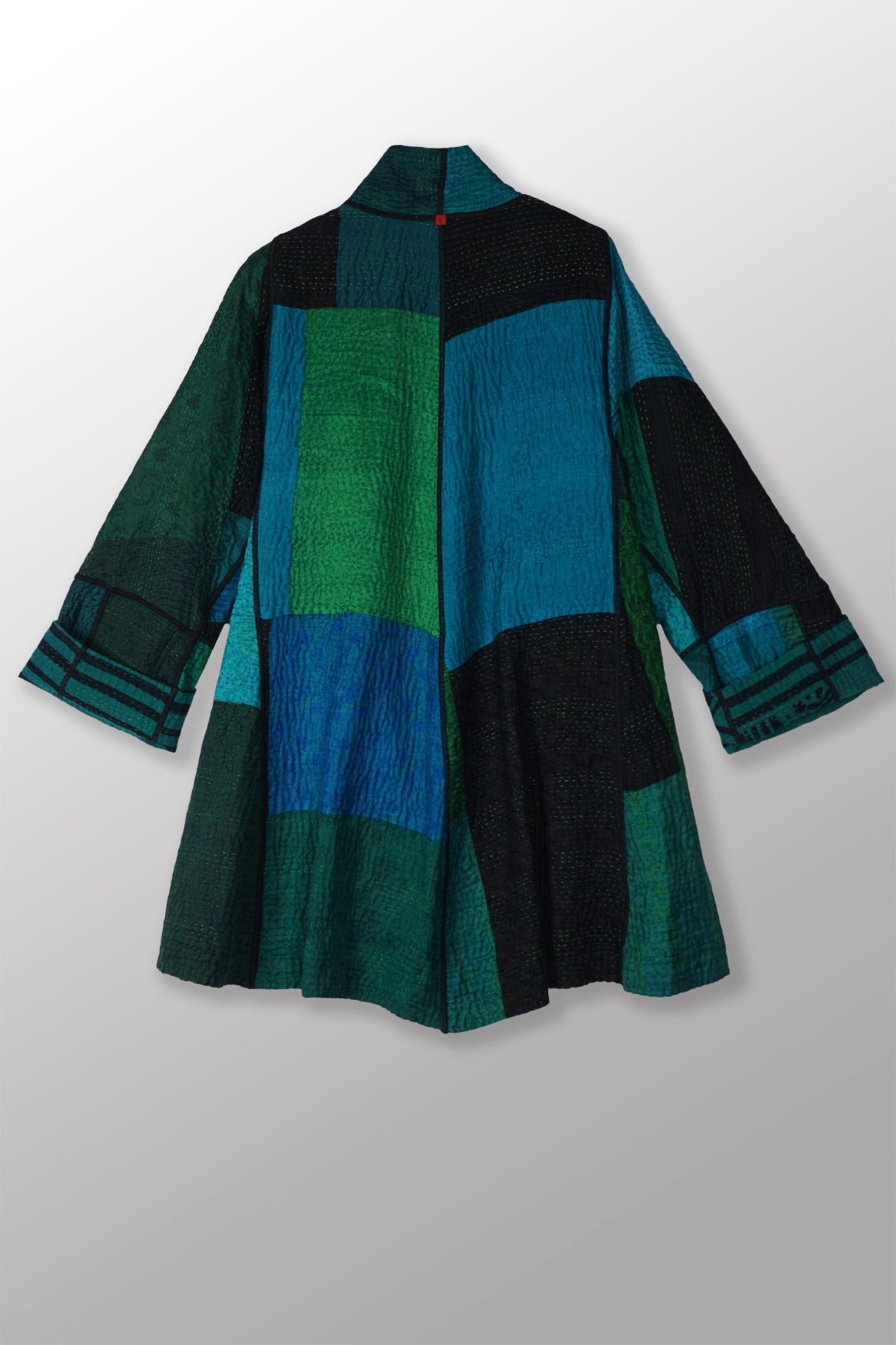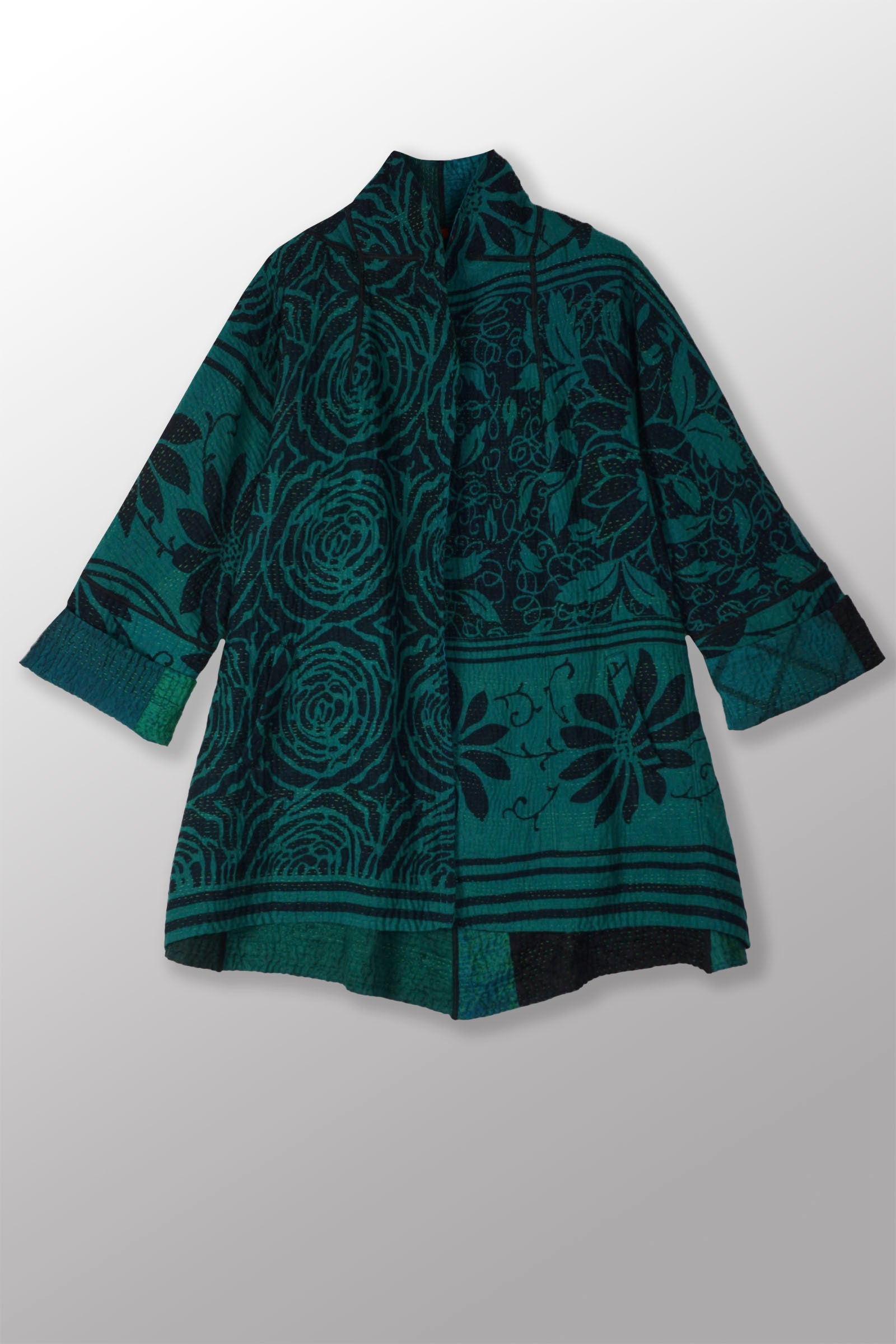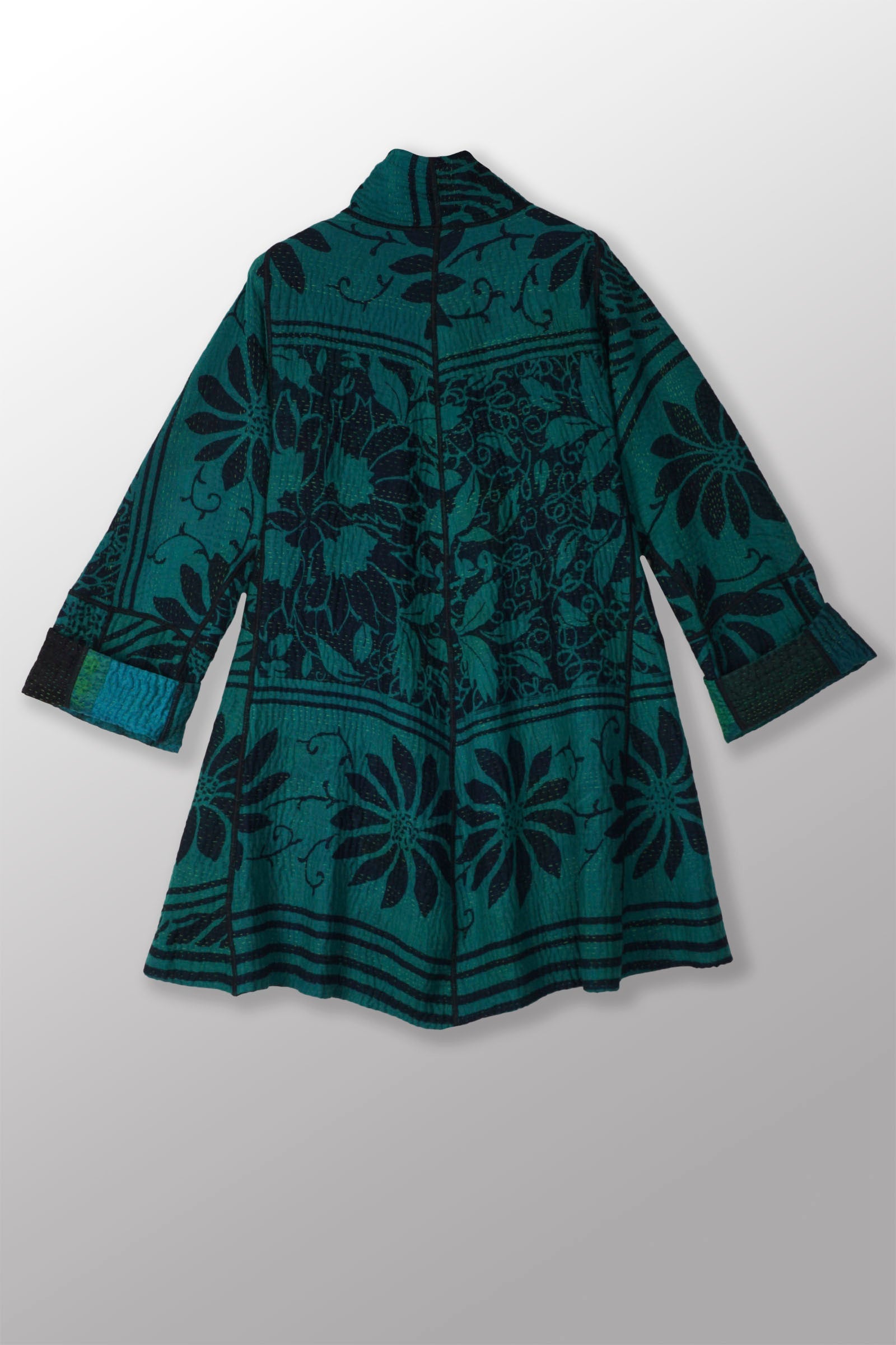 EMERALD GREEN KANTHA FLARE LONG JACKET - eg4021-tel -