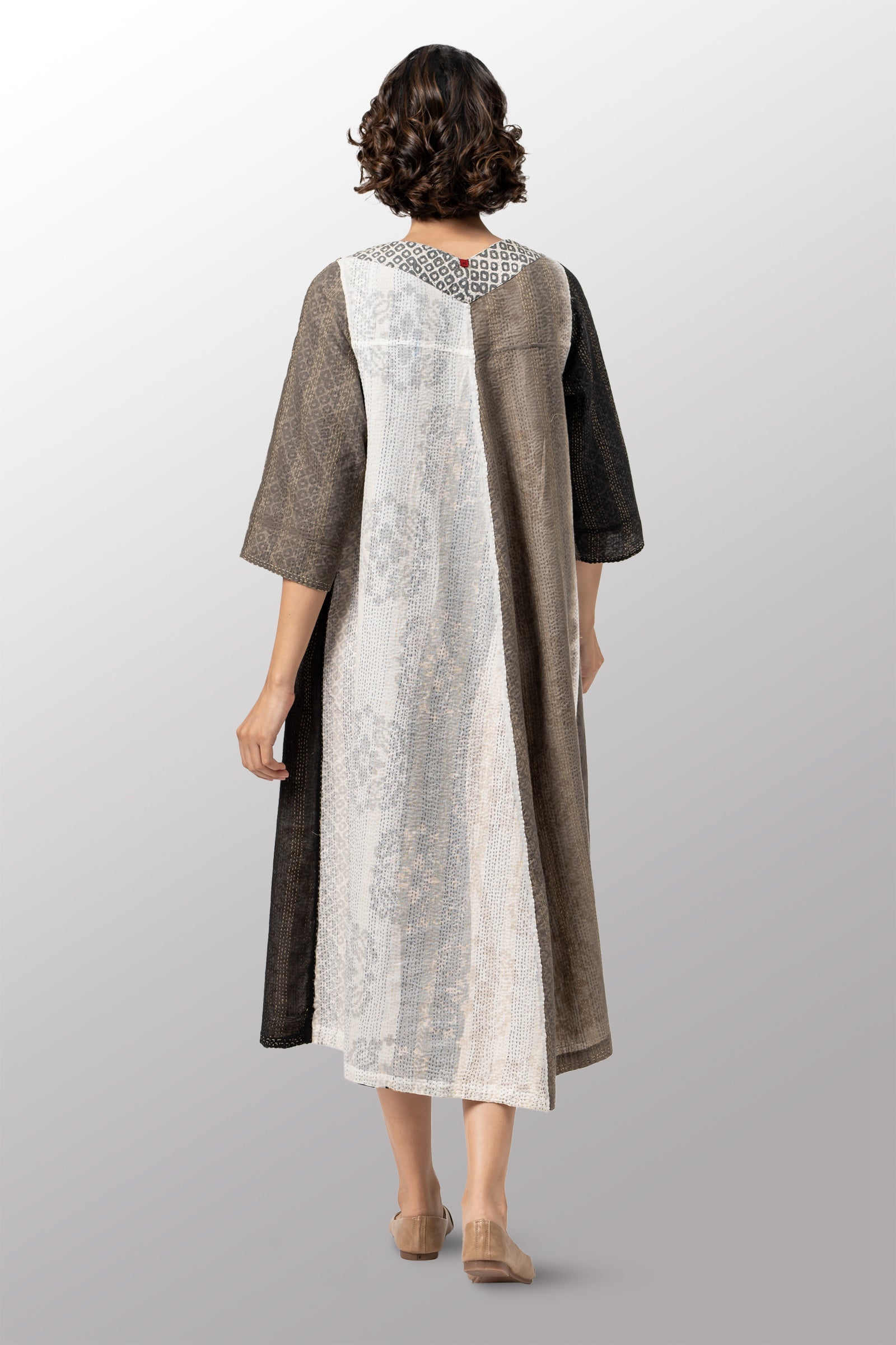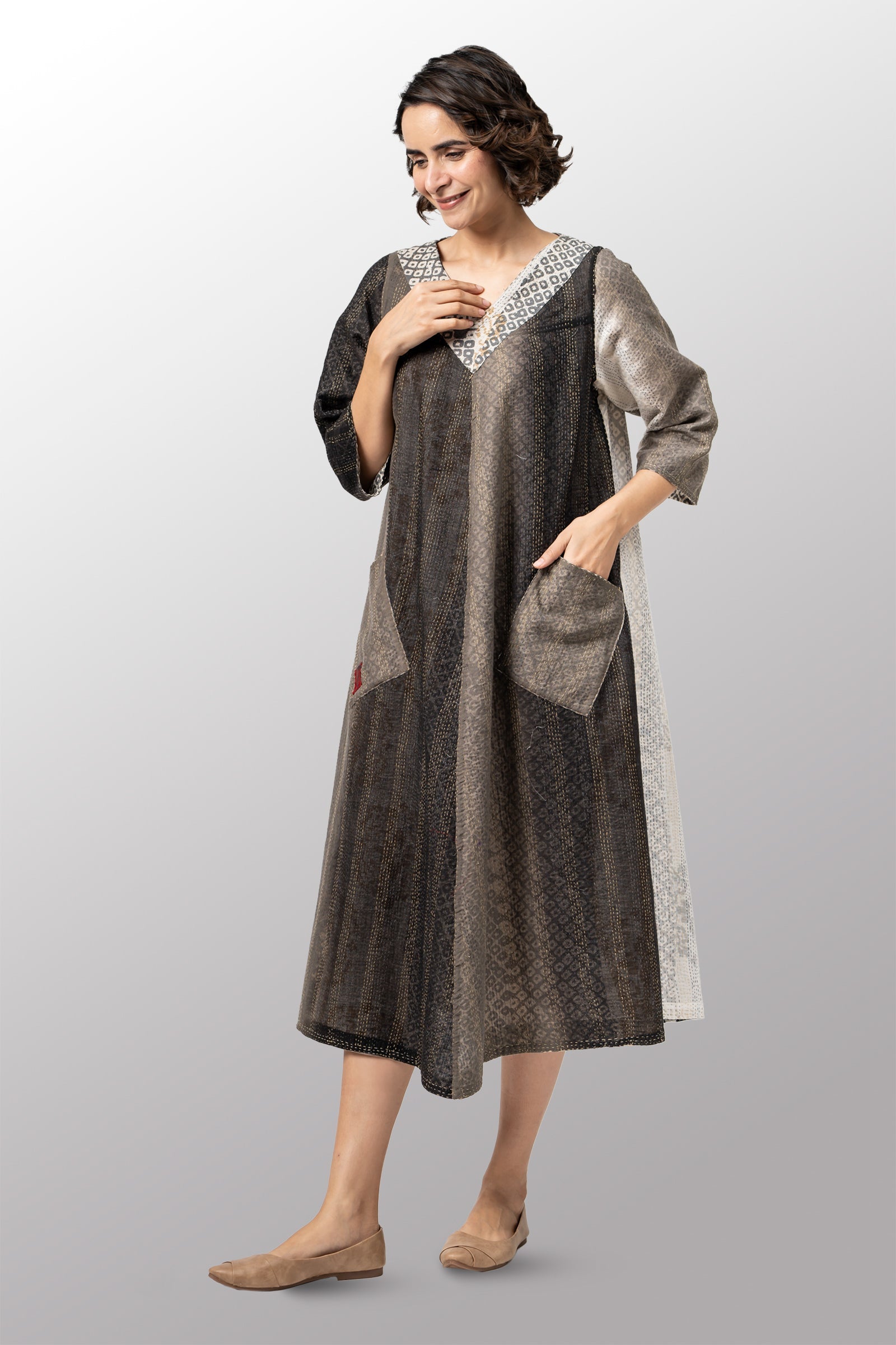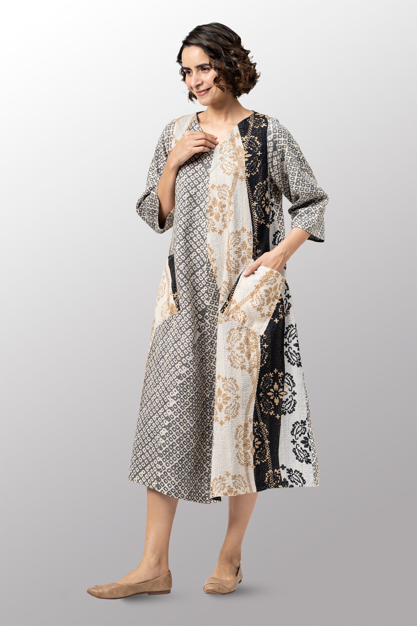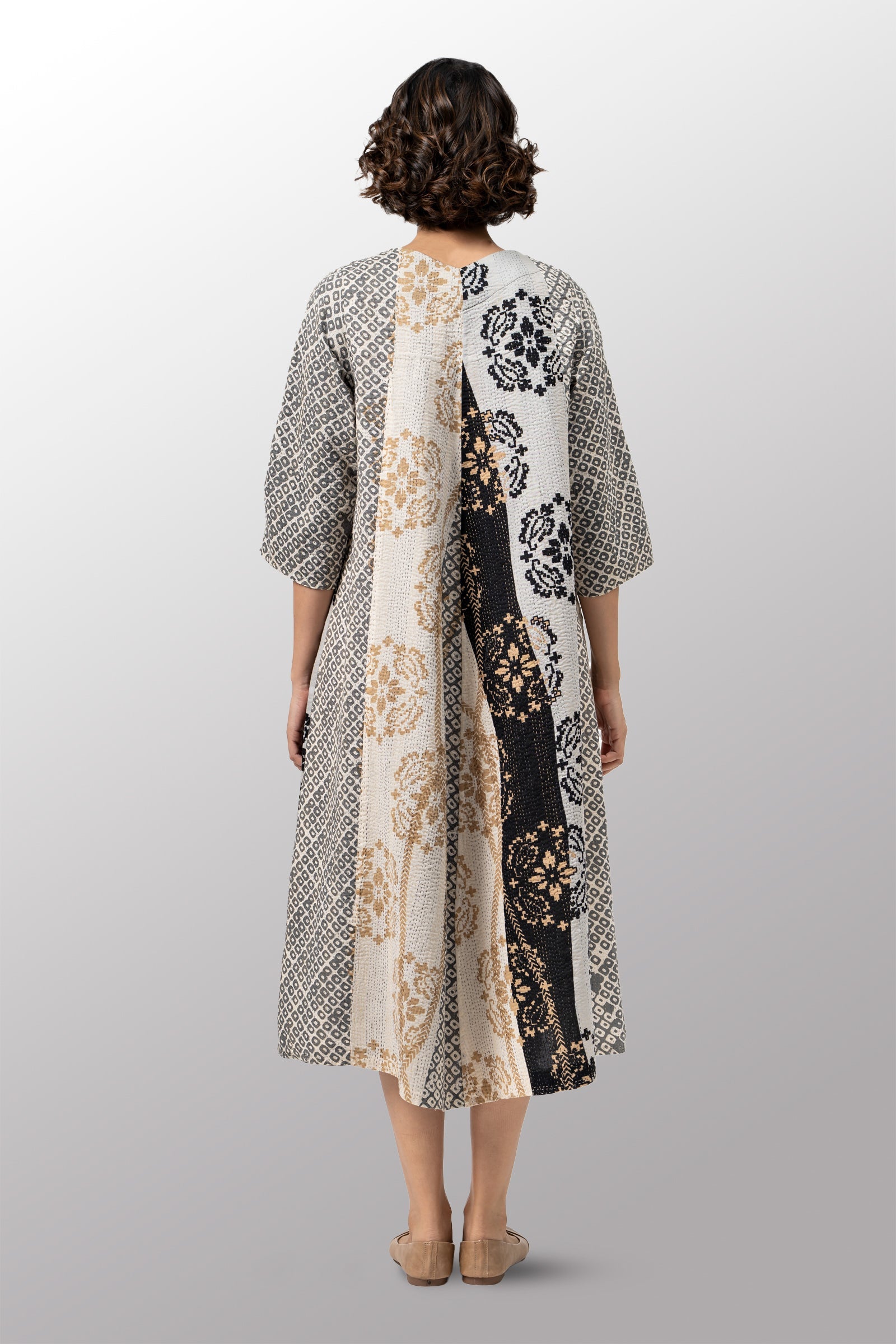 KIMONO COTTON KANTHA V-NECK FLARE DRESS - kc2457-gry -