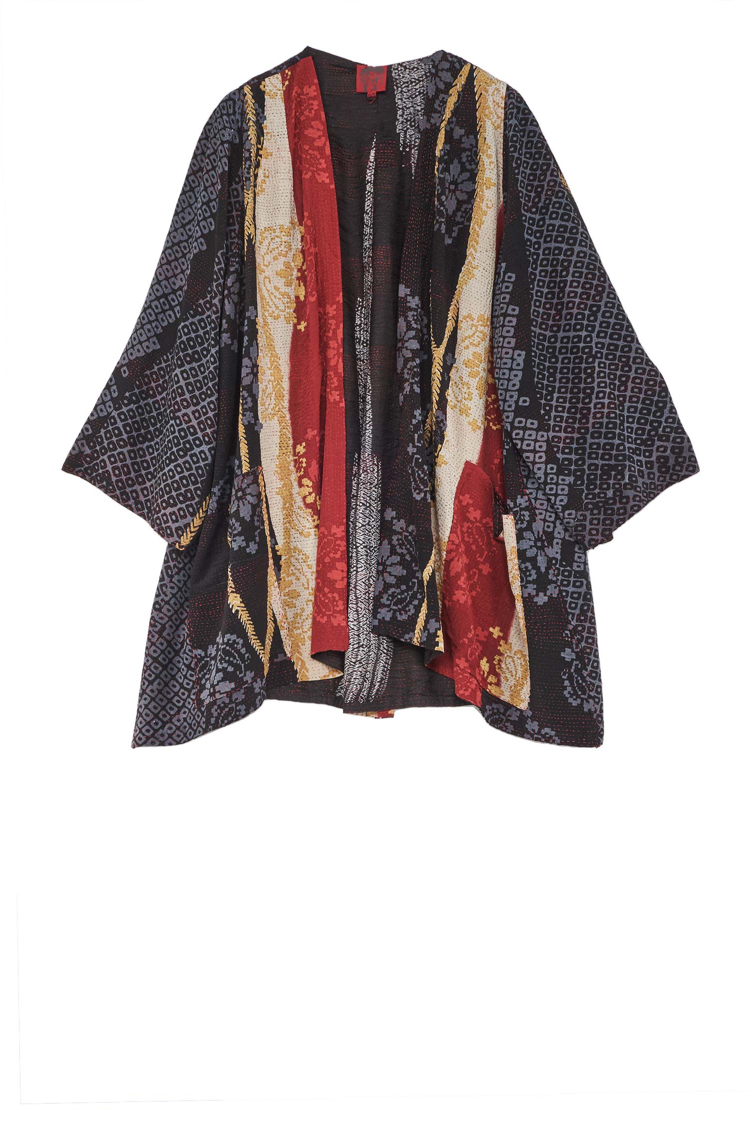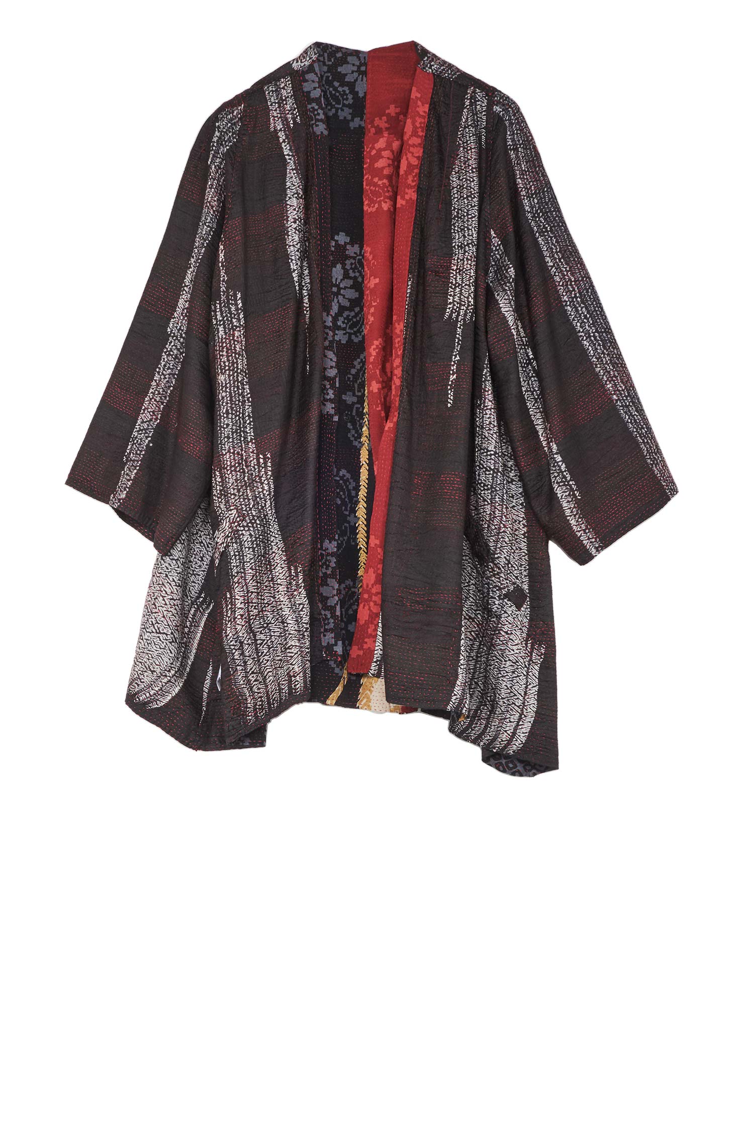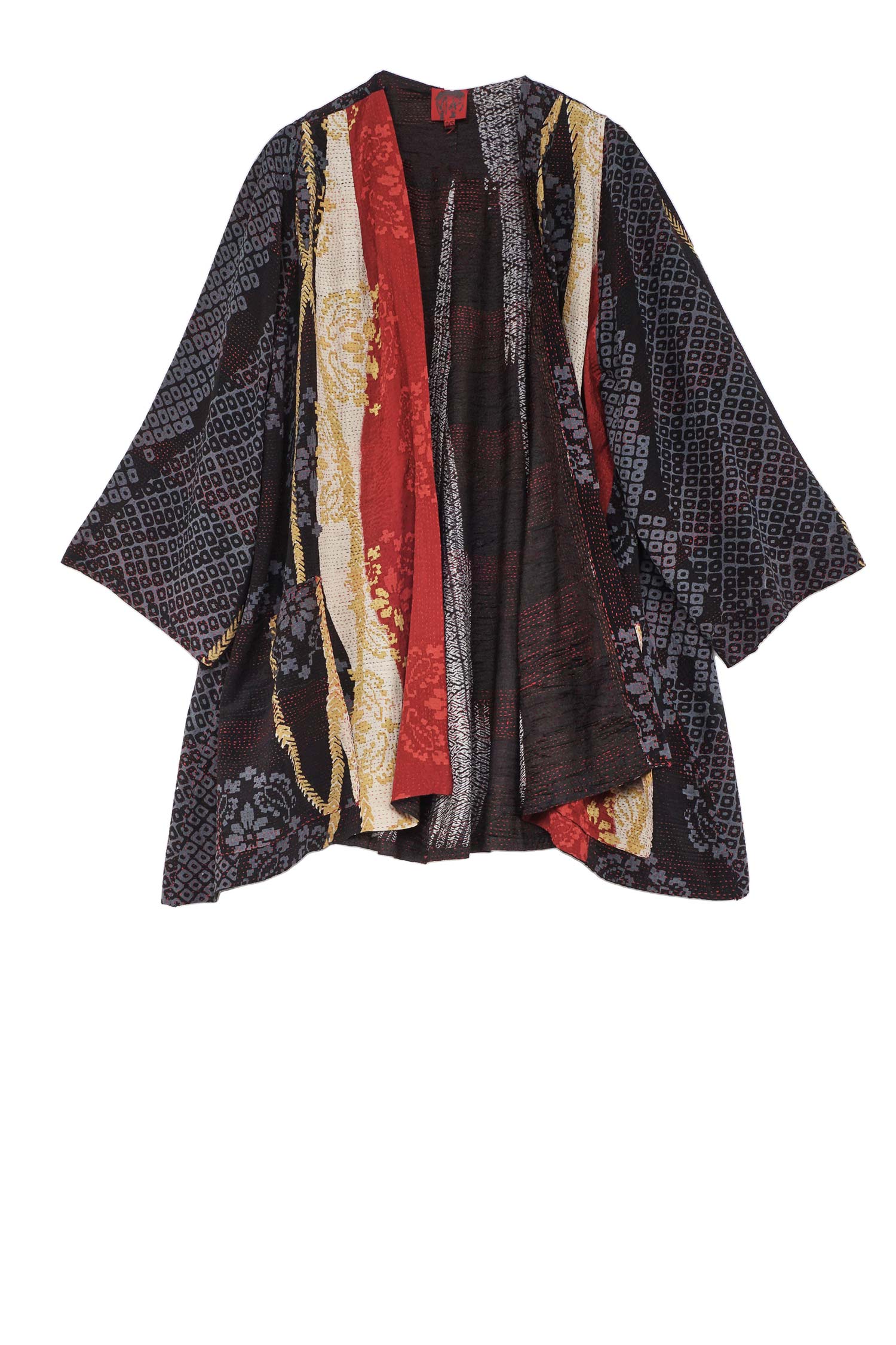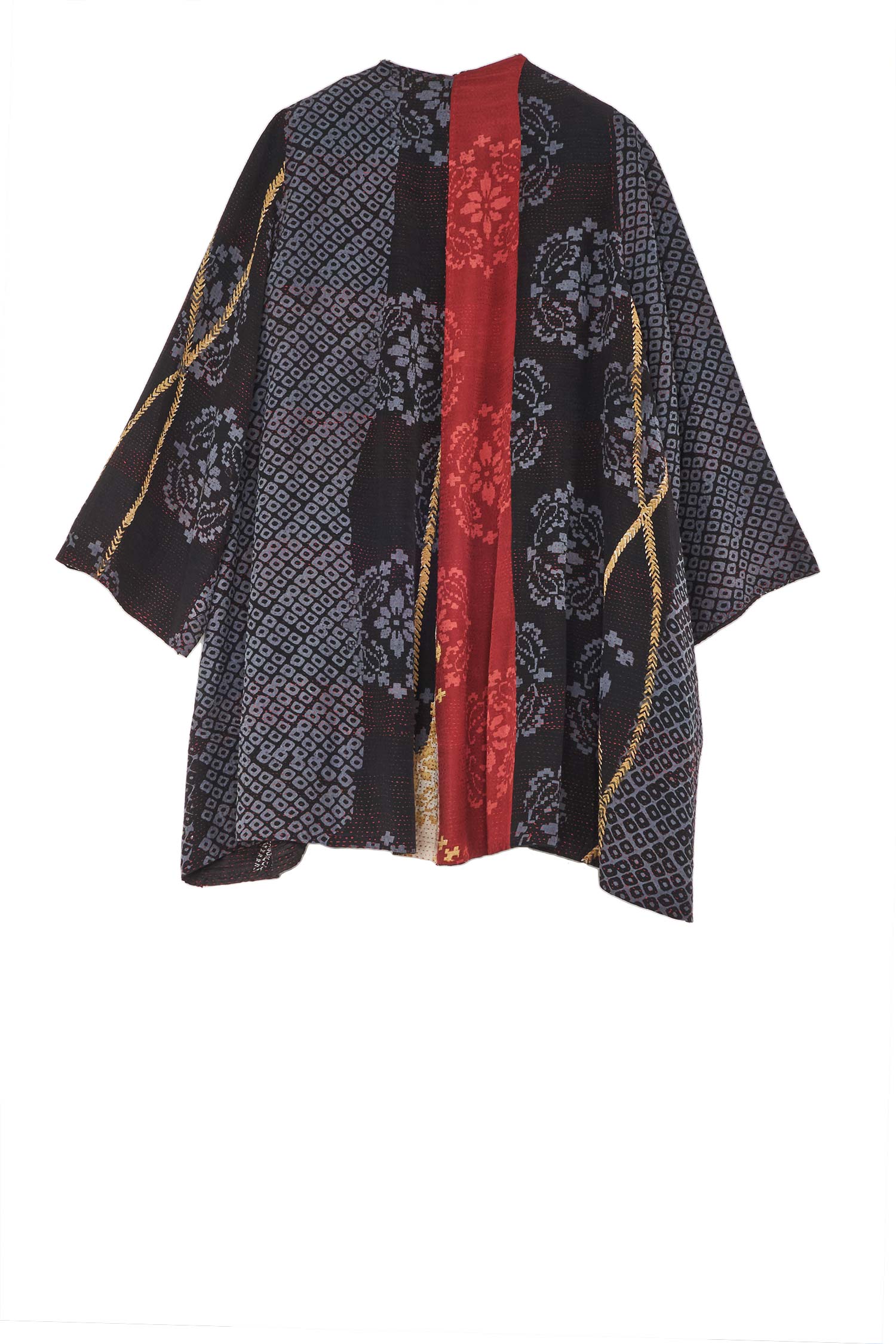 KIMONO PRINT KANTHA BELL SHAPE LONG JKT - kp2051-blk -