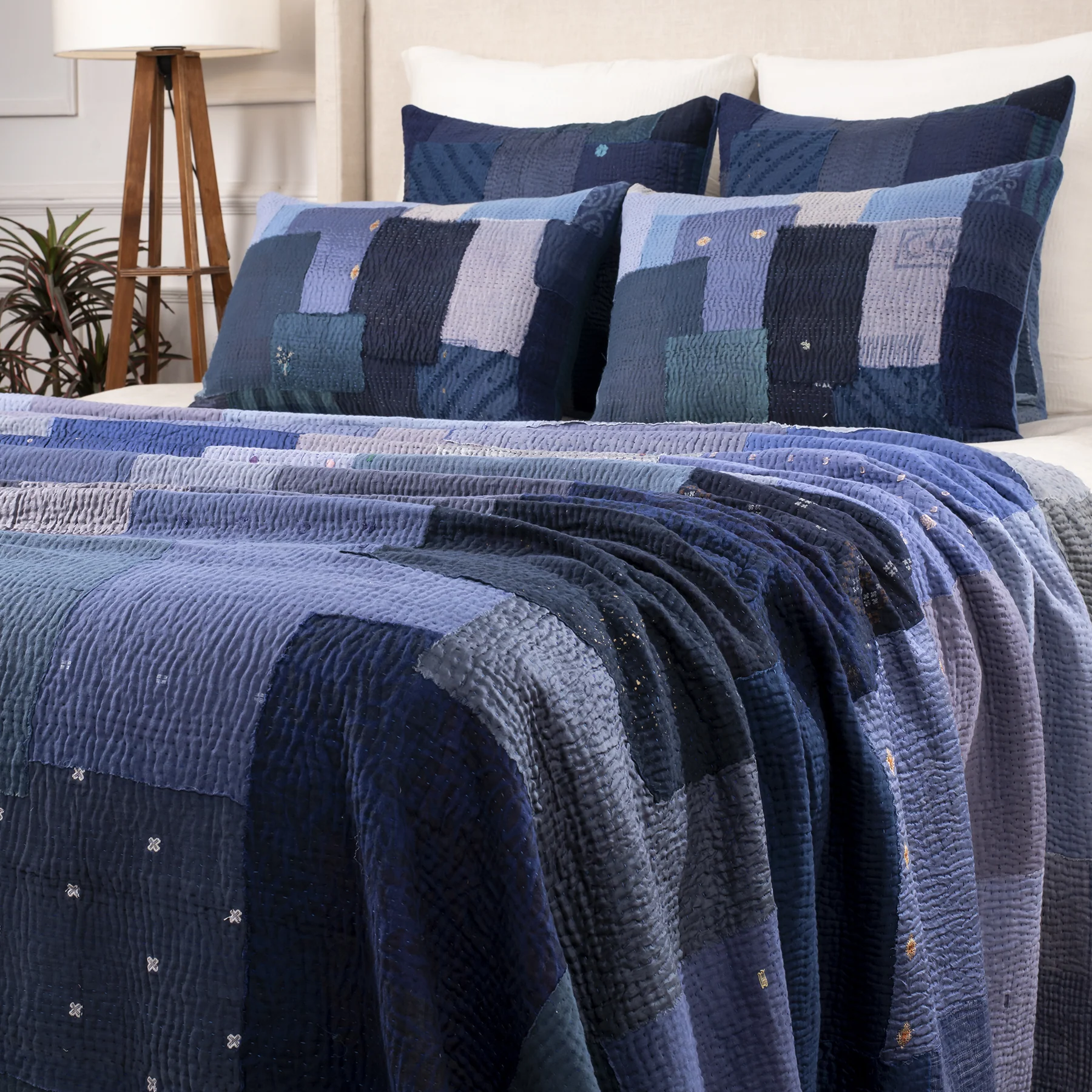 This collection has a thin layer of Wool wadding along with four layers of cotton and silk recycled vintage saris for Quilts and Throws. All the patches are articulately placed hand stitched with threads of tonal shades deliberately leaving edges to fray. These luxuriously soft touch quilt is having quarter of a million hand running stitches that gives a beautiful puckering surface.
