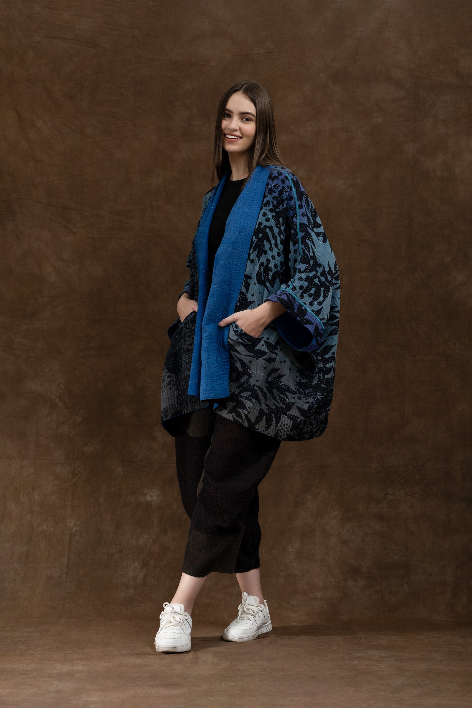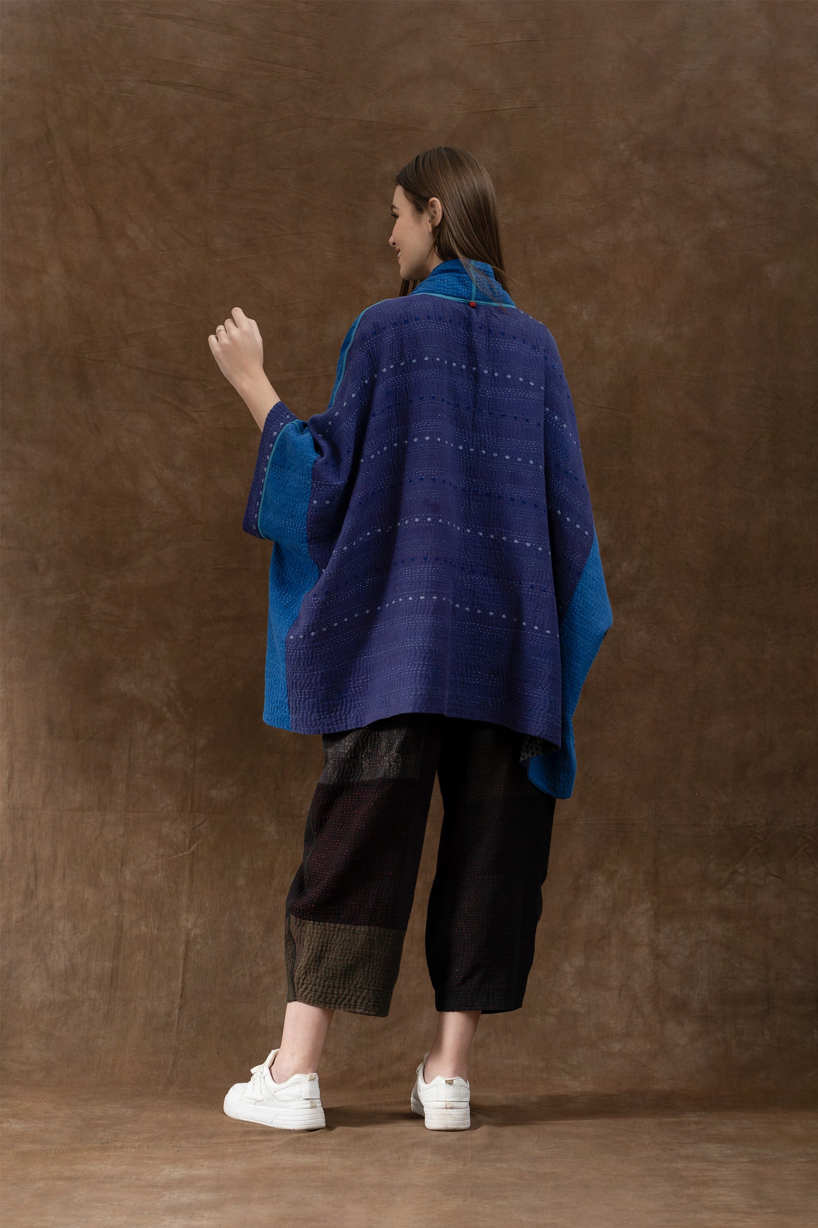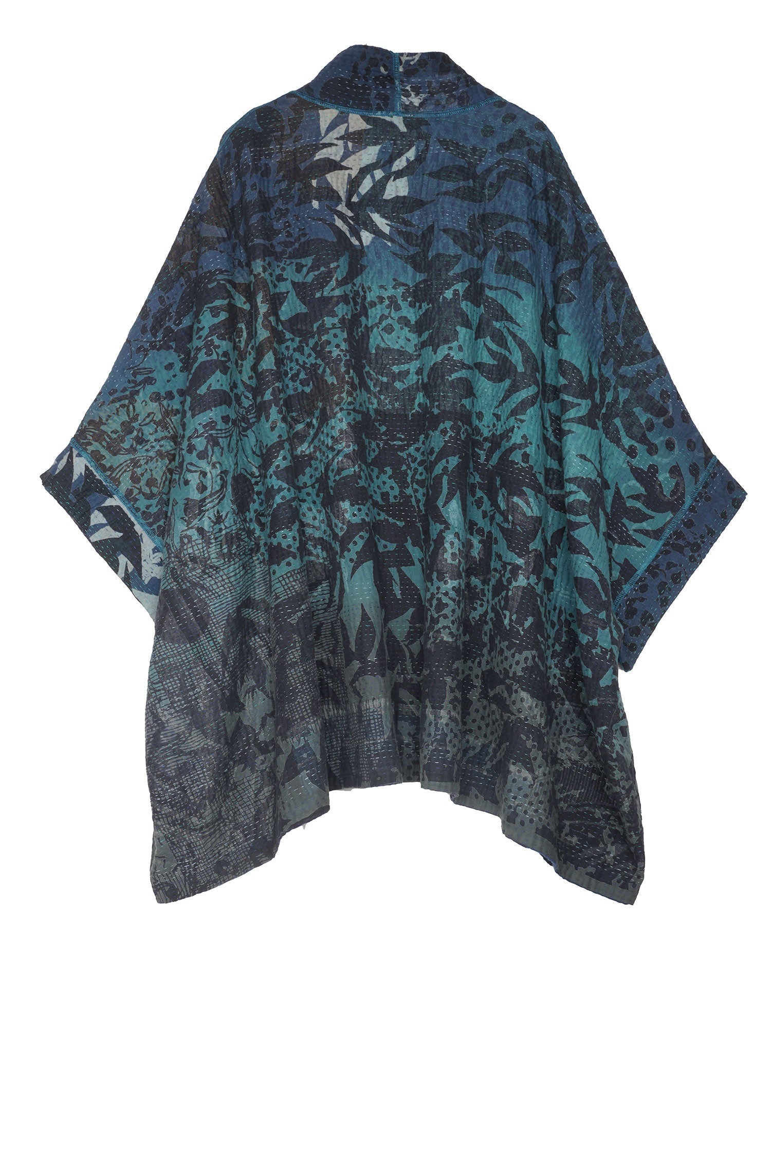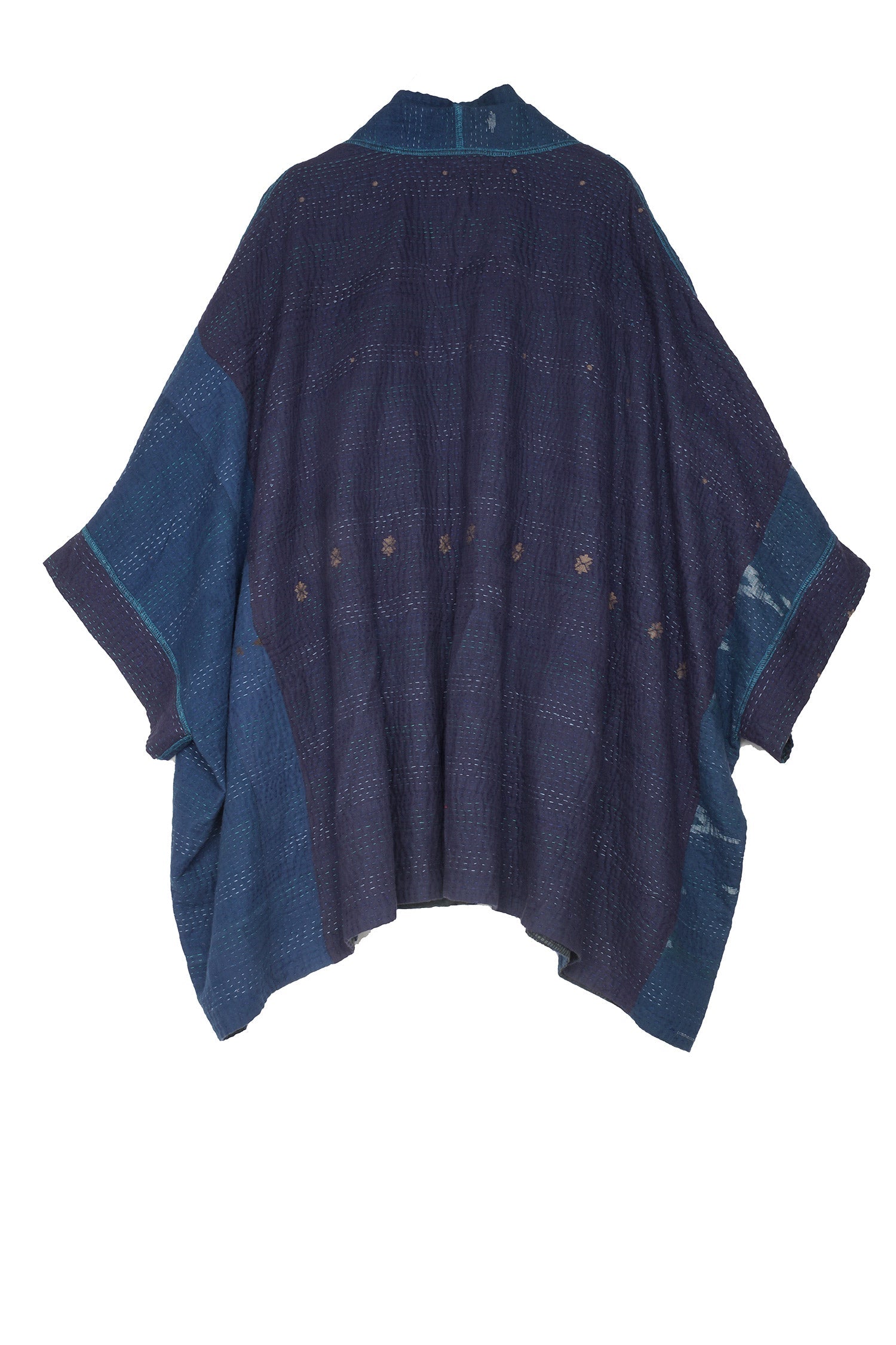 MONOTONE TWILIGHT PRINT KANTHA DOUBLE COLLAR PONCHO - tp4323-blu -