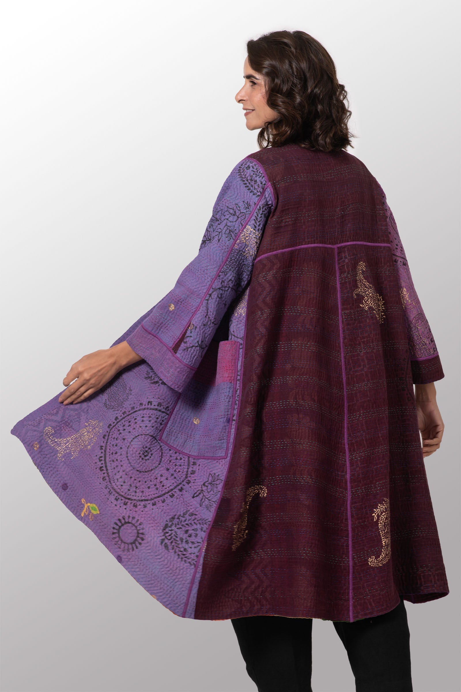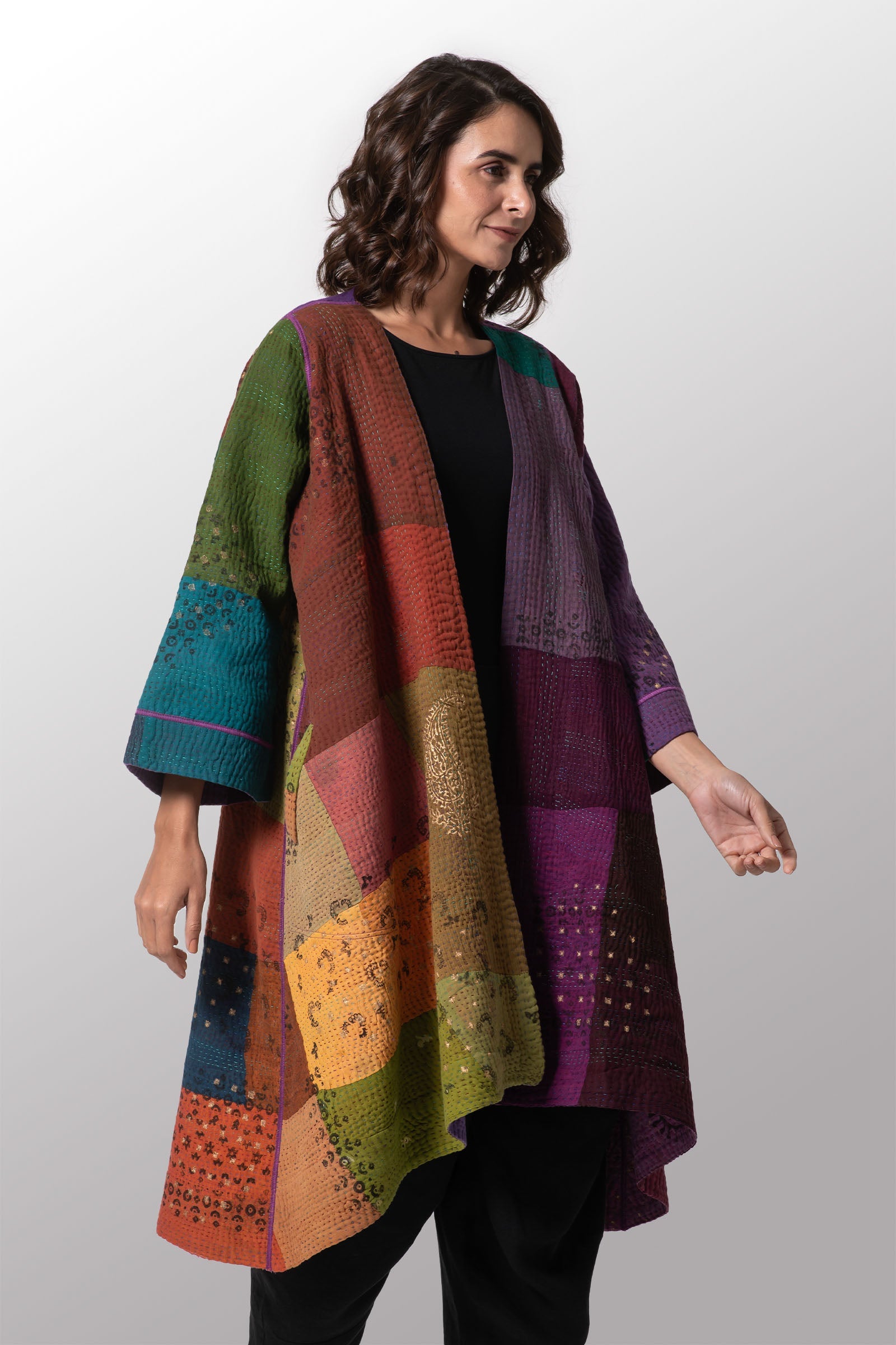 OMBRE PATCHED GOLD STAMP KANTHA WRAP FLARE COAT - og4330-mlt -
