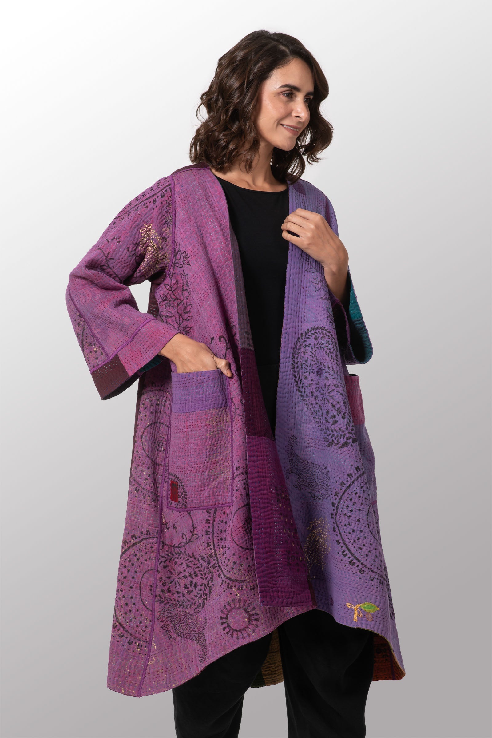 4 Layer Vintage Saris with Hand Stitches on Entire Garment - Reversible