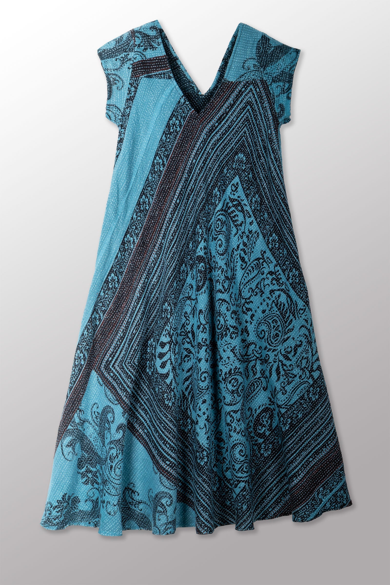 OVERDYED COTTON PAISLEY KANTHA CAP SLV. FLARE DRESS - ov-cp2425-blu -