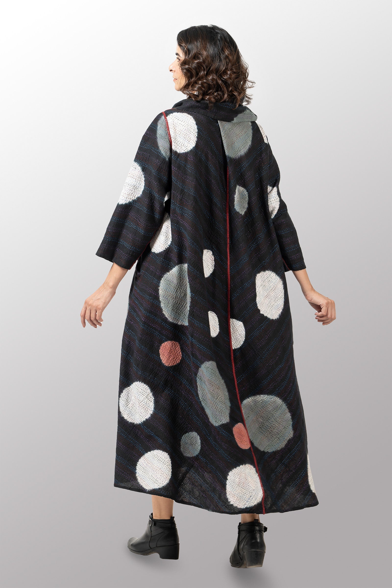 PATCH & CIRCLE PRINT KANTHA COWL NECK LONG SLEEVE DRESS - pc2450-blk -
