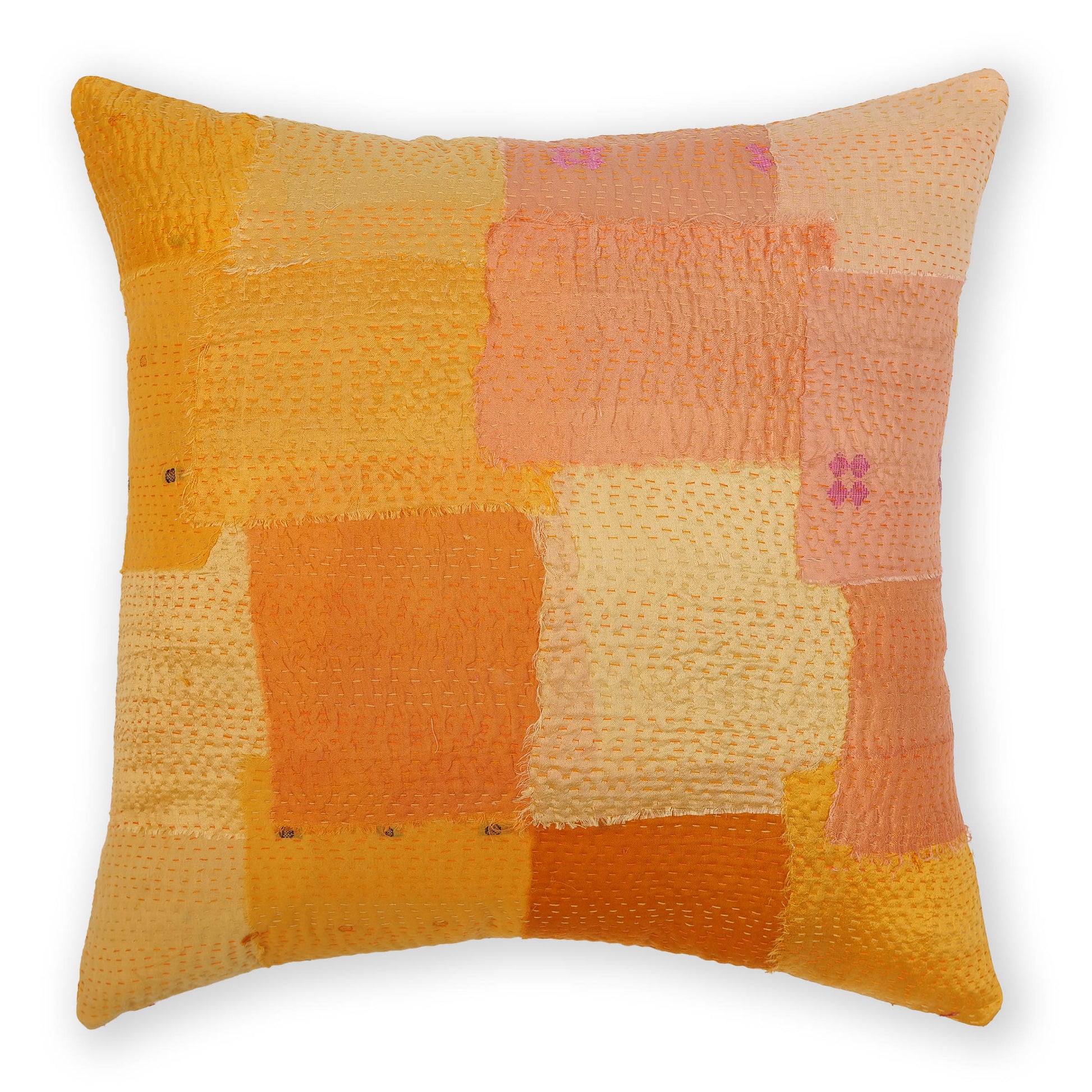 Undeniably Chic, Peach Blush Fray pillows are made of many different vintage patches. It has four layers of cotton and silk recycled vintage saris. All the patches are articulately placed with threads of tonal shades leaving edges to fray. This luxuriously soft warm pillow inspires you to nestle into, be it in Bedroom or Lounge.
