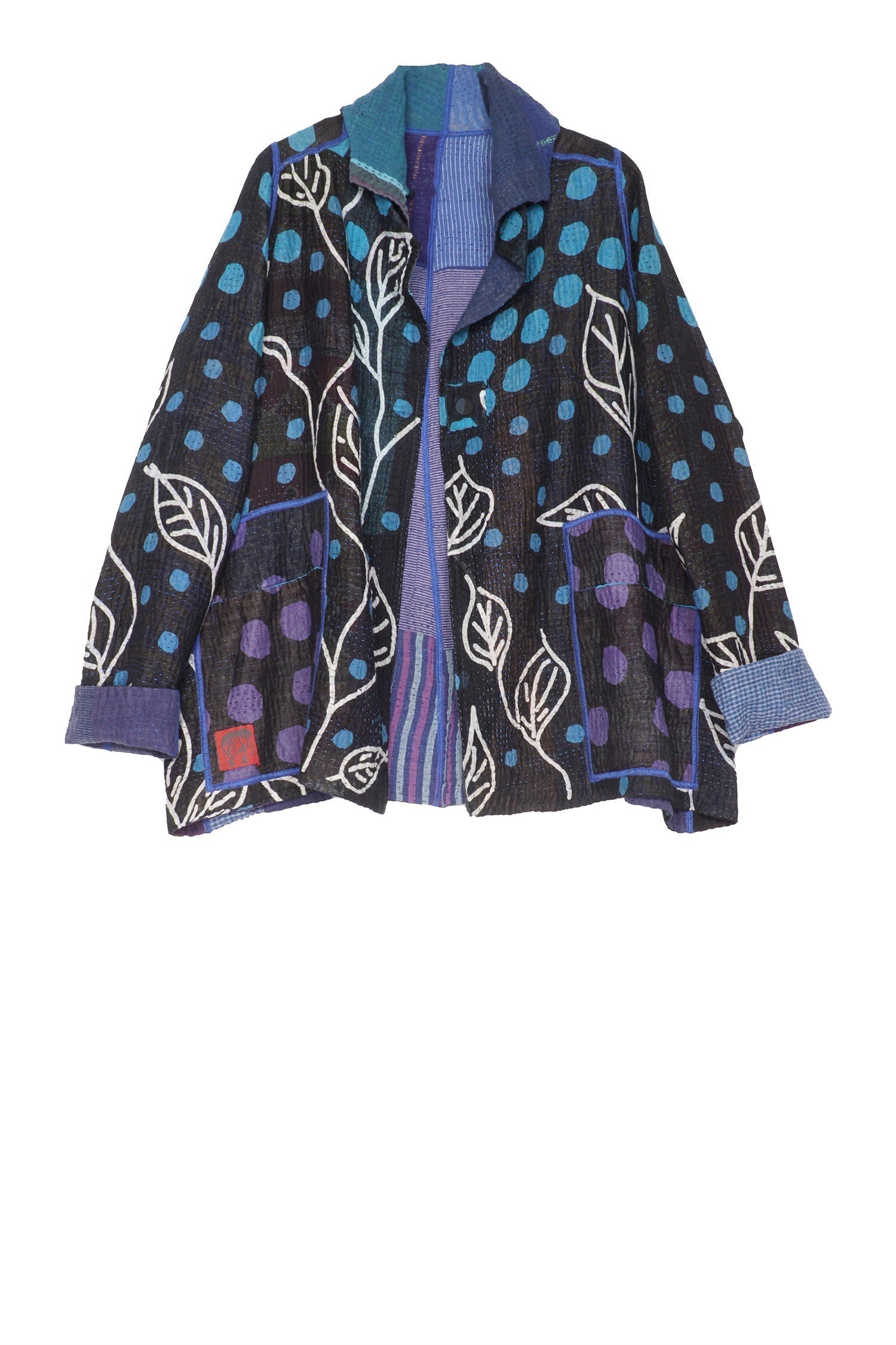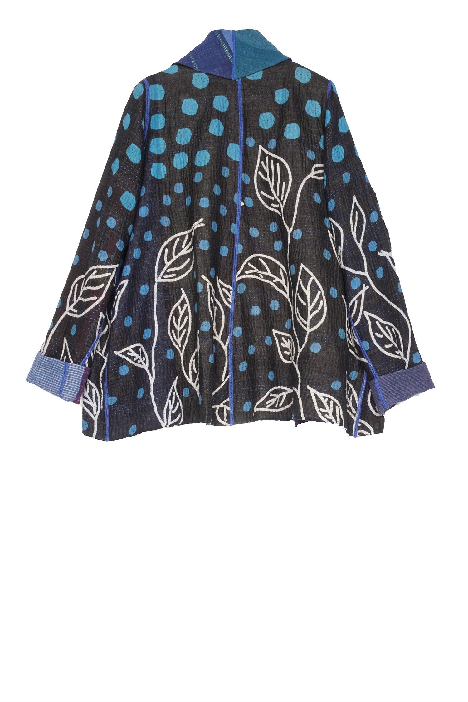 POLKA DOTS & LEAVES KANTHA TUCKED COLLAR JKT - dl4047-blu -
