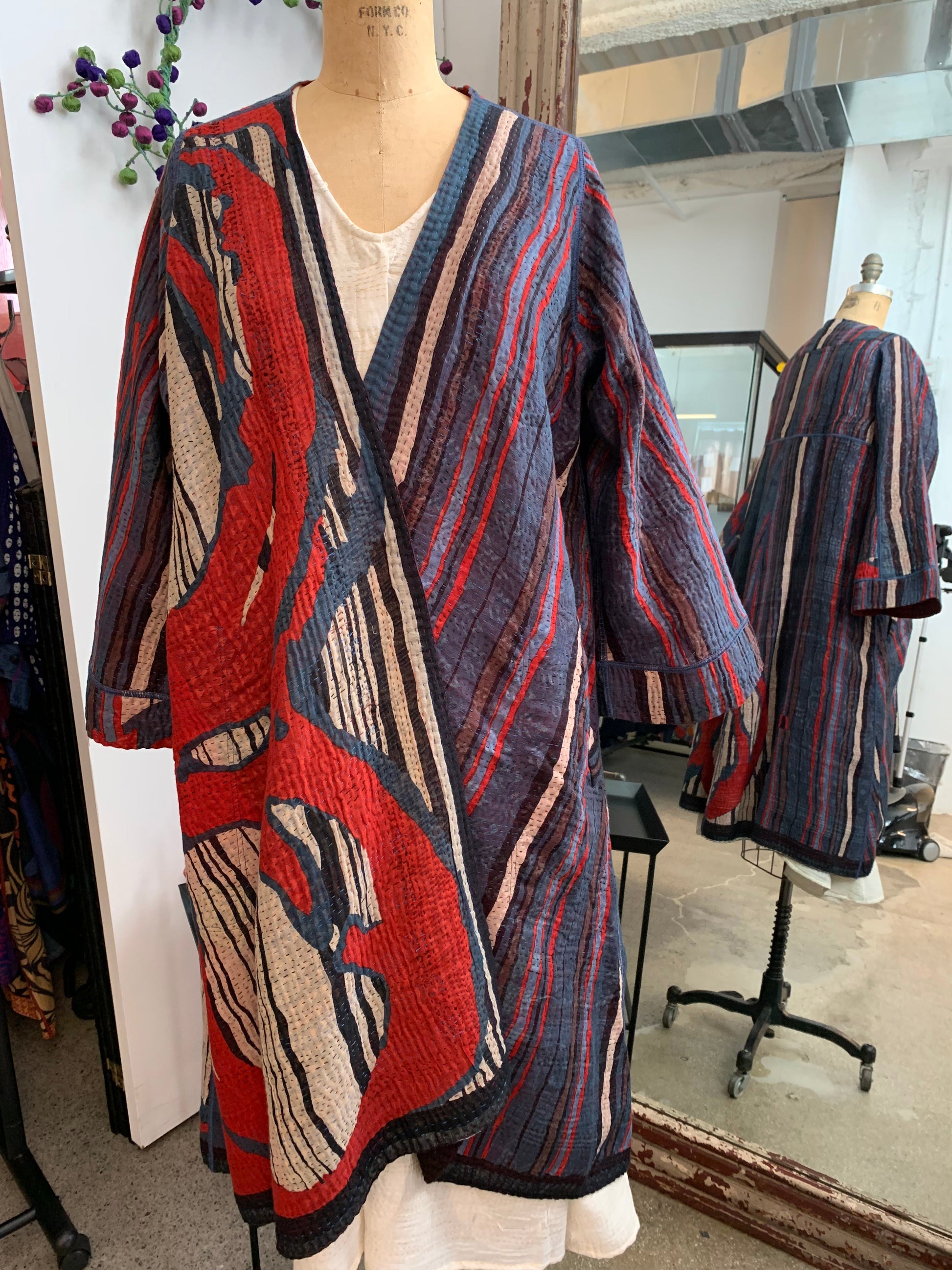 STRIPE AND BENDS KANTHA WRAP FLARE COAT - sb4330-red -