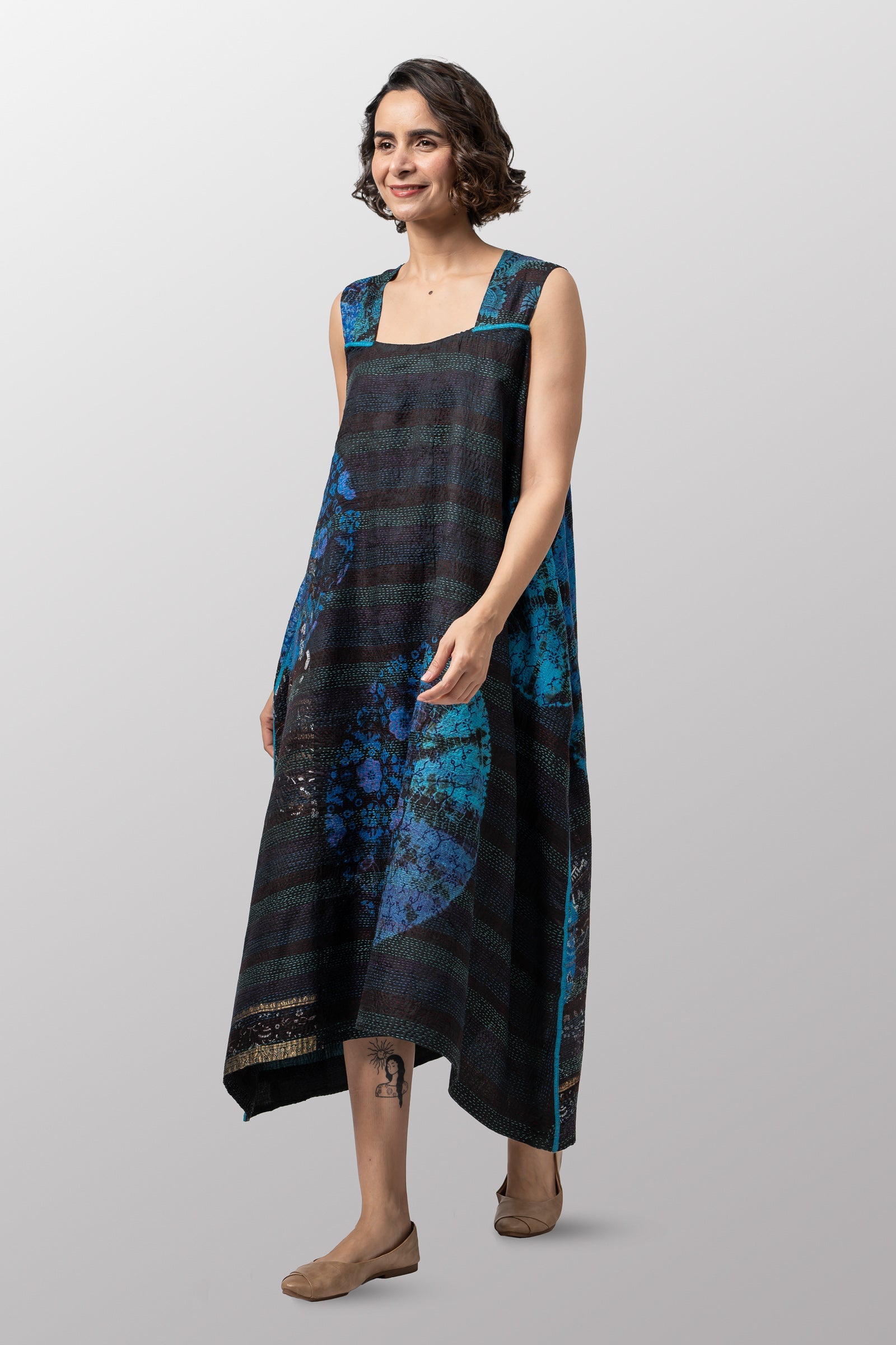 TIE DYE CIRCLE SHIBORI KANTHA TENT DRESS - td2413-blu -