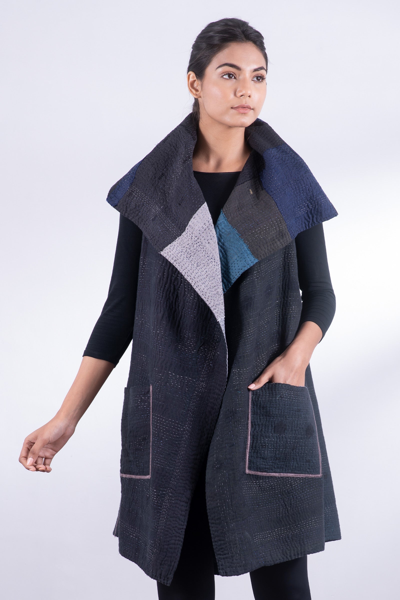 TWO TONE PATCH KANTHA CIRCULAR VEST - tn4201-blk -