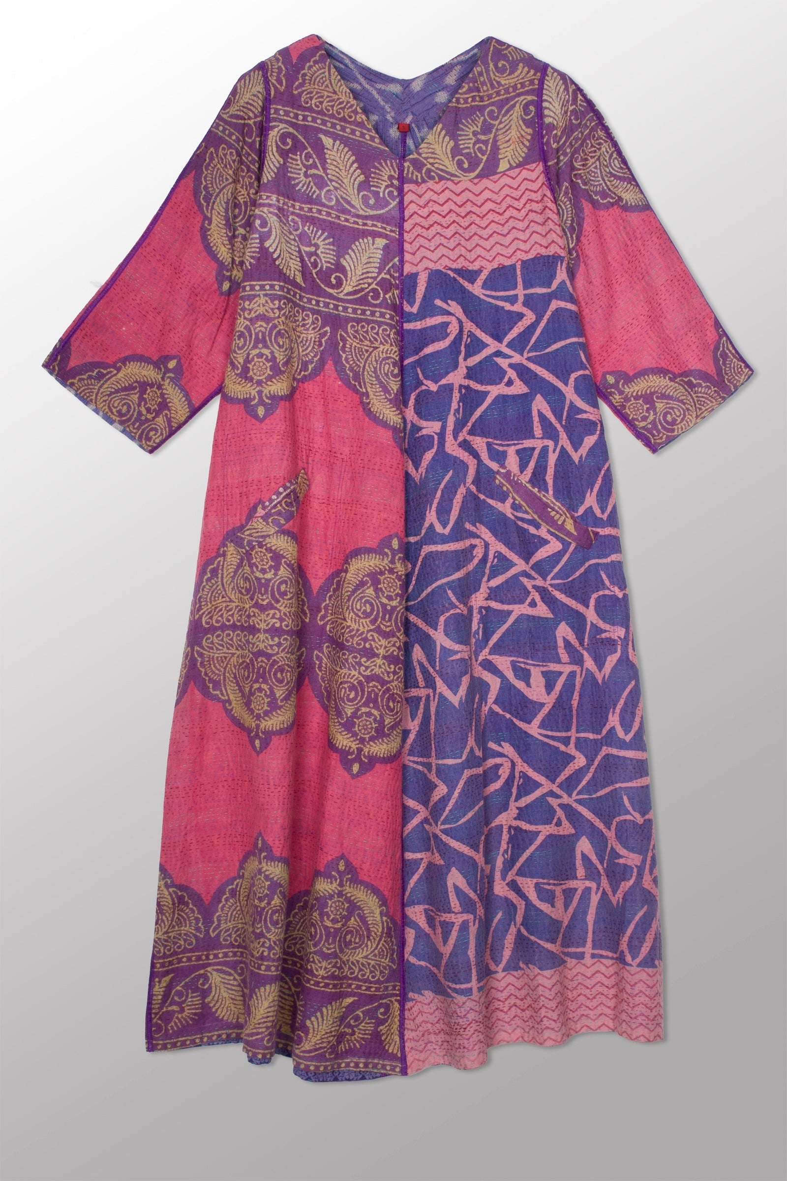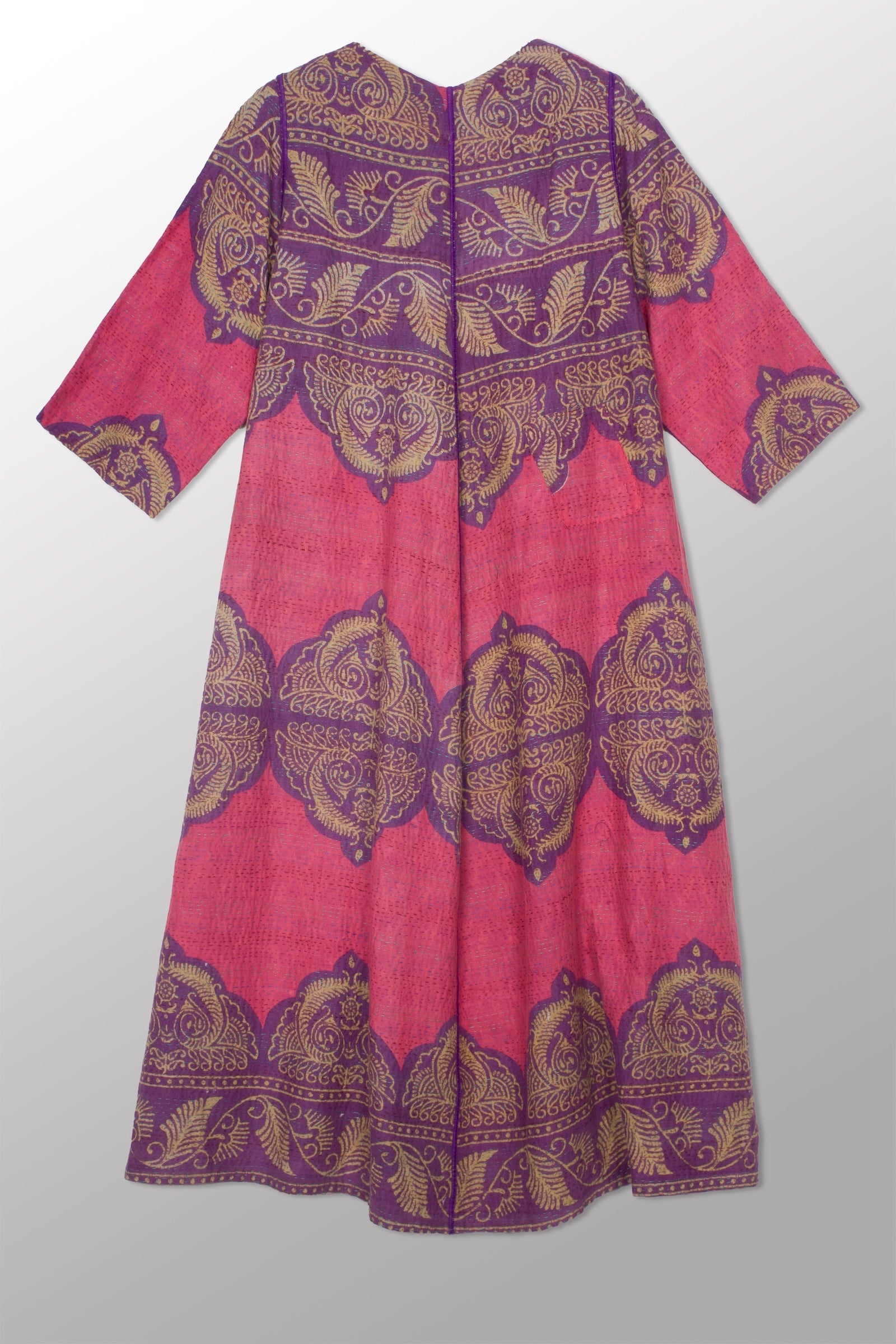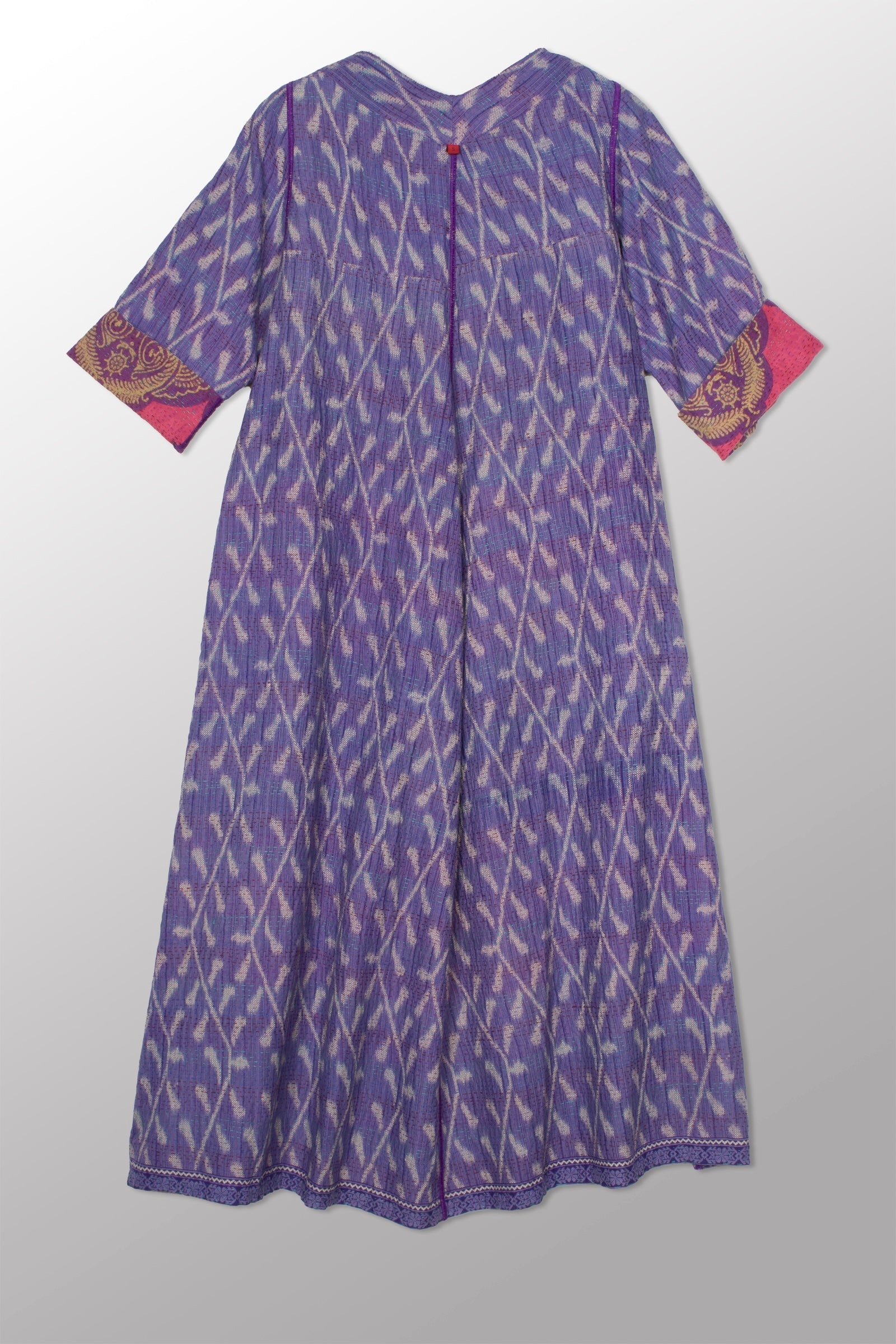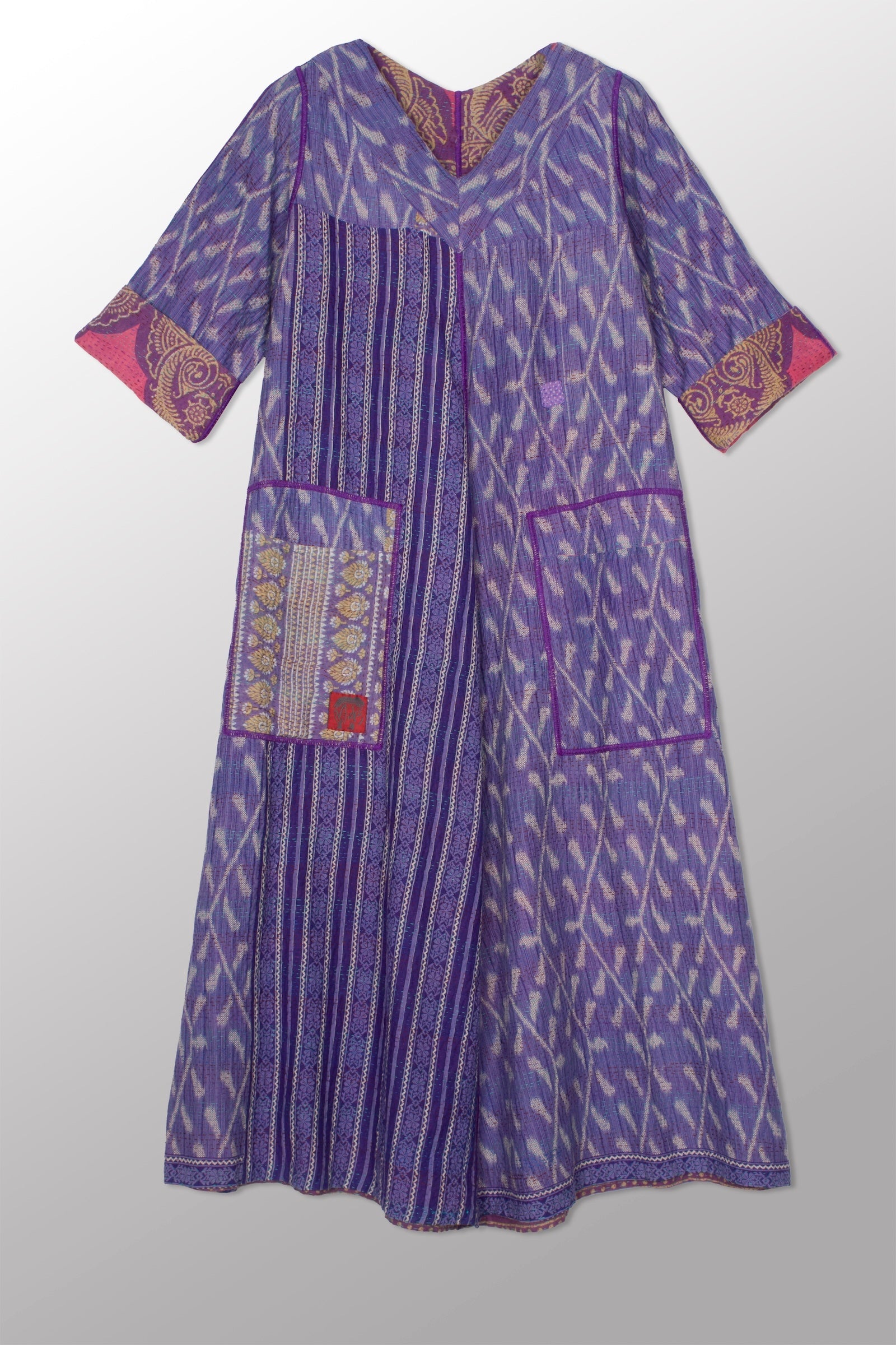VINTAGE COTTON KANTHA V-NECK FLARE DRESS - cv2457-0001s -