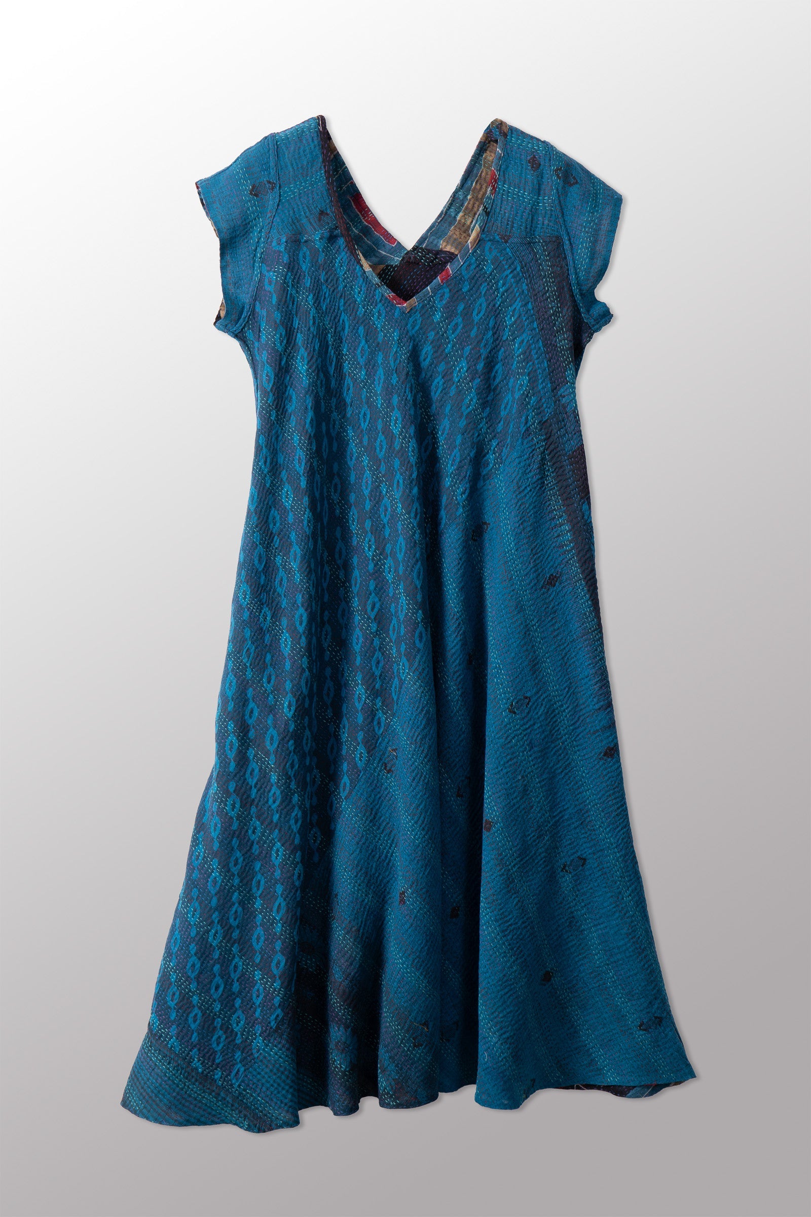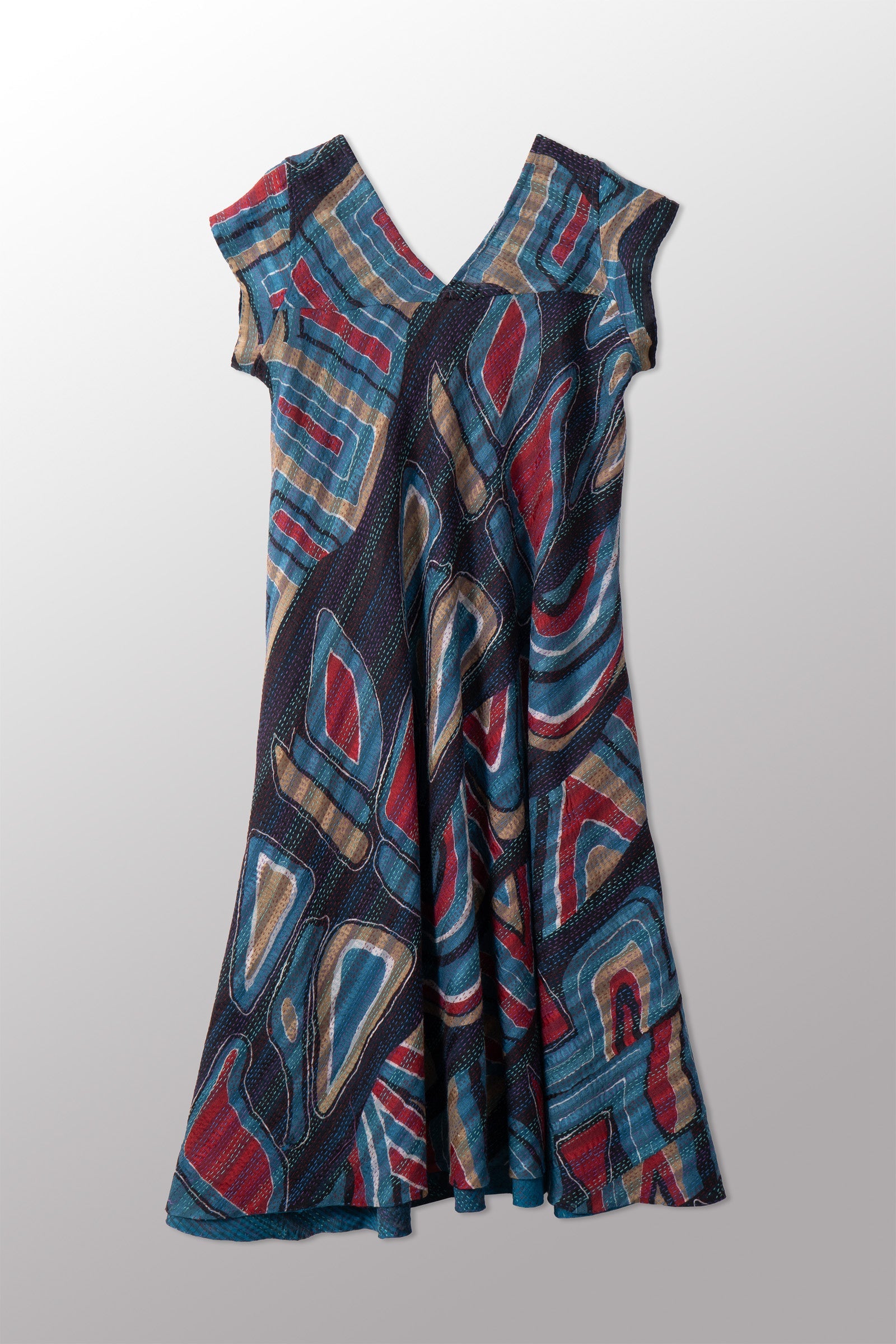 VINTAGE SILK GEORGETTE COTTON KANTHA CAP SLV. FLARE DRESS - gc2425-0001m -