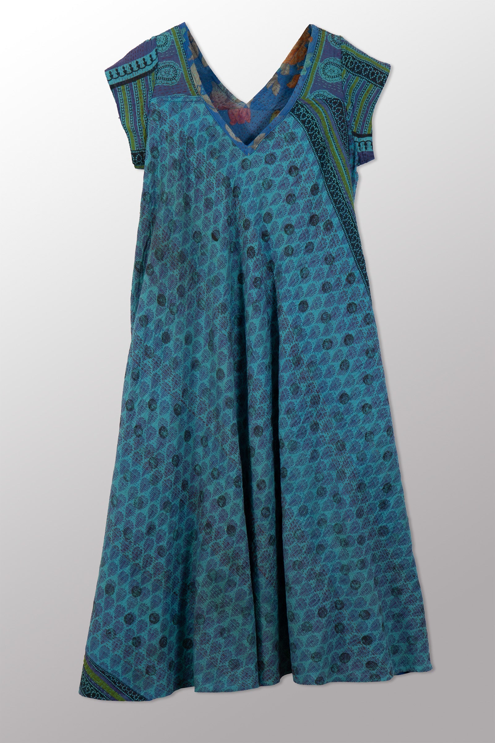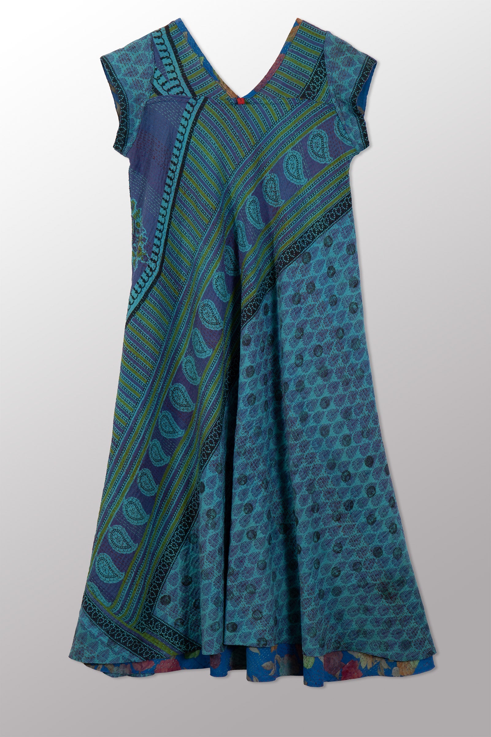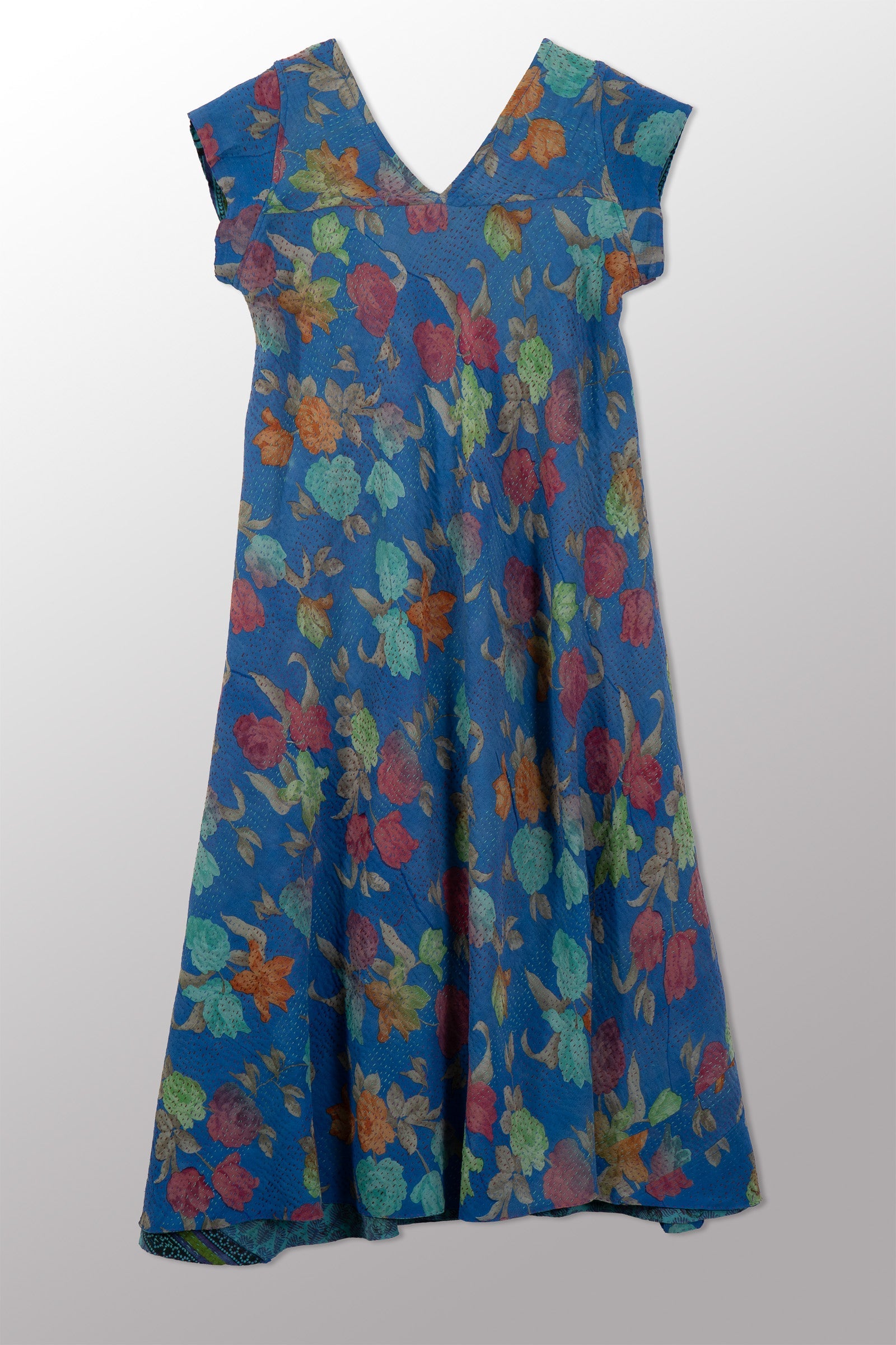 VINTAGE SILK GEORGETTE COTTON KANTHA CAP SLV. FLARE DRESS - gc2425-0002s -