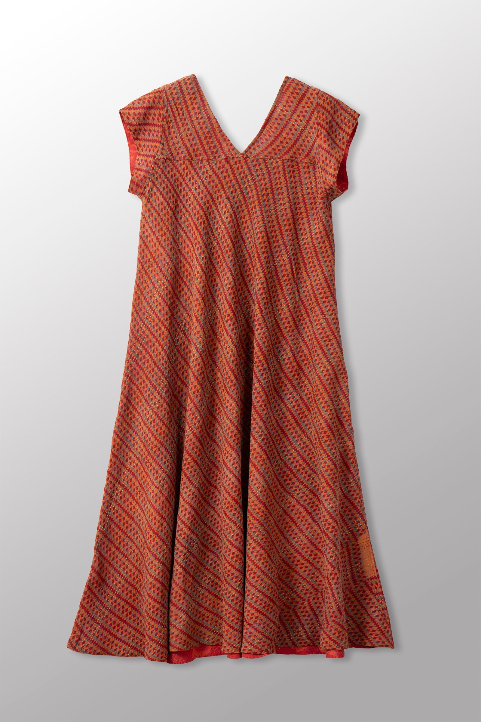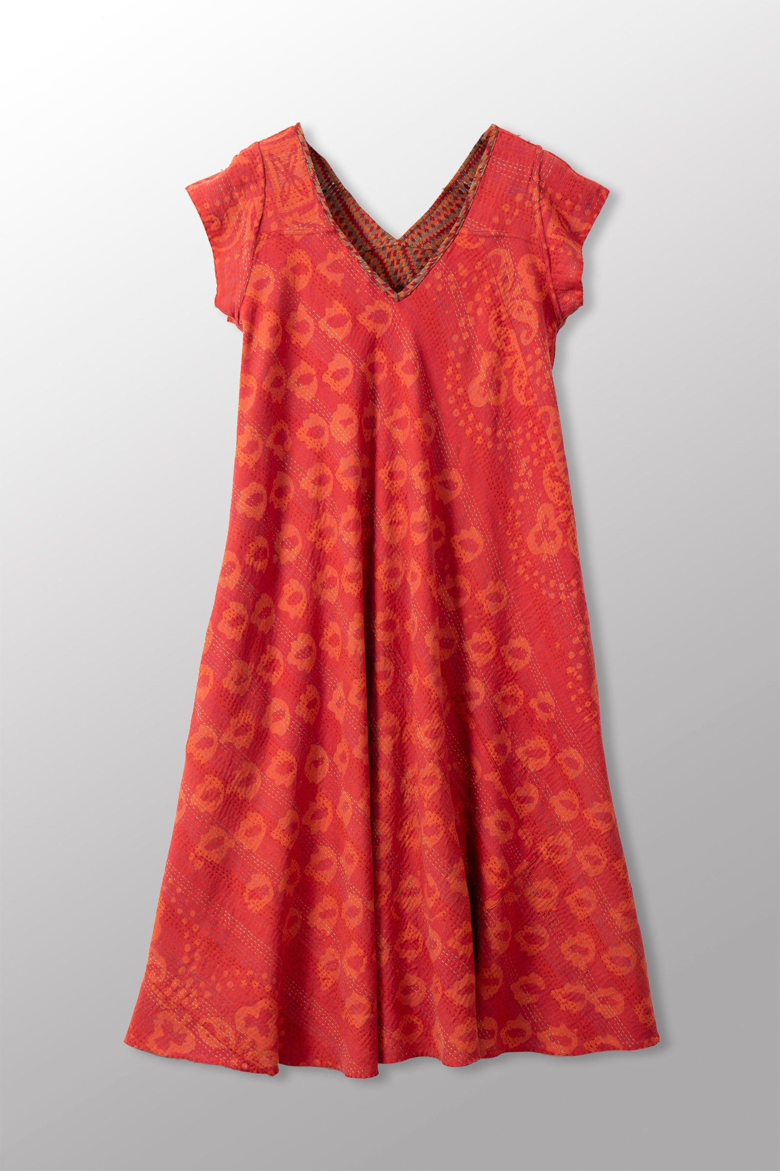 VINTAGE SILK GEORGETTE COTTON KANTHA CAP SLV. FLARE DRESS - gc2425-0003m -