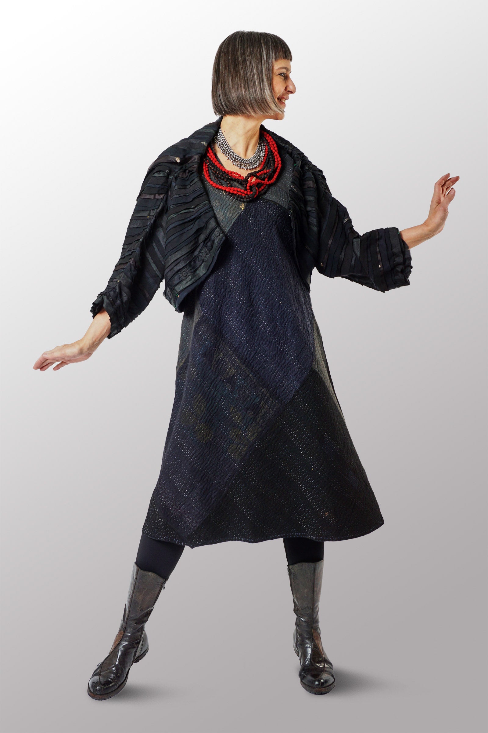 WAVY STRIPE KANTHA CRWE NECK WIDE SLV. JACKET - wv2078-blk -