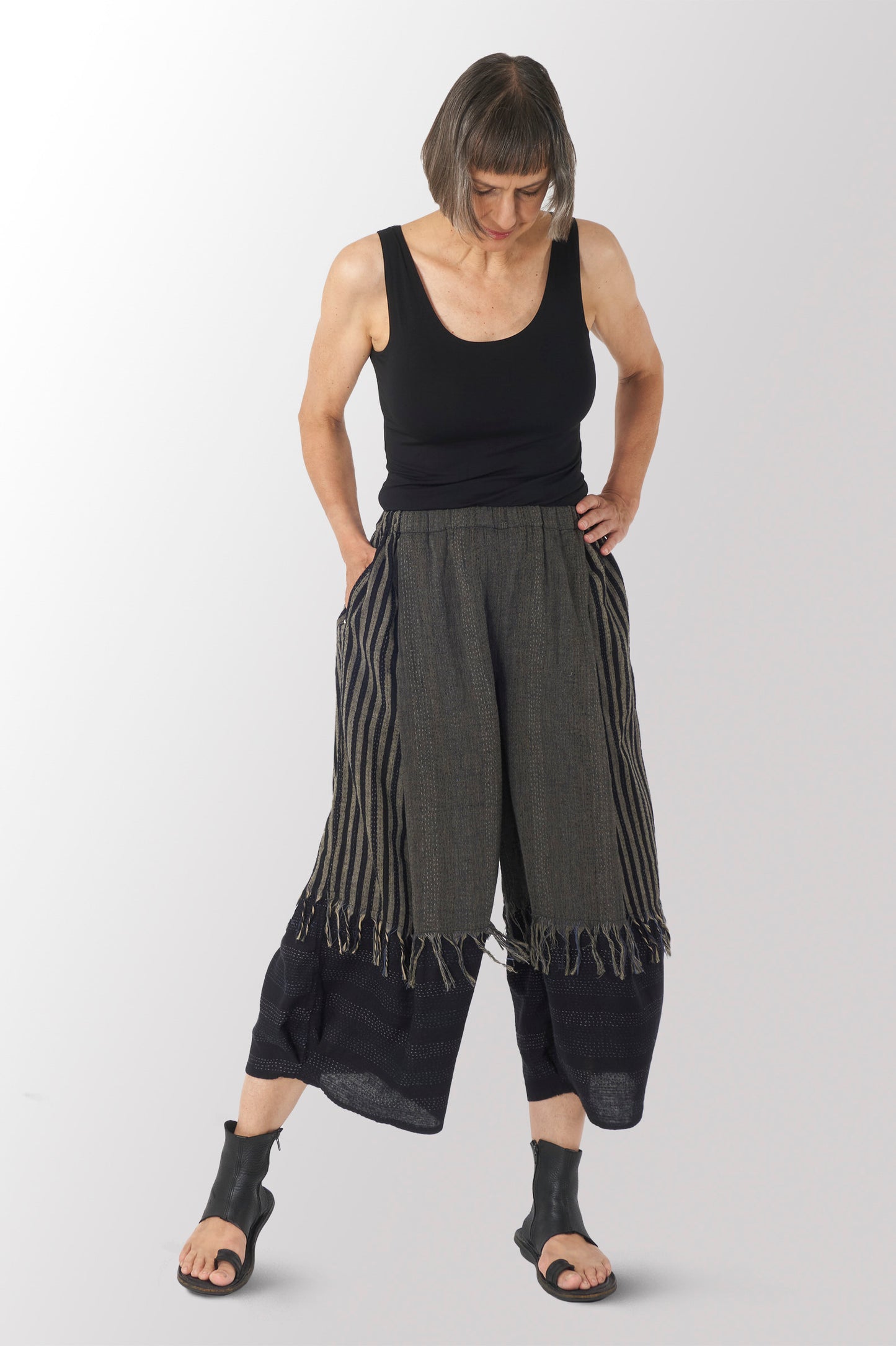 WOVEN HANDLOOM COTTON KANTHA WIDE LEG LANTERN PANTS - wc2646-blk -