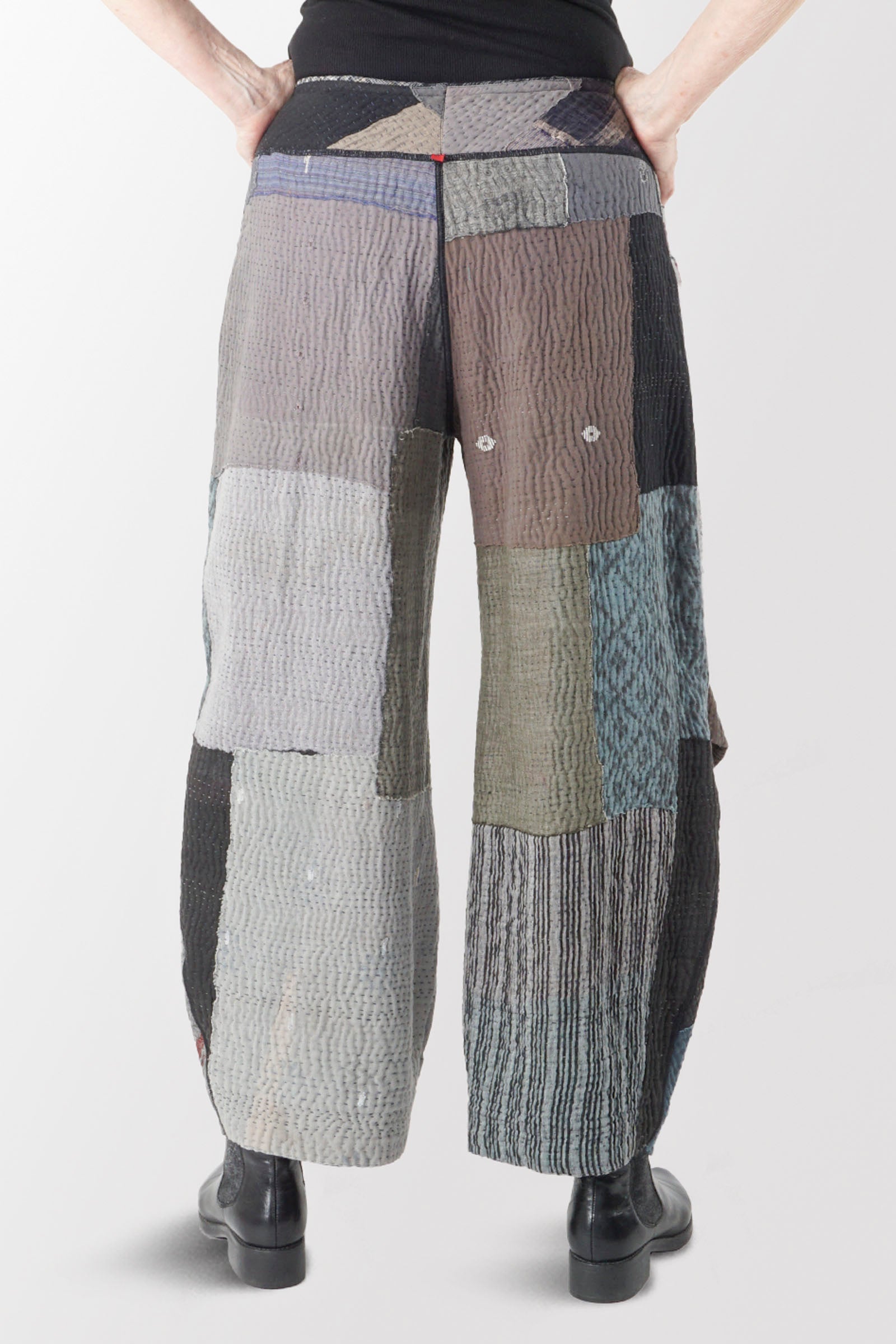 WOVEN IKAT & FRAYED PATCH KANTHA KNEE TUCKED PANTS - wk4625-gry -