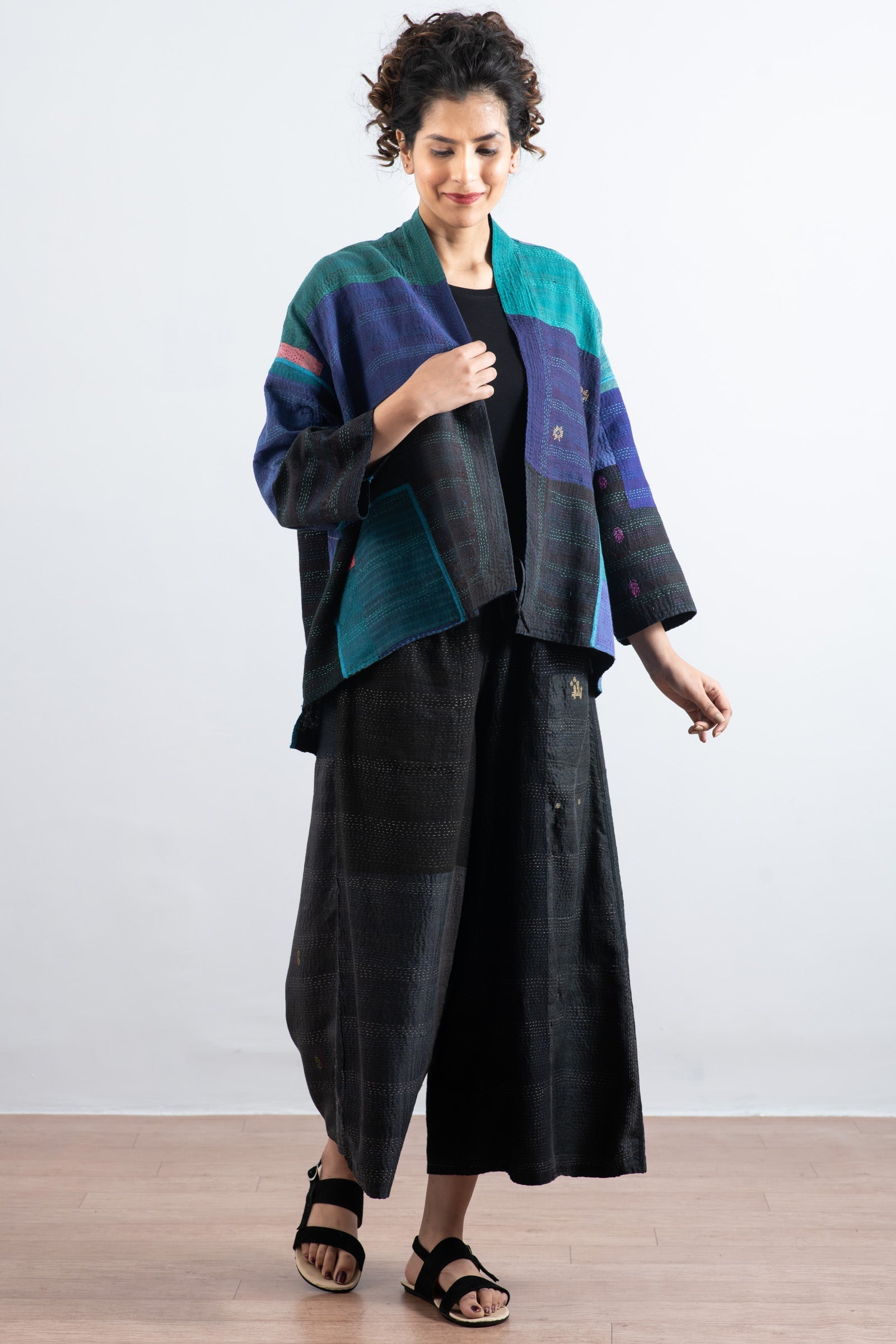 BAGH PRINT KANTHA MINI KIMONO JKT - bg2055-blu -