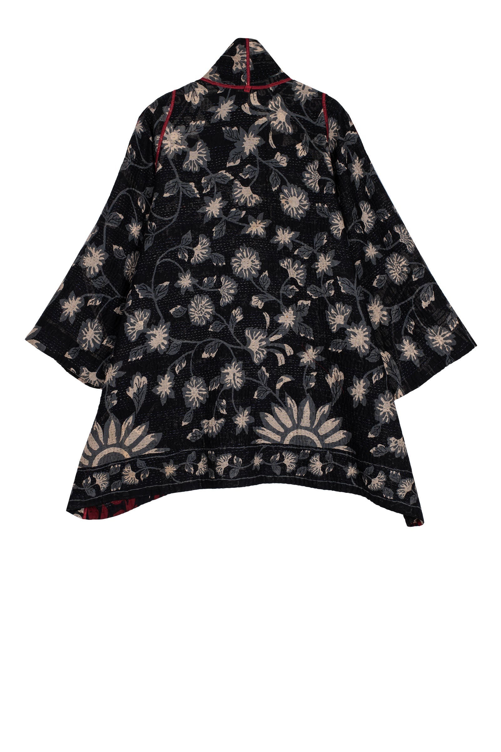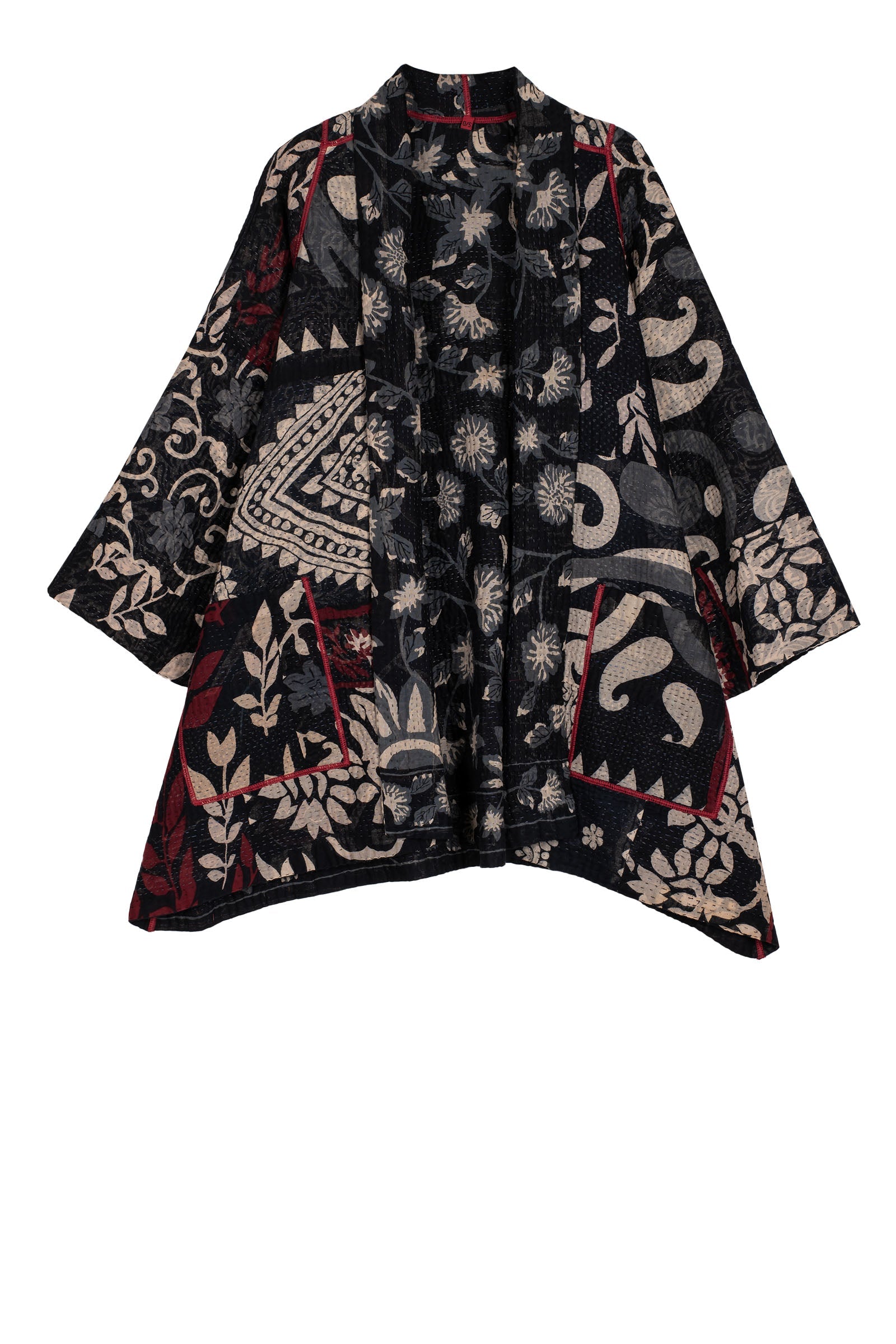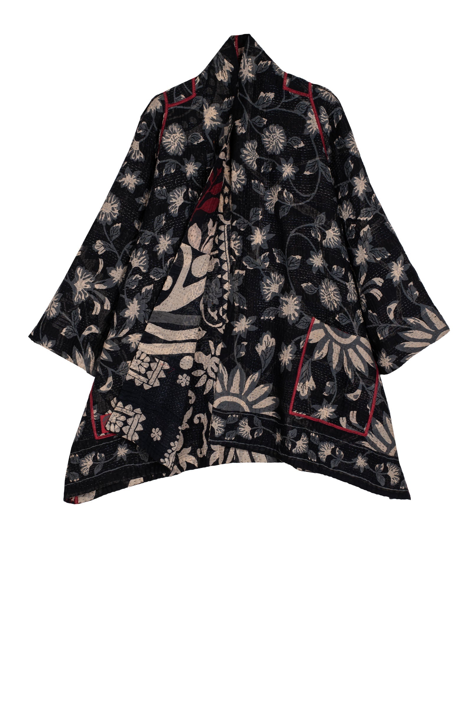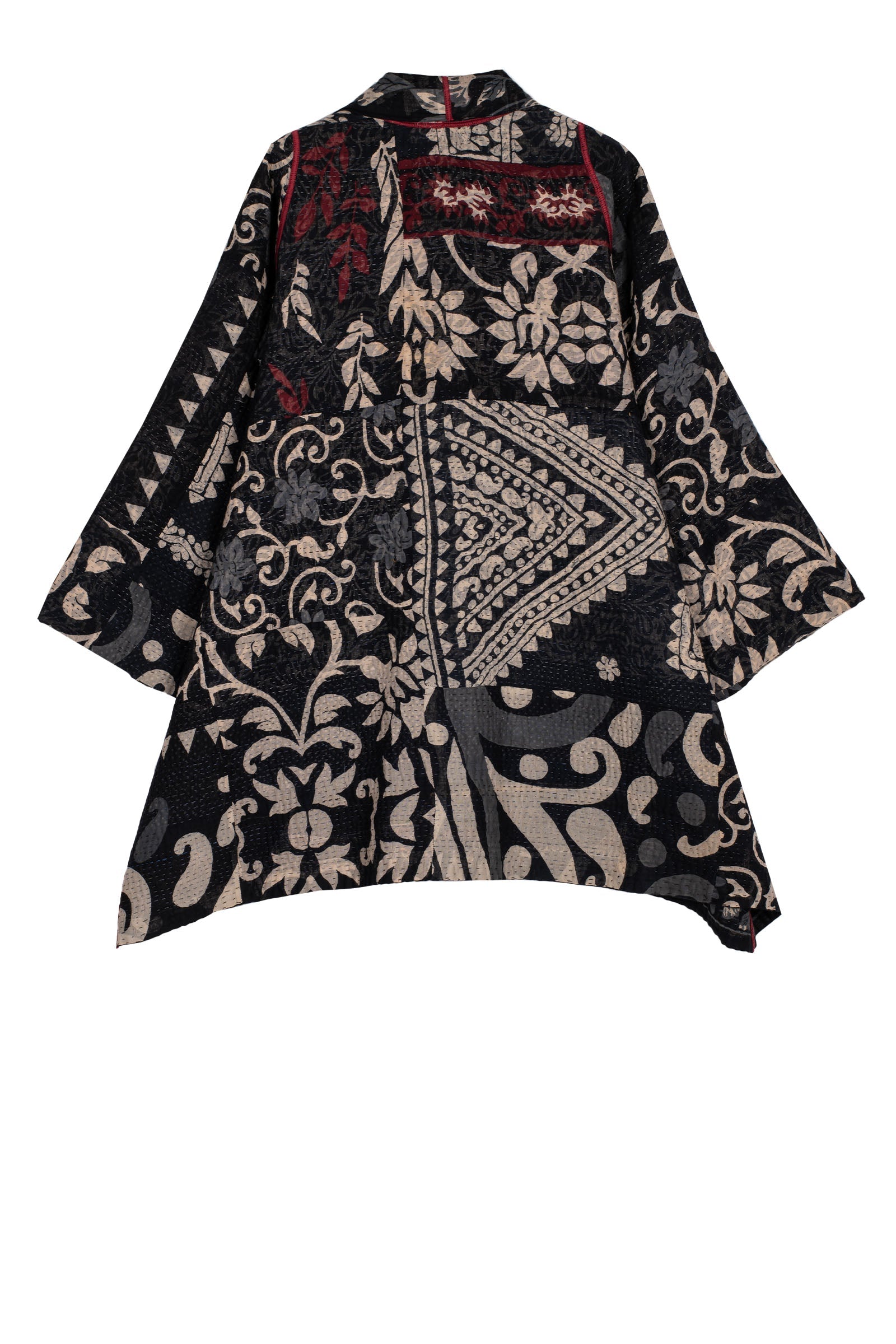 BLACK AND WHITE PRINT PATCH KANTHA A-LINE JACKET - pn4003-blk -