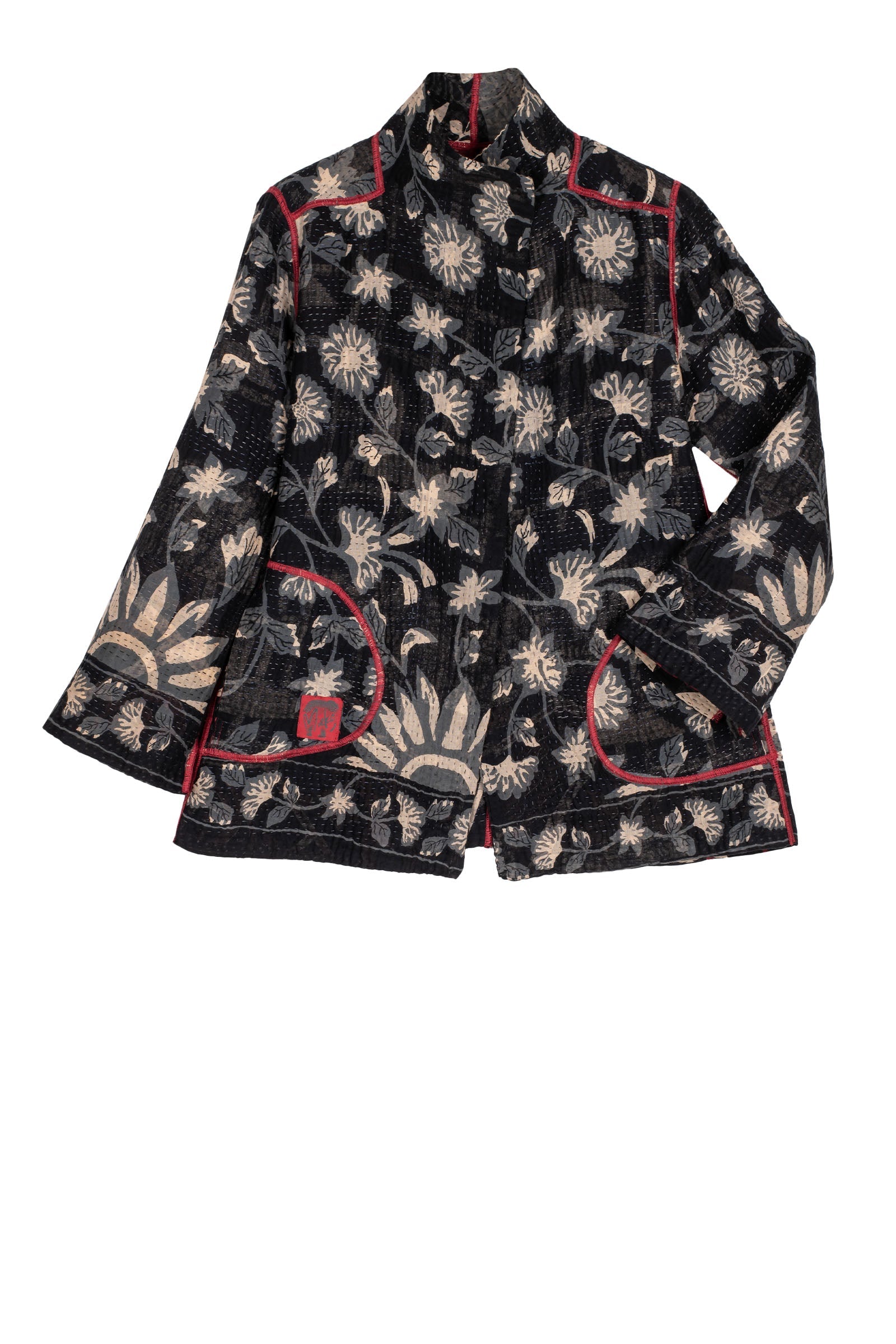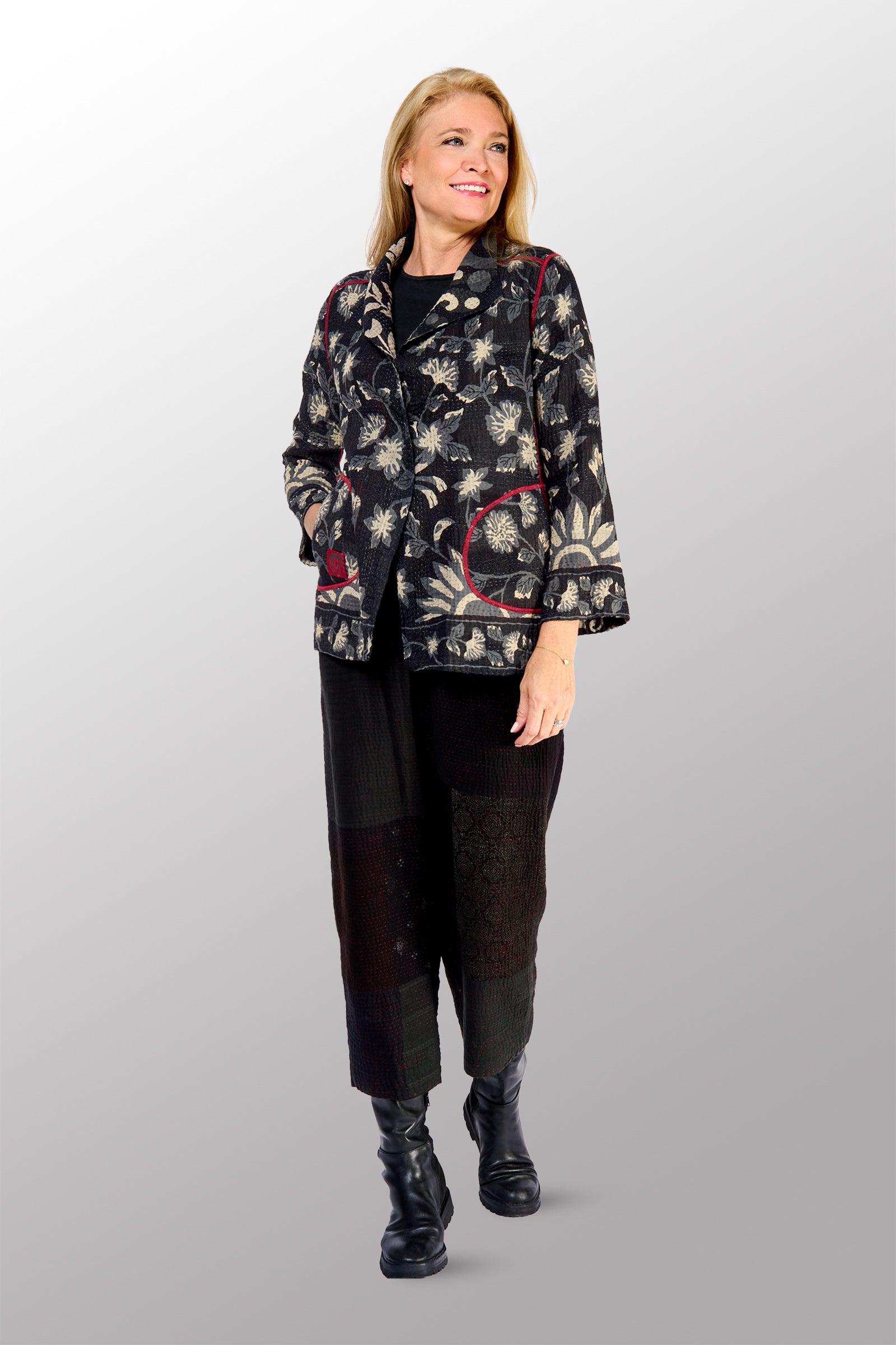 BLACK AND WHITE PRINT PATCH KANTHA SHORT JACKET - pn4007-blk -