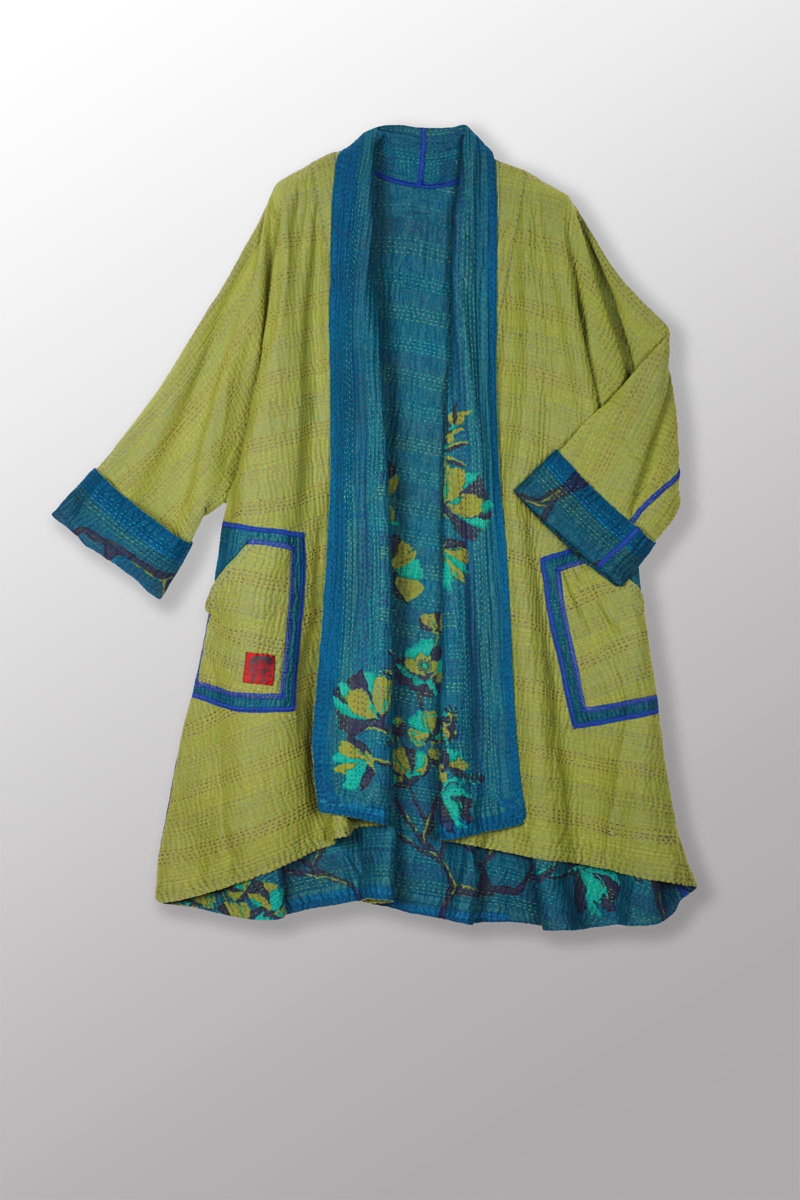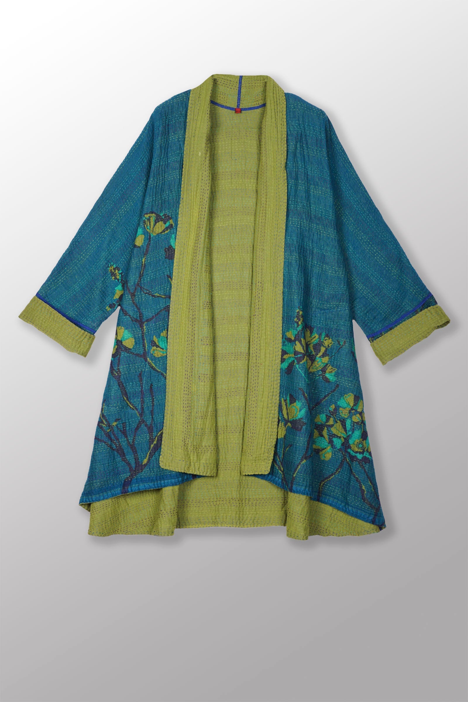 BLOOMING FLOWERS KANTHA KIMONO LONG JACKET - bf4005-blu -