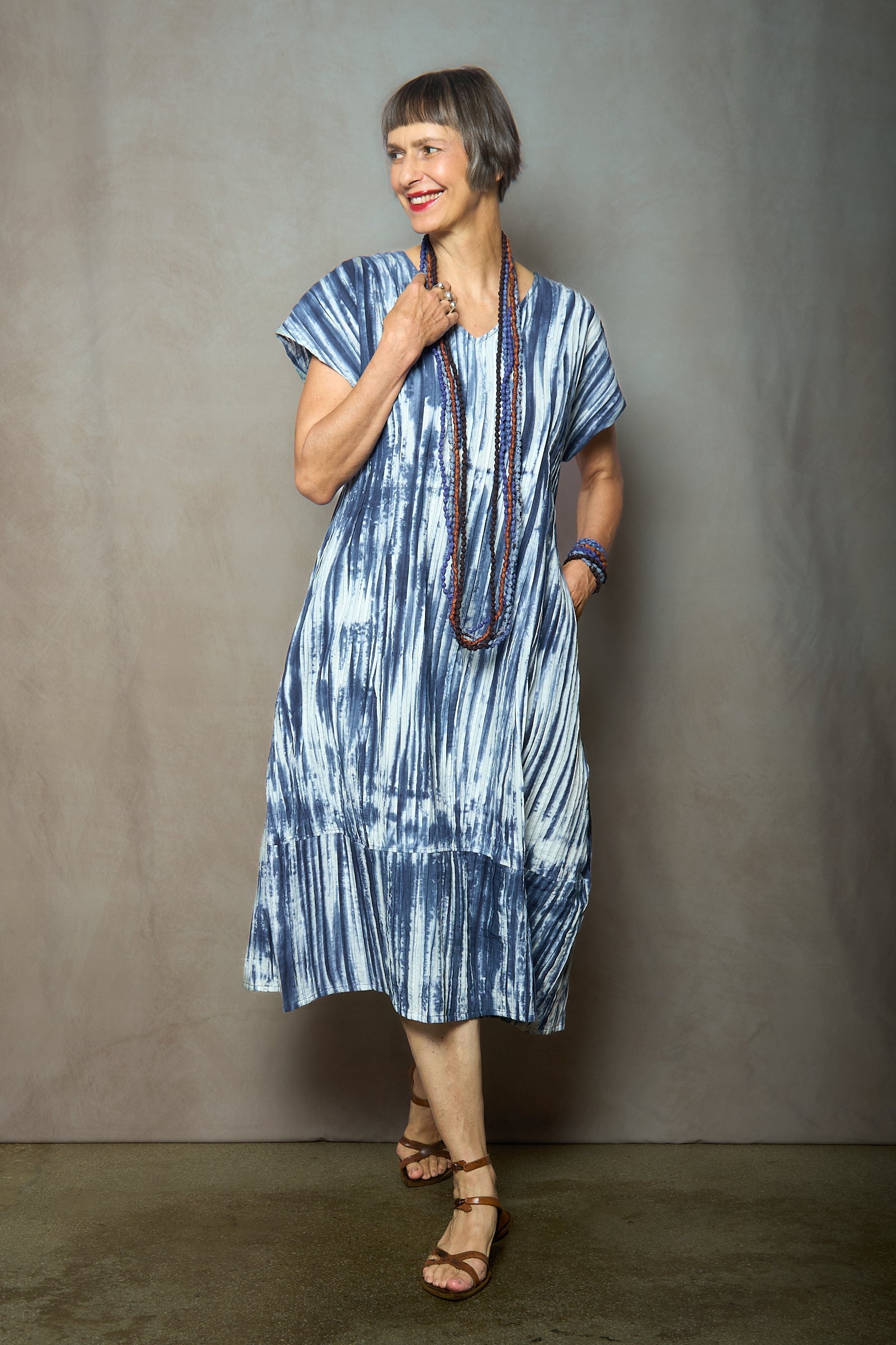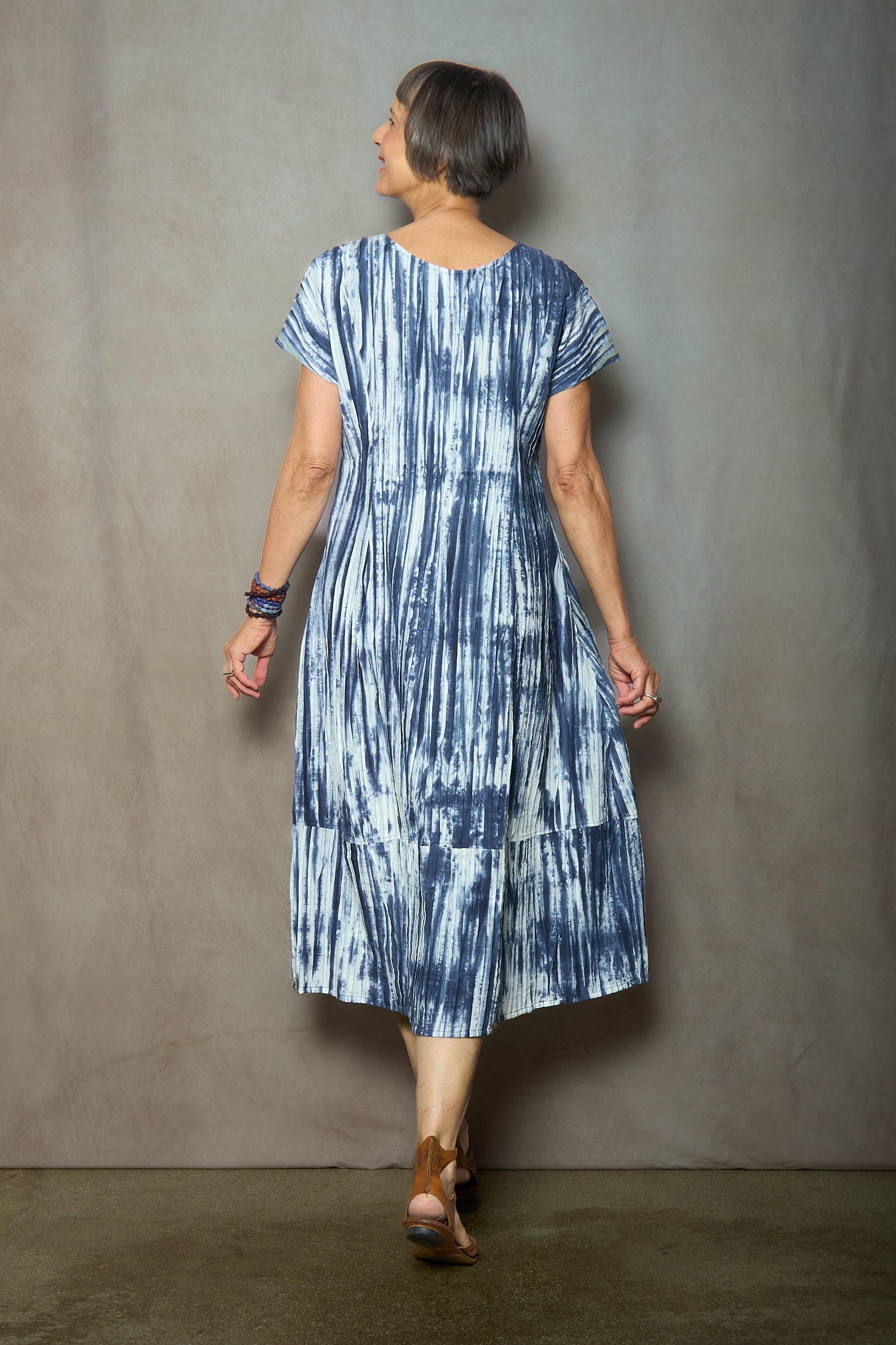 CAMBRIC TIE DYE RIPPLE TUCK V-NECK SHAPED MIDI DRESS - tr1465-blu -