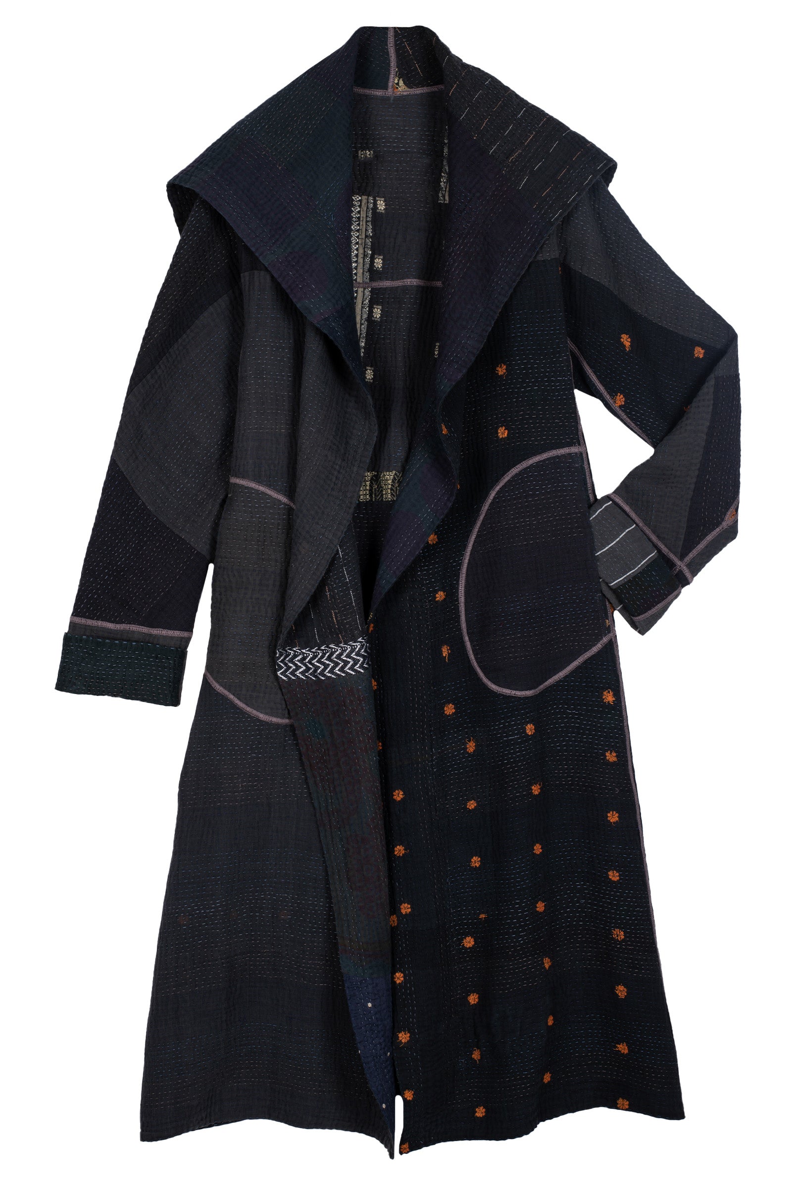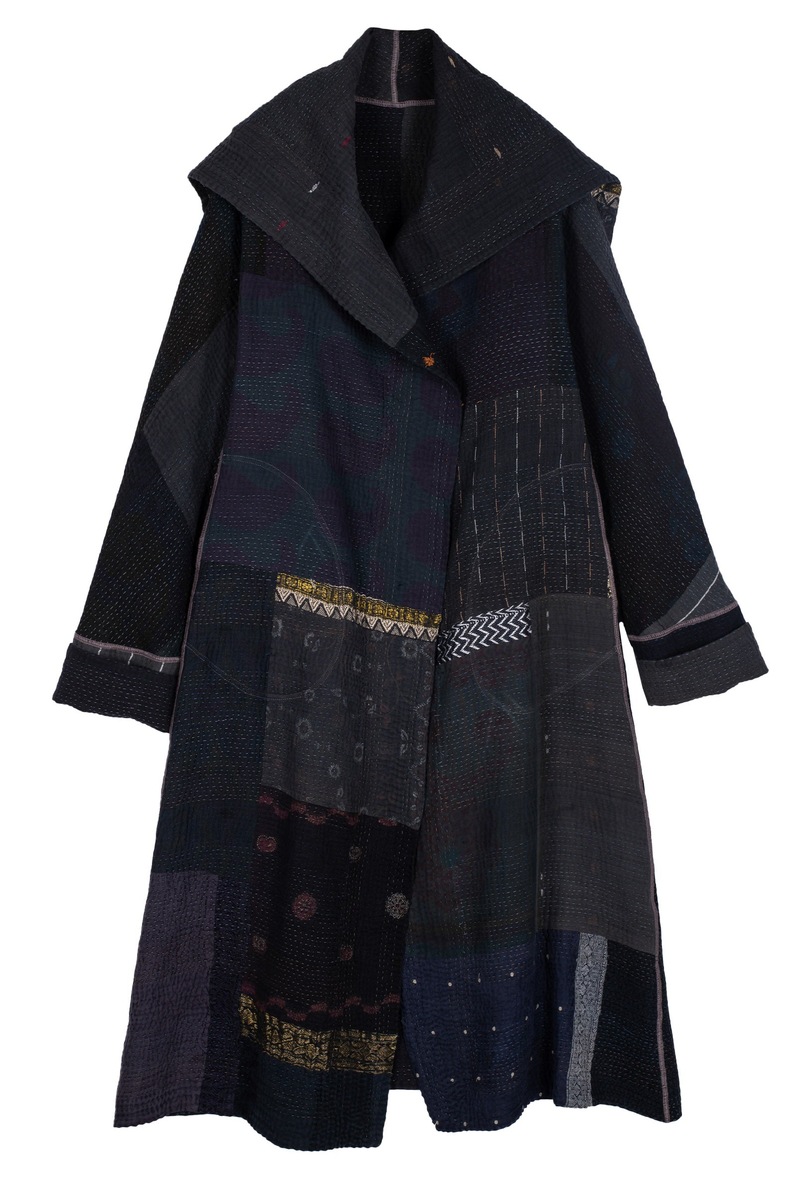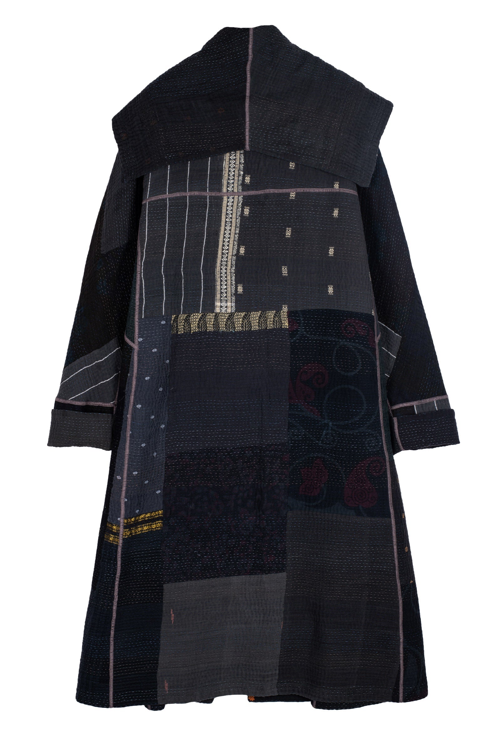 COTTON SILK SW PATCH KANTHA A-LINE LONG COAT - ws4302-blk -