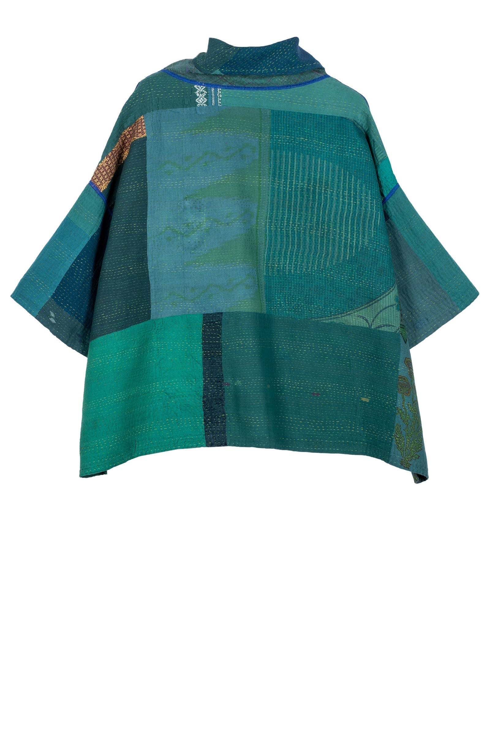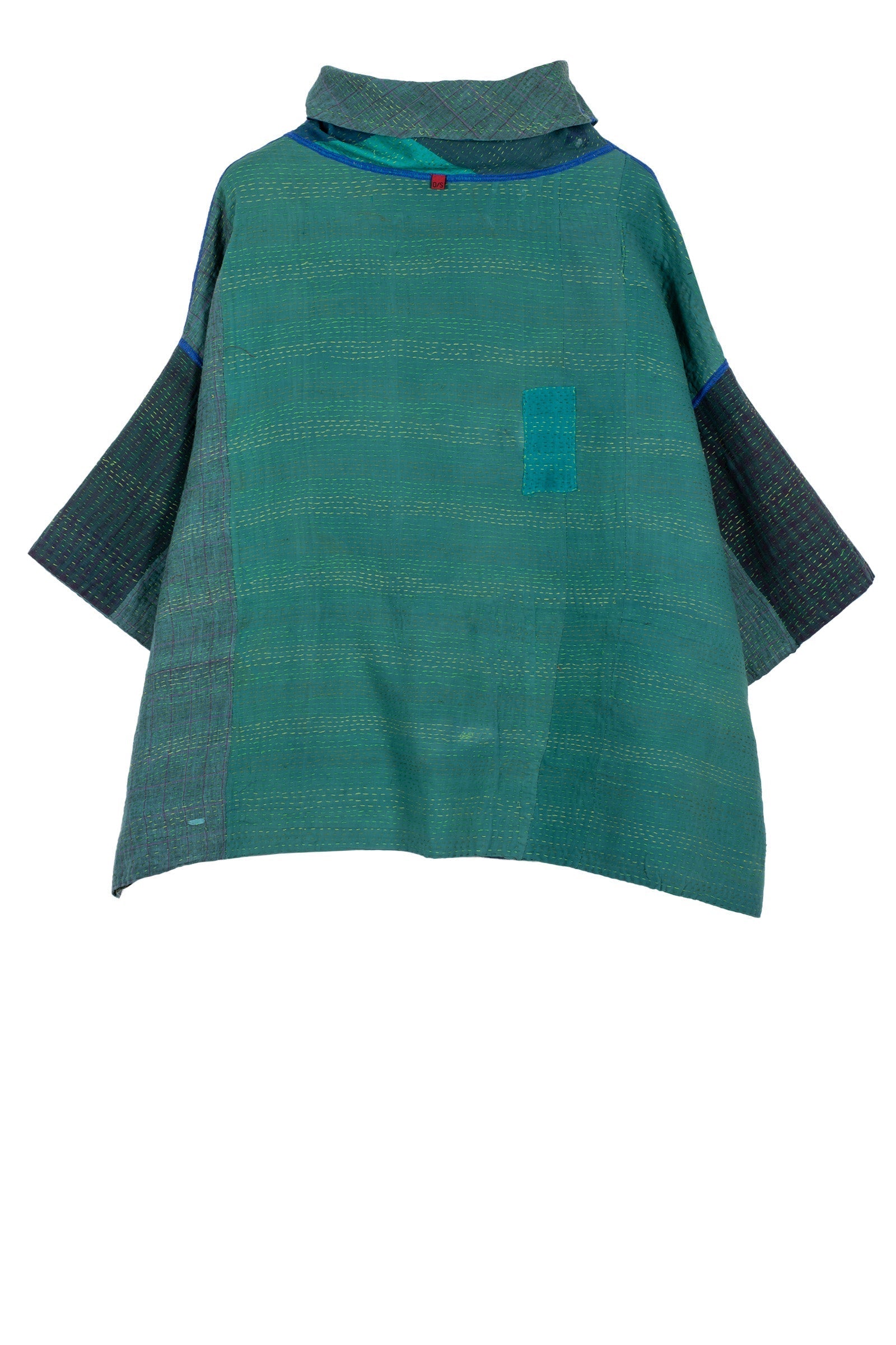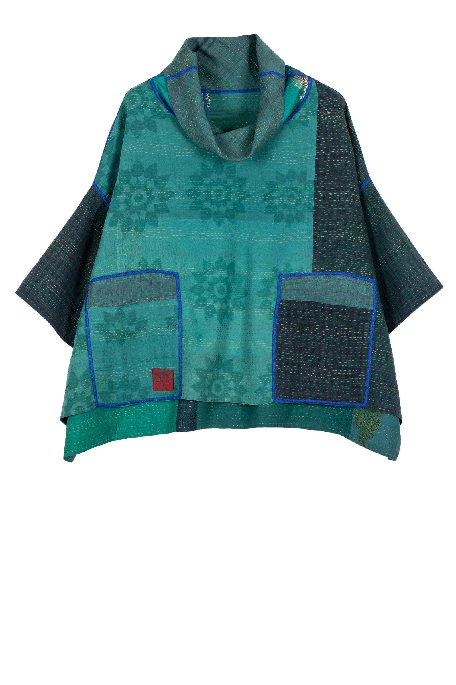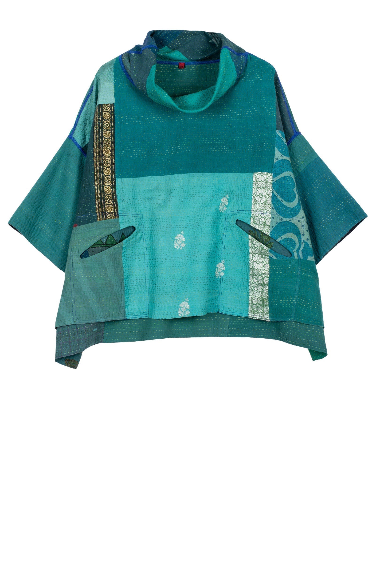 COTTON SILK SW PATCH KANTHA COWL NECK PONCHO - ws2061-tel -