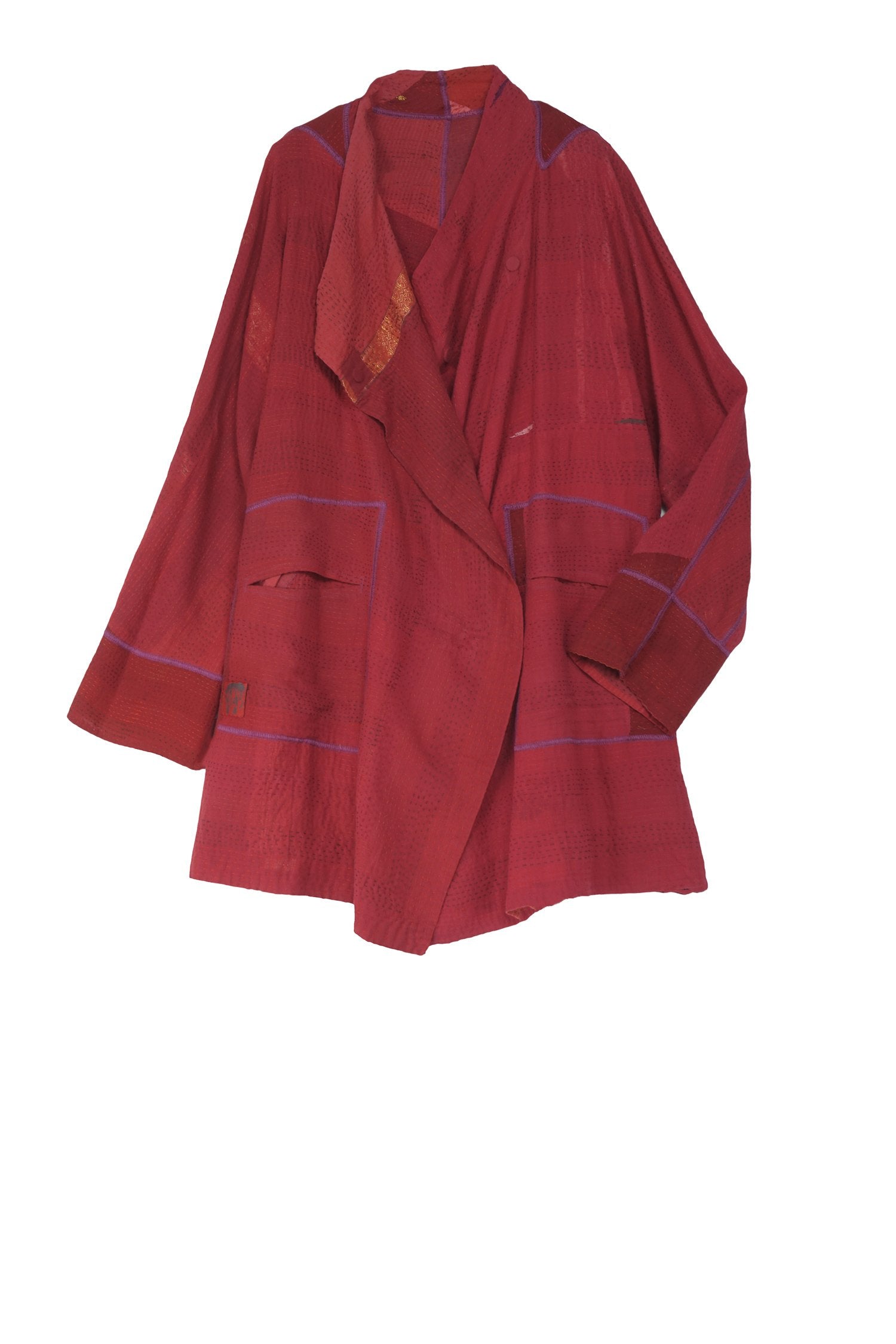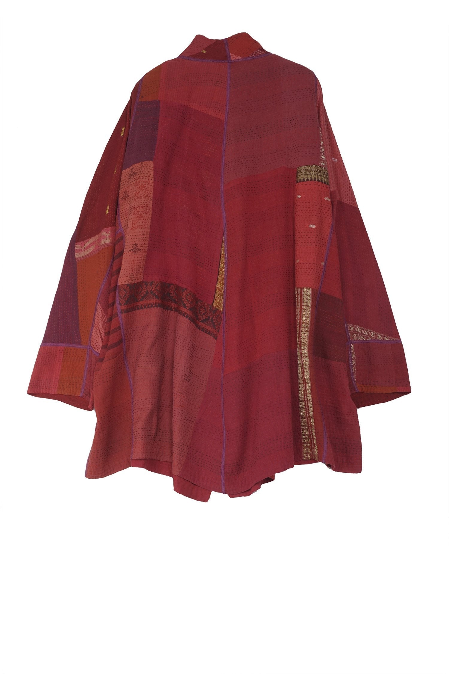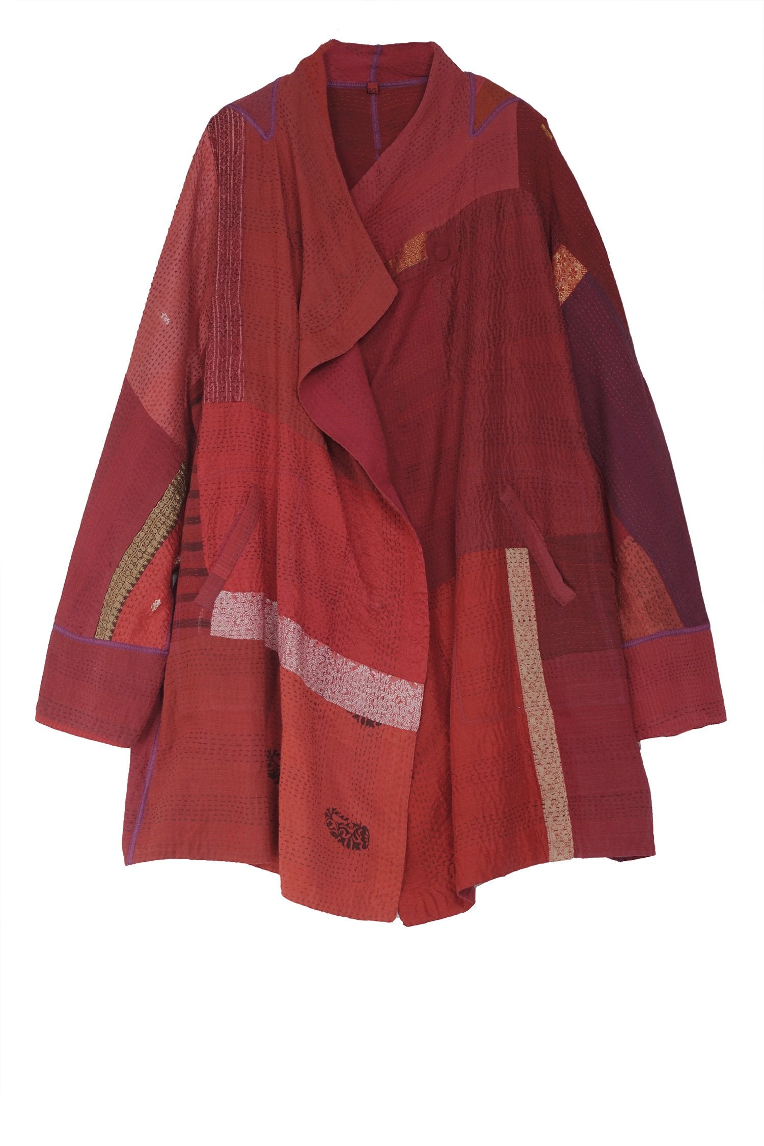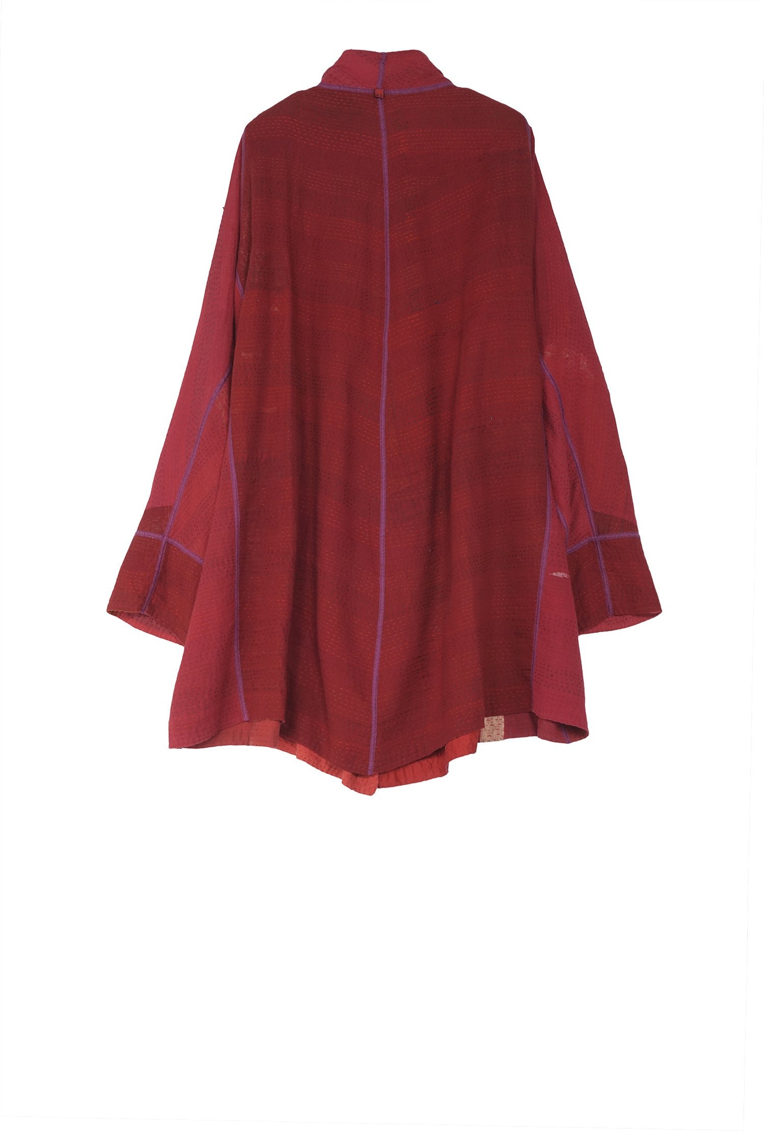 COTTON SILK SW PATCH KANTHA FUNNEL COLLAR COAT - ws2312-red -
