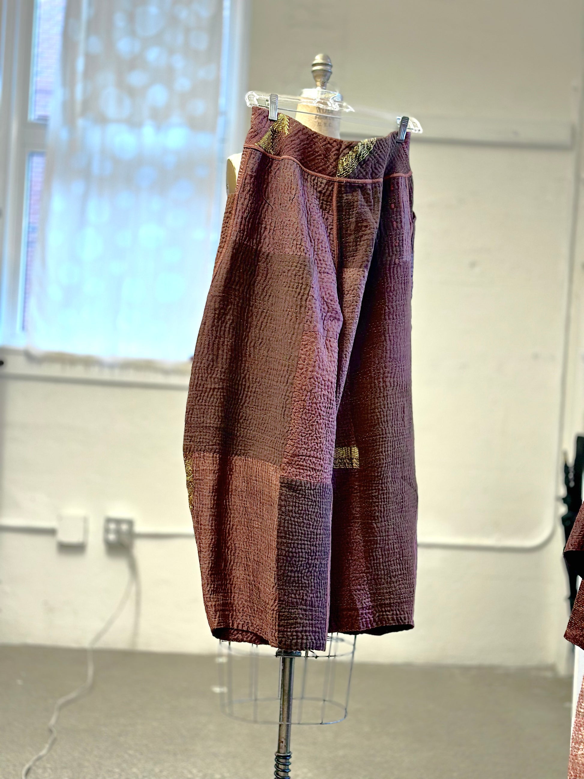 COTTON SILK SW PATCH KANTHA KNEE TUCKED PANTS - ws4625-brn -
