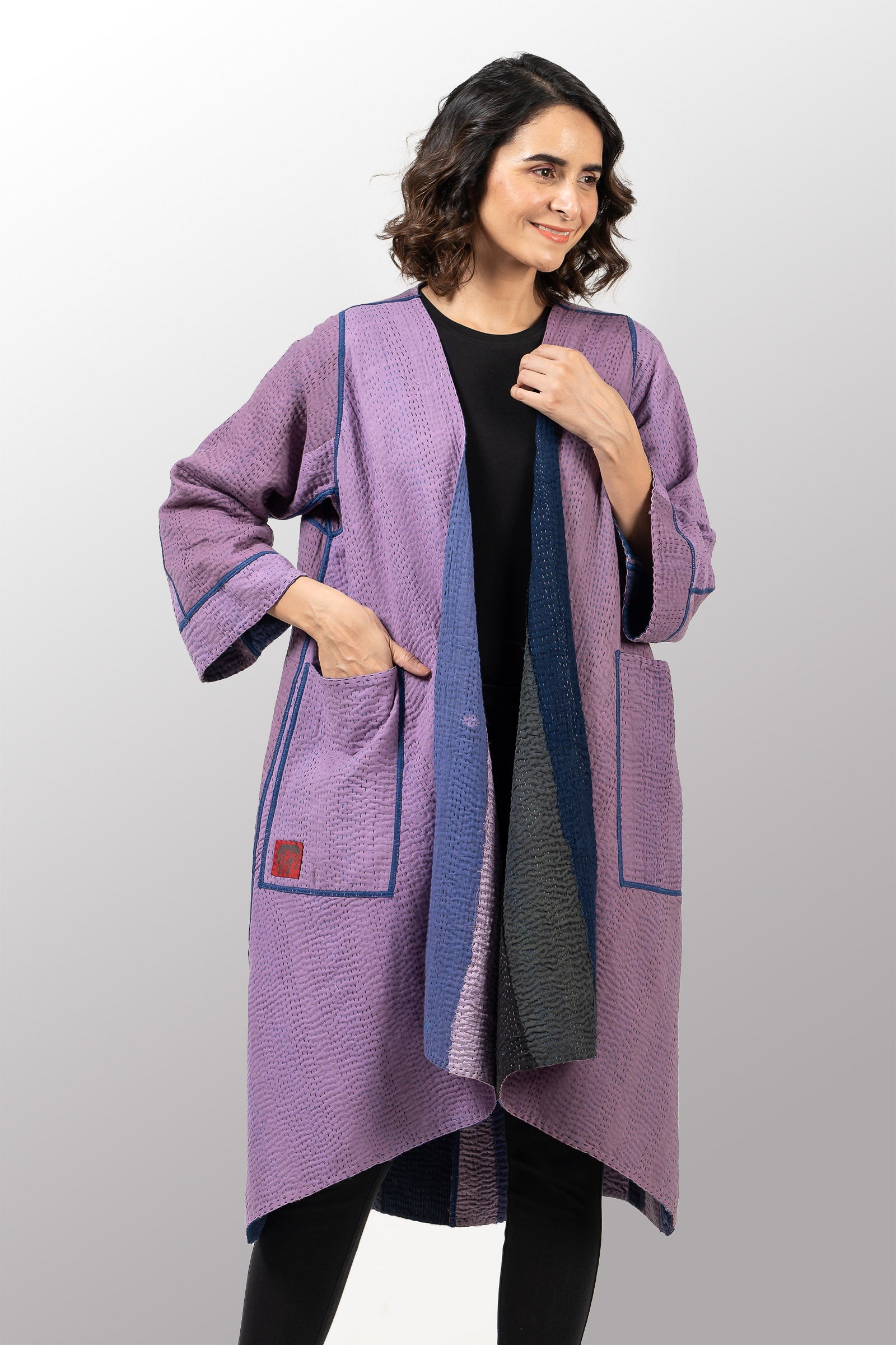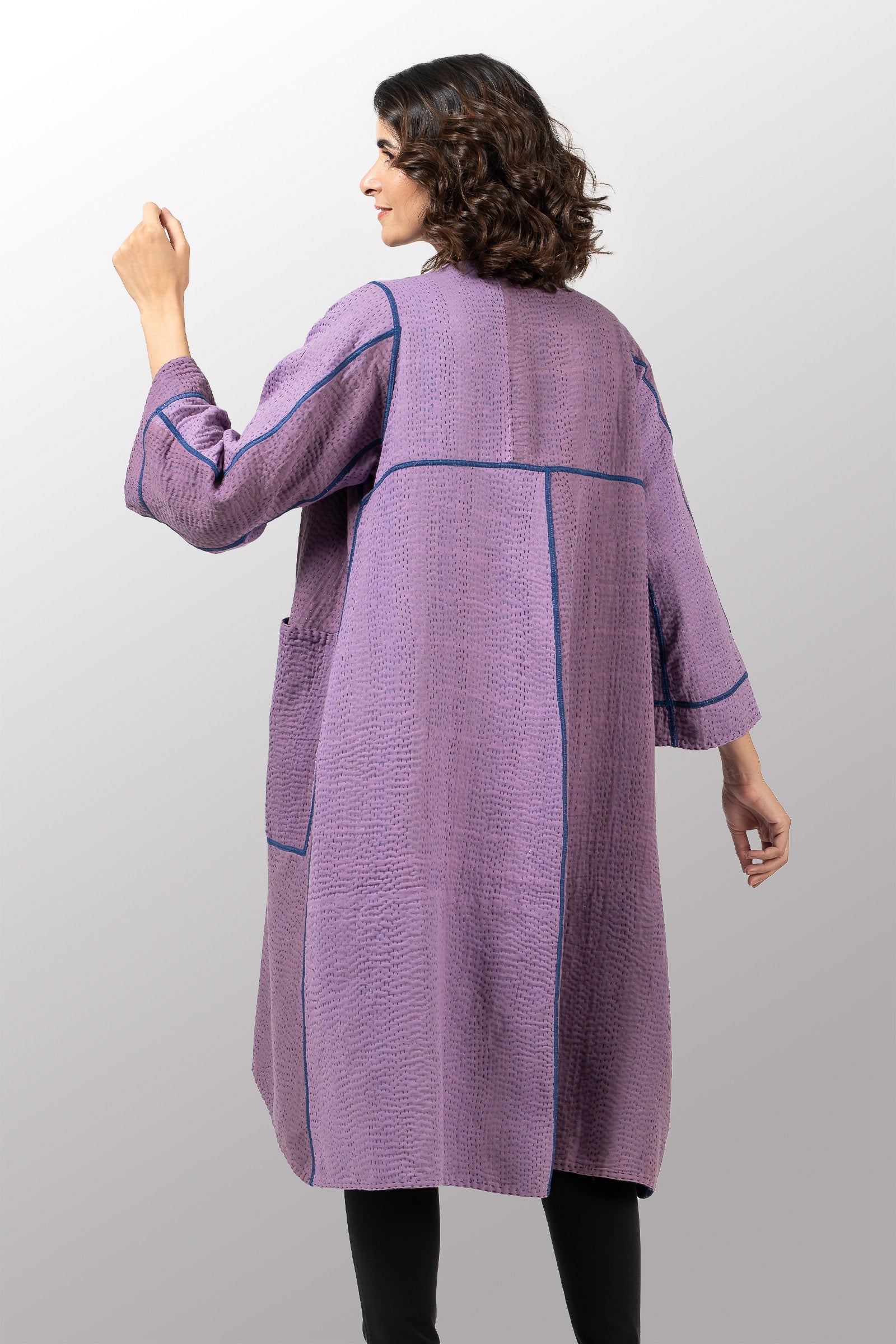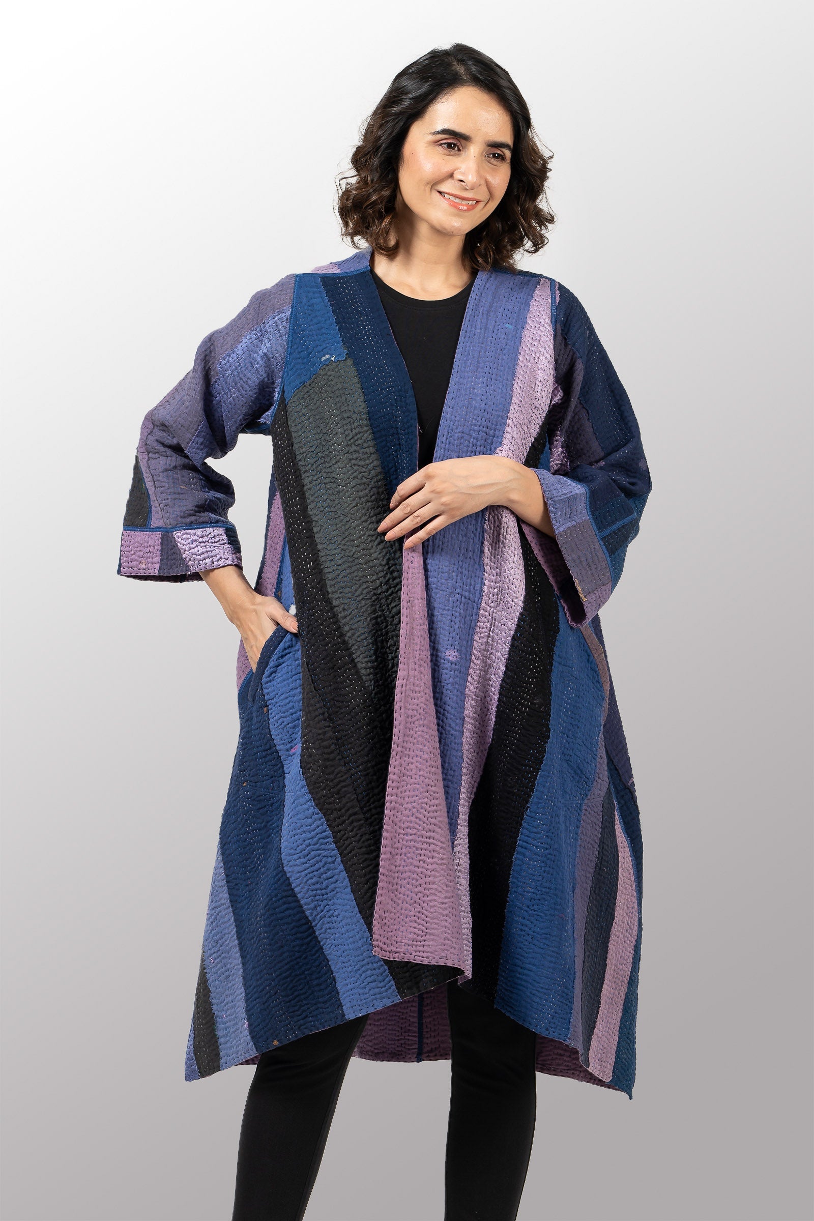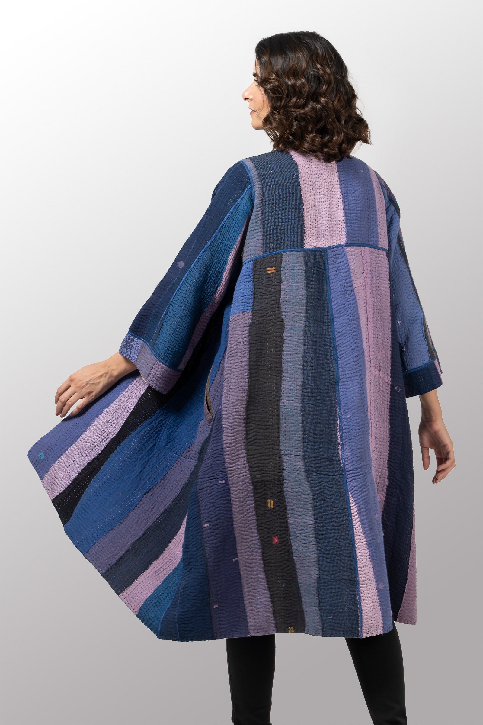 COTTON STRIPE PATCH KANTHA WRAP FLARE COAT - cs4330-prp -