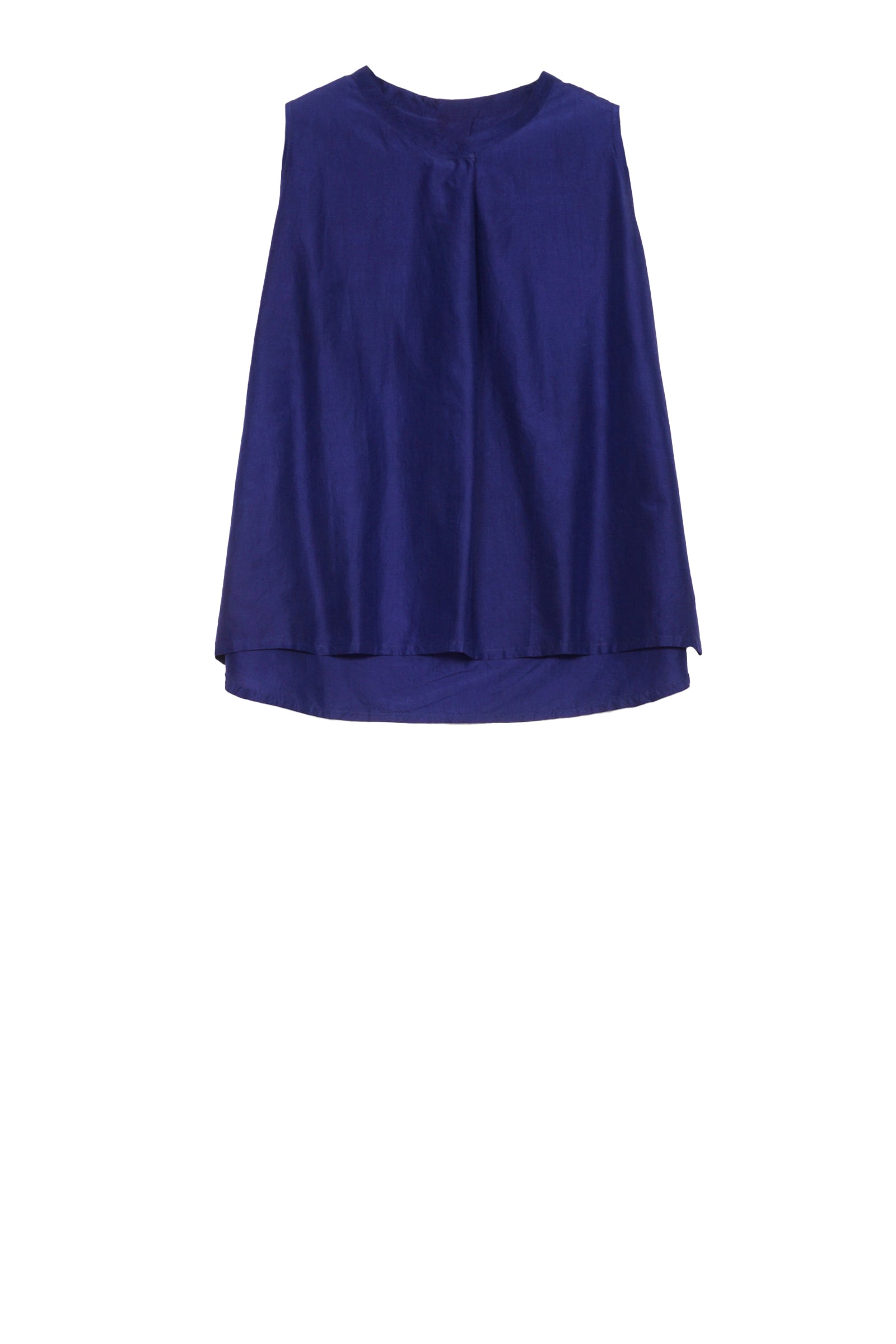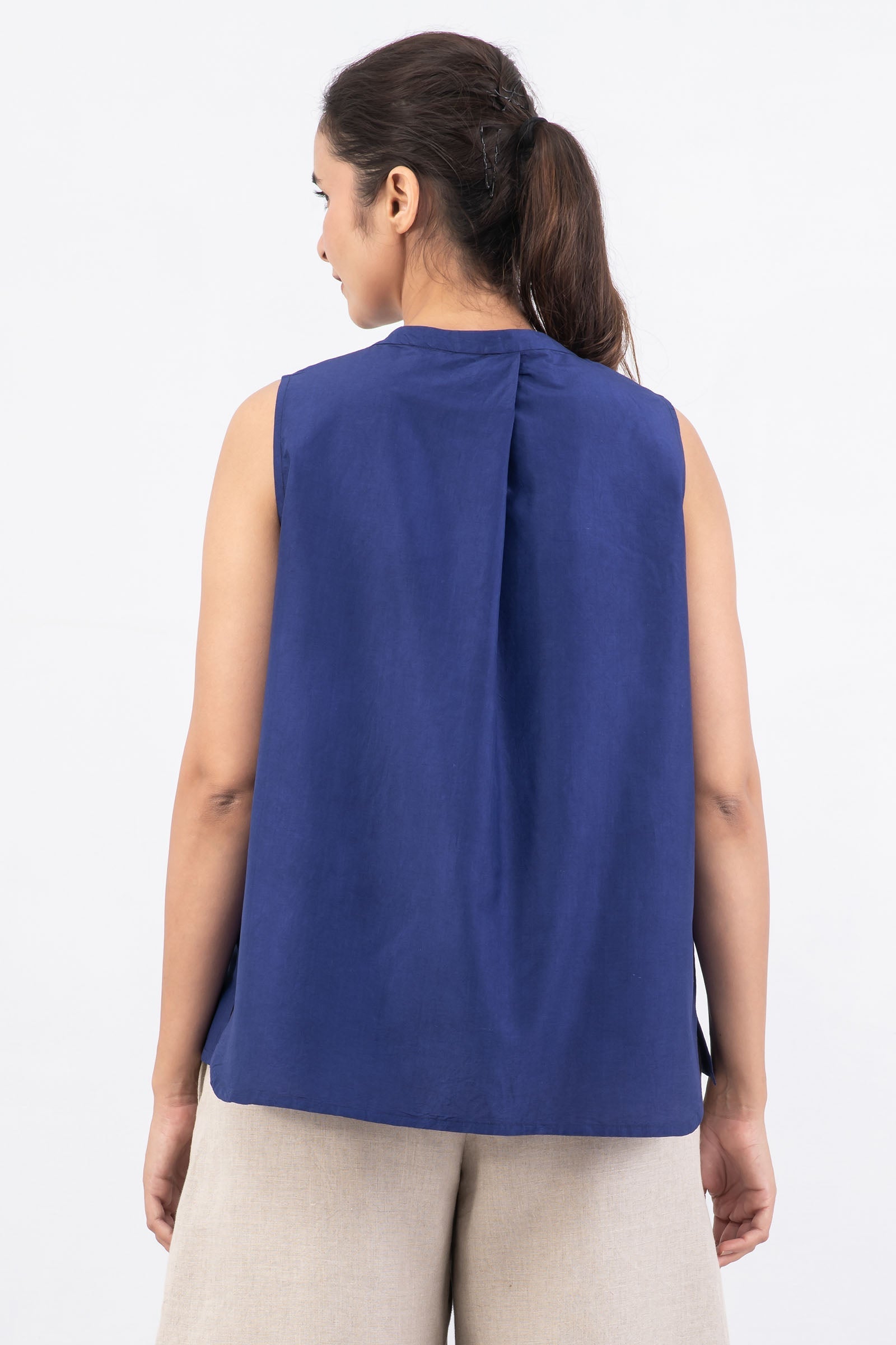 DYED COTTON SILK HEAVY VOILE WAVY BAND COLLAR SHELL TOP - dh1556-blu -